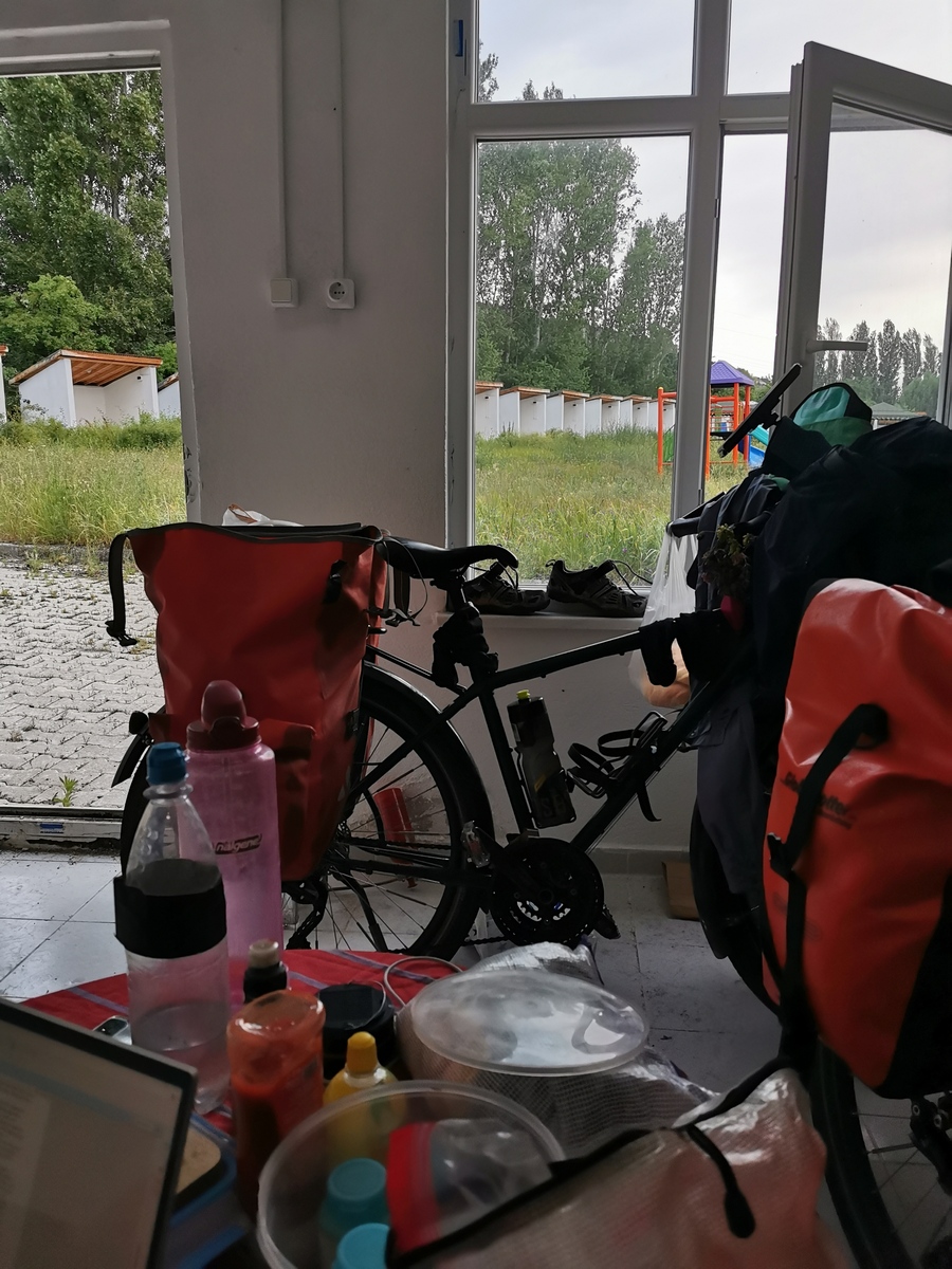 Tilmann inspizierte alles genau, räumte auf, putzte den Boden mit den vorhandenen Putzmitteln und Lappen und so konnten wir unser Lager in diesem Häuschen einrichten und mussten nicht einmal das Zelt aufstellen. Das befürchtete Gewitter fiel dann allerdings doch sehr milde aus und war nach einem 20-minütigen Nieselregen und einem Donnerschlag erledigt. Trotz unserer Bemühungen war es auch nicht wirklich wohnlich in dieser Unterkunft (es roch seltsam nach frischer Wandfarbe und altem Fett) und so legten wir uns früh schlafen, damit wir am nächsten Morgen auch schnell wieder diesen Ort verlassen würden können.