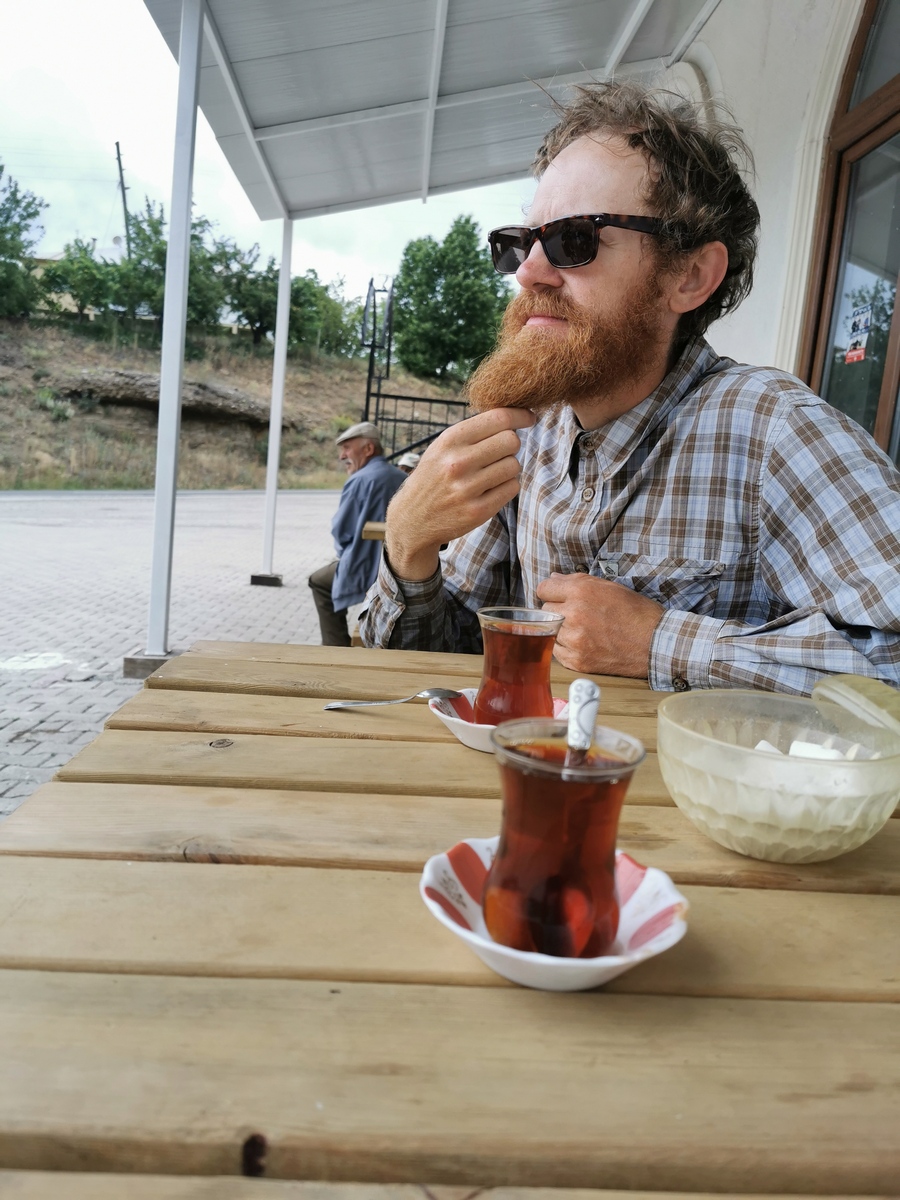 Gut gelaunt wollten wir dann im nächsten Ort den uns winkend angebotenen Cay nicht ablehnen. Als wir uns jedoch in die Tee-Stube setzen, war der Einladende verschwunden und der Wirt wollte bezahlt werden, was uns natürlich nicht in Unkosten stürzte (ein Cay kostet maximal 3 Lira = weniger als 20 Cent). Allerdings ist es schon ziemlicher Unsinn in der Türkei für einen Cay zu bezahlen, da wir spätestens im nächsten Dorf einen für Lau bekommen hätten. Man fragt sich auch ob ernsthaft einer der Stammgäste in den unzähligen Teestuben für seinen Tee bezahlt bzw. wovon die Wirte eigentlich leben.