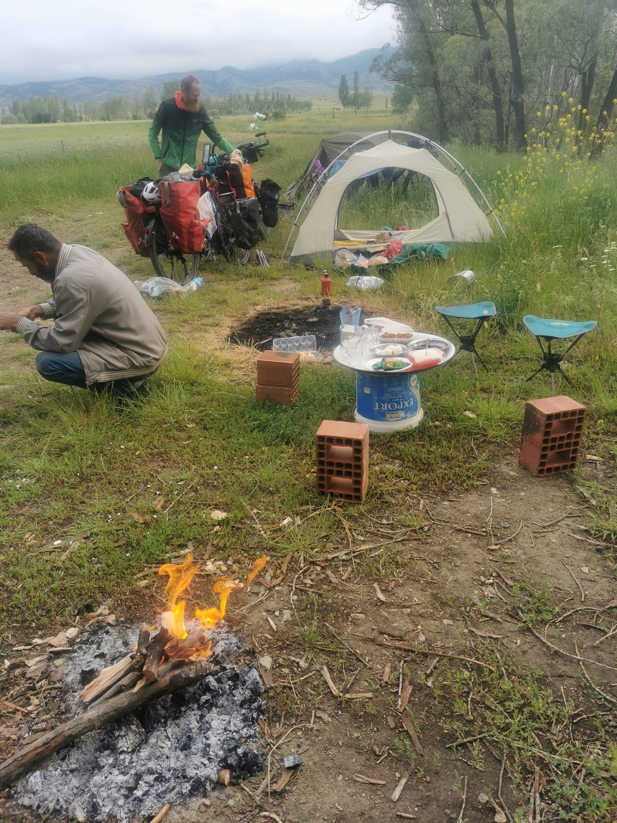 Auf die freudige Wiedervereinigung folgte ein gemeinsames Abendessen und anschließend eine Dusche unter einer lecken Wasserleitung zur Feldbewässerung. Als wir uns aufgrund nachlassender Temperaturen und zunehmender Feuchtigkeit gerade dazu entschieden hatten ins Bett zu gehen, hielt ein Auto dem zwei Männer entstiegen. Während die beiden Damen Ärger vermuteten, erwartete Tilmann nur eine weiter Störung unseres Friedens. Zweiteres traf zu. Es handelte sich um zwei Landwirte, die die angrenzenden Felder bewirtschafteten und die uns unbedingt ein Feuer anzünden wollten. Wir lehnten dankend ab und verwiesen auf unseren Wunsch bald zur Nachtruhe überzugehen. Die beiden jedoch deuteten mit Händen und Füßen und dem Google-Translator an, dass sie Feuerholz mit dem Auto besorgen würden und fuhren wieder davon.