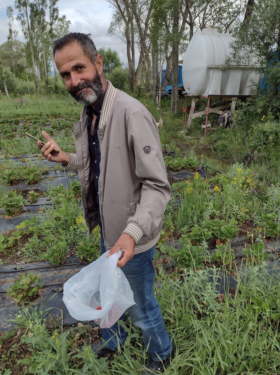 Selbstverständlich war es damit aber noch nicht getan in Sachen Gastfreundschaft. Unsere Gäste, deren Gäste wir eigentlich waren, kündigten am nächsten Morgen zum Frühstück wieder zu kommen, was sogar deutlich vor der vereinbarten Zeit in die Tat umgesetzt wurde. Neben dem obligatorischen Cay wurden gekochte Eier, getrocknete Maulbeeren, Ekmek und Traubenmelasse gereicht, wir steuerten Gurken, Tomaten und unser eigenes Ekmek bei. Schließlich durfte Tilmann noch mit einem der beiden sein Erdbeerfeld besuchen und sich reichlich bedienen. Für ein Kilo Erdbeeren, so der Landwirt, bekommt er auf dem Markt 30 Lira (ca. 1,80 Eur).