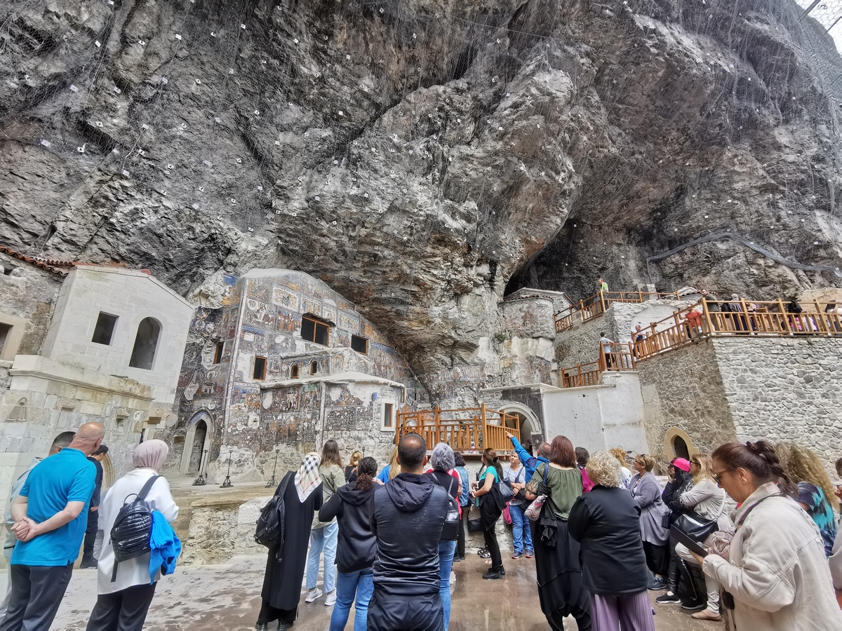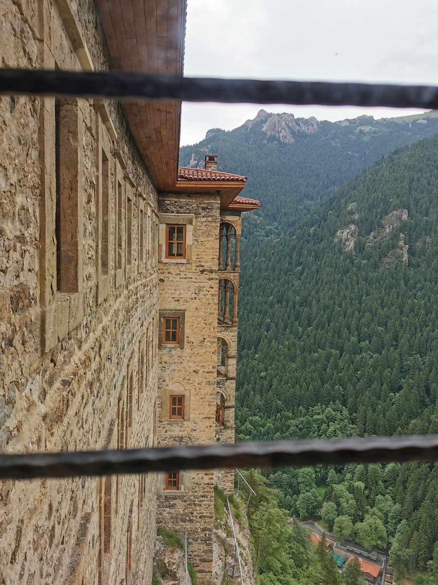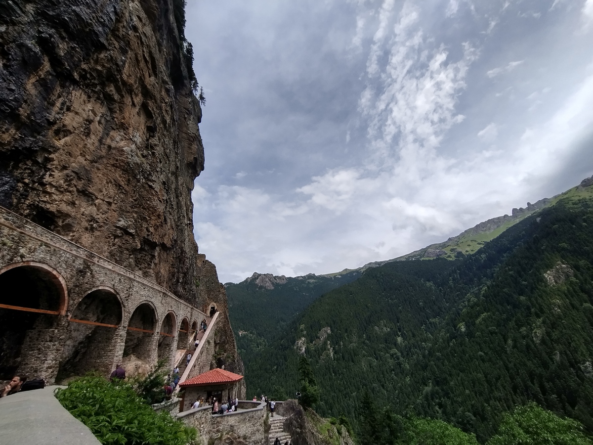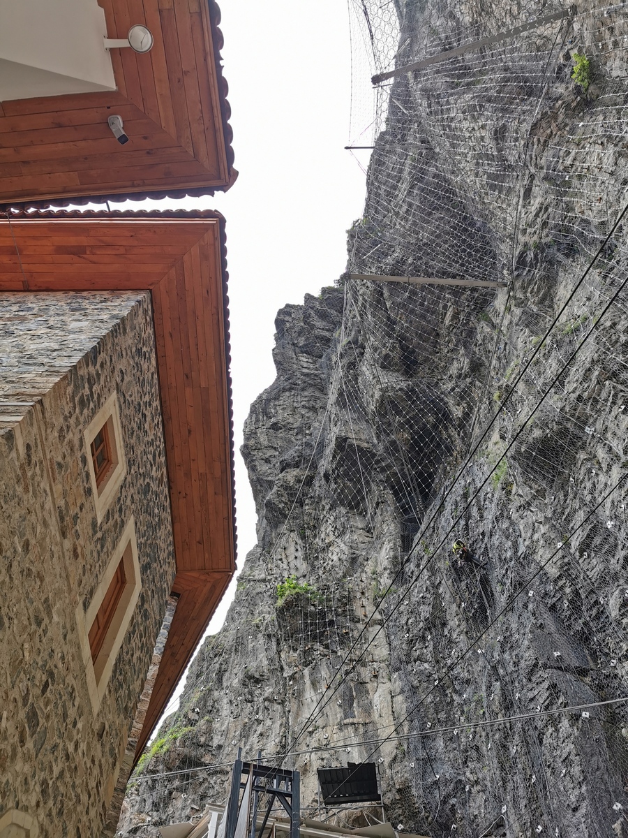 Das Kloster war genauso beeindruckend anzusehen, wie wir erhofft hatten, auch wenn die Fotos wegen des grauen Himmels nicht so gelungen sind, wie gewünscht. Der Anblick von unten hinauf in die Felswand, in der das Kloster thront, war spektakulärer, als das Kloster von innen zu besichtigen und das nicht nur wegen den ganzen anderen Touristen, die sich unhöflich in den engen Räumen vordrängelten. Ein Teil der Innenräume war nicht zugänglich wegen Renovierung und die alten Fresken aus dem frühen 18. Jahrhundert sind stark beschädigt, obgleich die Farbe nach so langer Zeit immer noch einen vollen Ton aufweist. Ebenso absurd, wie der Ort, an dem das Kloster erbaut wurde, ist die Absicherung, die heutzutage vorgenommen wird, um Steinschläge von der Felswand über dem Kloster zu verhindern. Mehrere Kletterer sind dort beschäftigt, um diese Absicherung stetig nachzubessern. Als echte Touristen, die wir an diesem Tag waren, gönnten wir uns im Museumsshop einen Kaffee, der für türkische Verhältnisse ausgezeichnet war und genossen den Anblick auf die Bergwelt der Schwarzmeer-Region. Zurück auf dem Campingplatz verbrachten wir den Rest des Tages mit Faulenzen, Yoga, Biertrinken, Quatschen und mit Two-Face Dragonhead zu kuscheln.