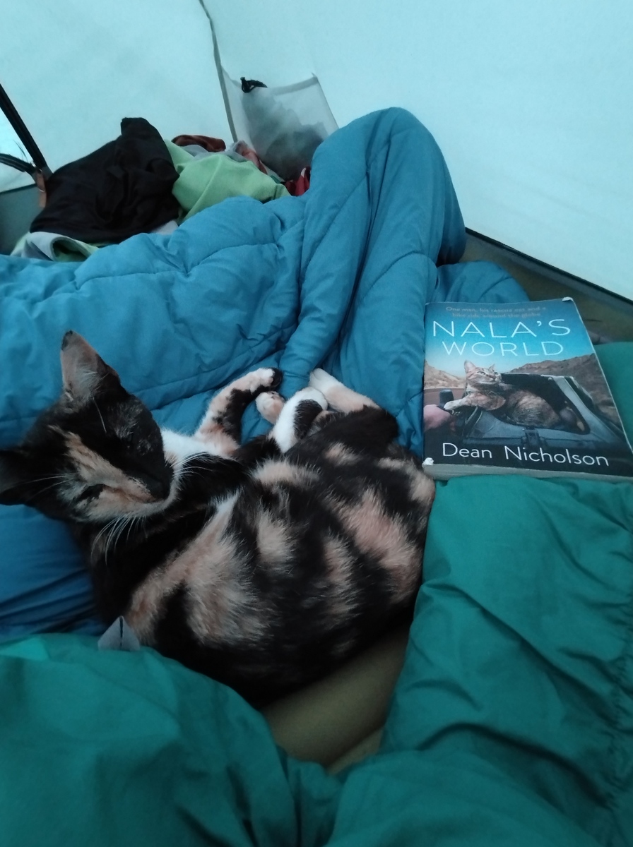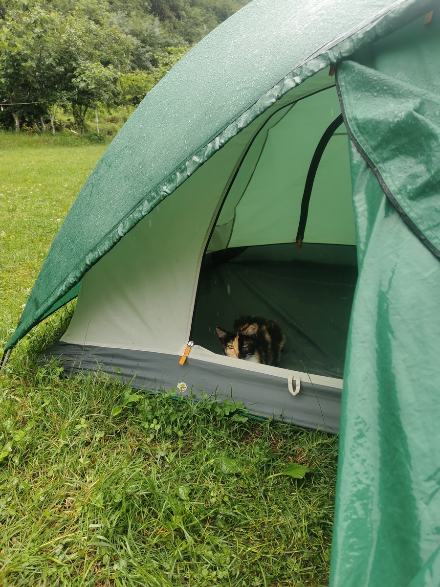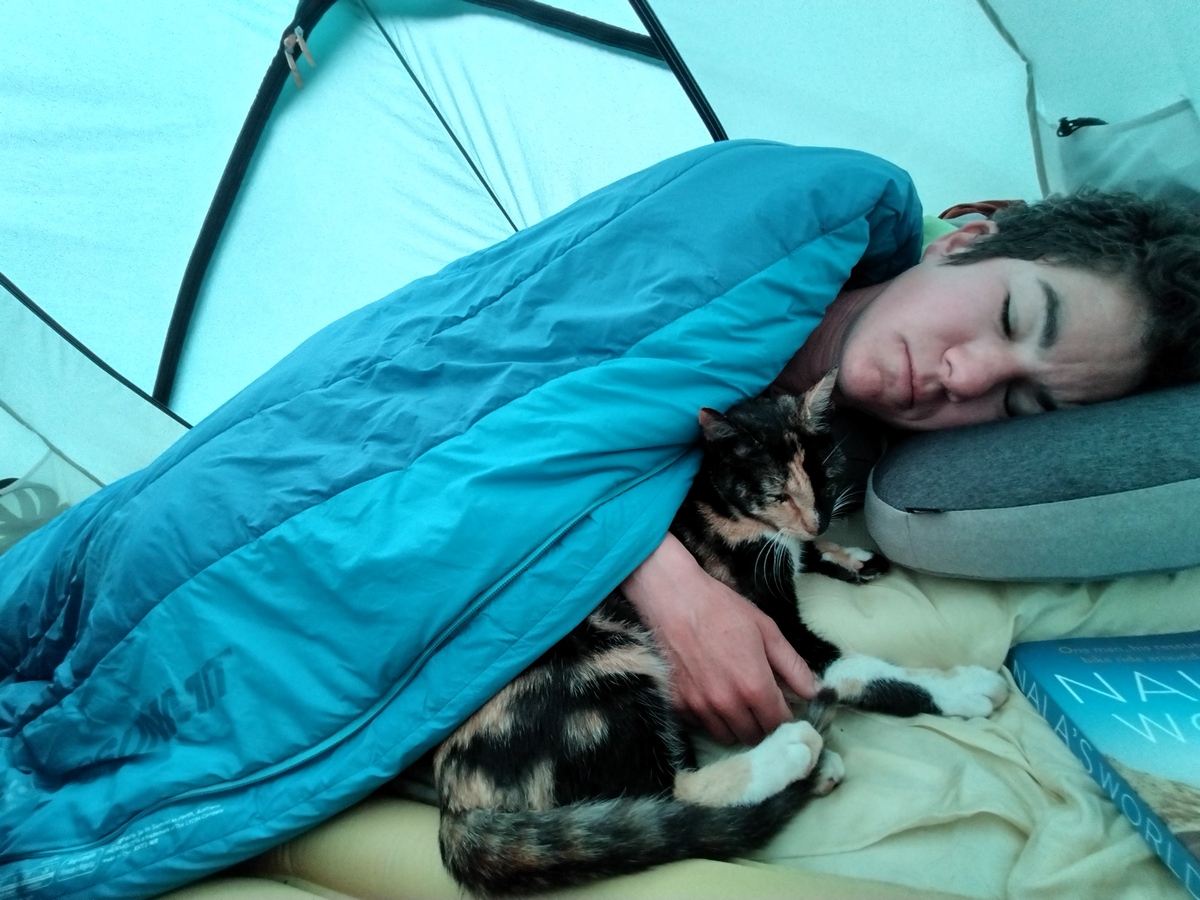 Am nächsten Morgen erwachte Julia von einem seltsamen Geräusch, sie blickte an die Zeltdecke und sah über sich vier Pfoten. Sie brauchte einen Augenblick, um zu begreifen: Two-Face hatte es sich in der Zwischenwelt zwischen Außen- und Innenzelt gemütlich gemacht. Julia weckte Tilmann, um ihre Entdeckung zu teilen, dieser sah bereits das Innenzelt durch scharfe Krallen in 1.000 Fetzi-Fetzen zerlegt. Deshalb öffnete Julia schnell das Innenzelt, um sich die Katze zu schnappen. Diese war höchst erfreut, dass sie ihre neuen Freunde nun geweckt hatte und erweichte gleich Julias Herz, die sie dann ins Zelt schlüpfen ließ, nicht ohne Angst, die Krallen könnten die Luftmatratzen durchlöchern. Doch eine echte Campingplatz-Katze weiß natürlich was sich gehört und ließ das gute Camping-Equipment unversehrt, rollte sich einfach am Fußende ein und schnurrte die beiden Fahrradfahrer noch einmal in den Schlaf.
