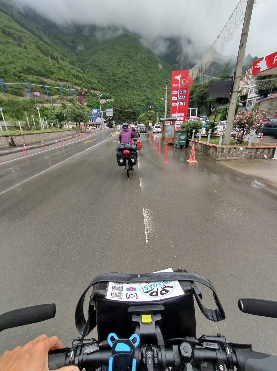 Am nächsten Morgen mussten wir aufgrund der fehlenden Brücke den Staudamm noch einmal umrunden, um wieder auf die Schnellstraße Richtung Trabzon zu gelangen und gleich ging es wieder bergauf, diesmal lang, sehr sehr lang, denn um an das Schwarze Meer zu gelangen mussten wir noch die Kalkanli-Berge überqueren. Unser Dreiergespann wurde zunächst in die Länge gezogen und zerfiel dann nach kurze Zeit in drei Einzelkämpfer. Die stark befahrene Straße wurde schmaler, ließ aber noch genug Platz zwischen uns und den vorbeifahrenden LKW auf der einen und uns und dem Abgrund auf der anderen Seite. Tilmann nutzte die Zeit, um mittels Internetrecherche und Taschenrechner zu ermitteln wie viel teurer das Kochen mit Gas im Vergleich zu Benzin ist (das unerfreuliche Ergebnis haben wir bereits in einem der vergangenen Beiträge mitgeteilt) und postete einige Insta-Stories, um unsere Follower über den dramatischen Anstieg auf dem Laufenden zu halten.