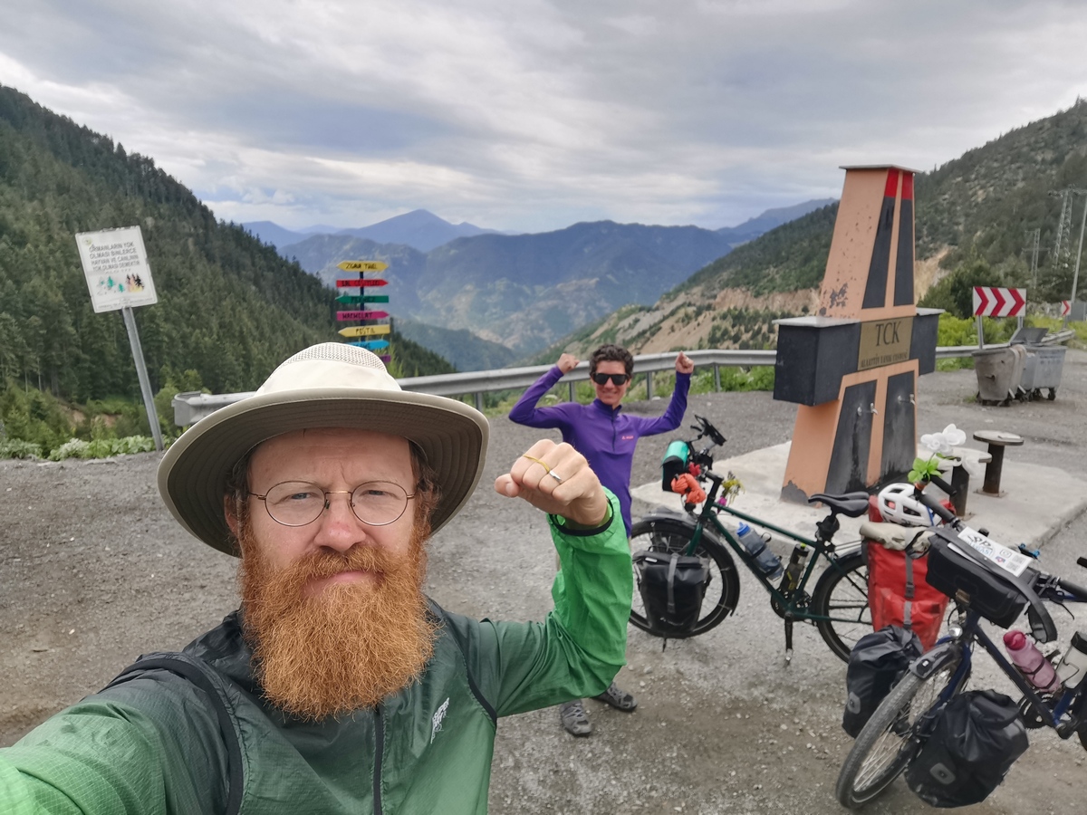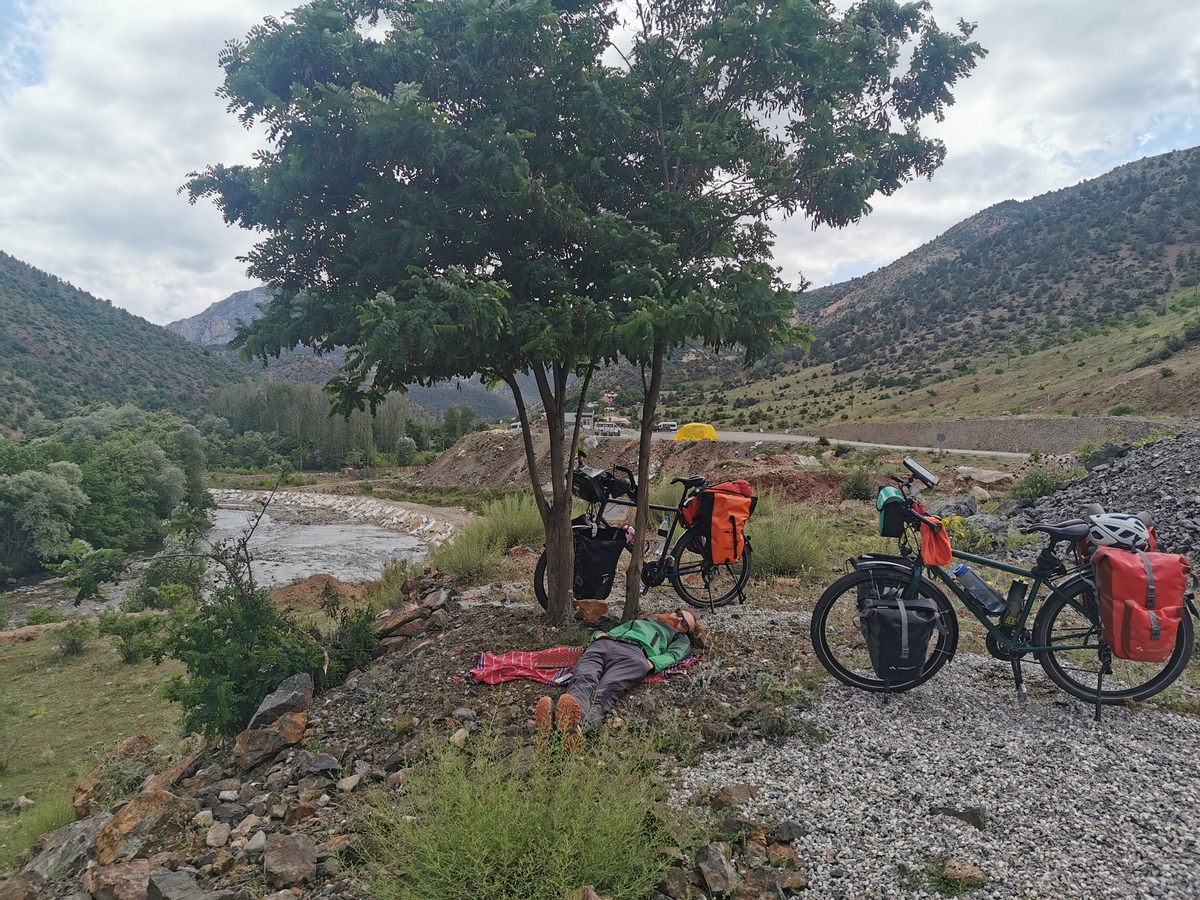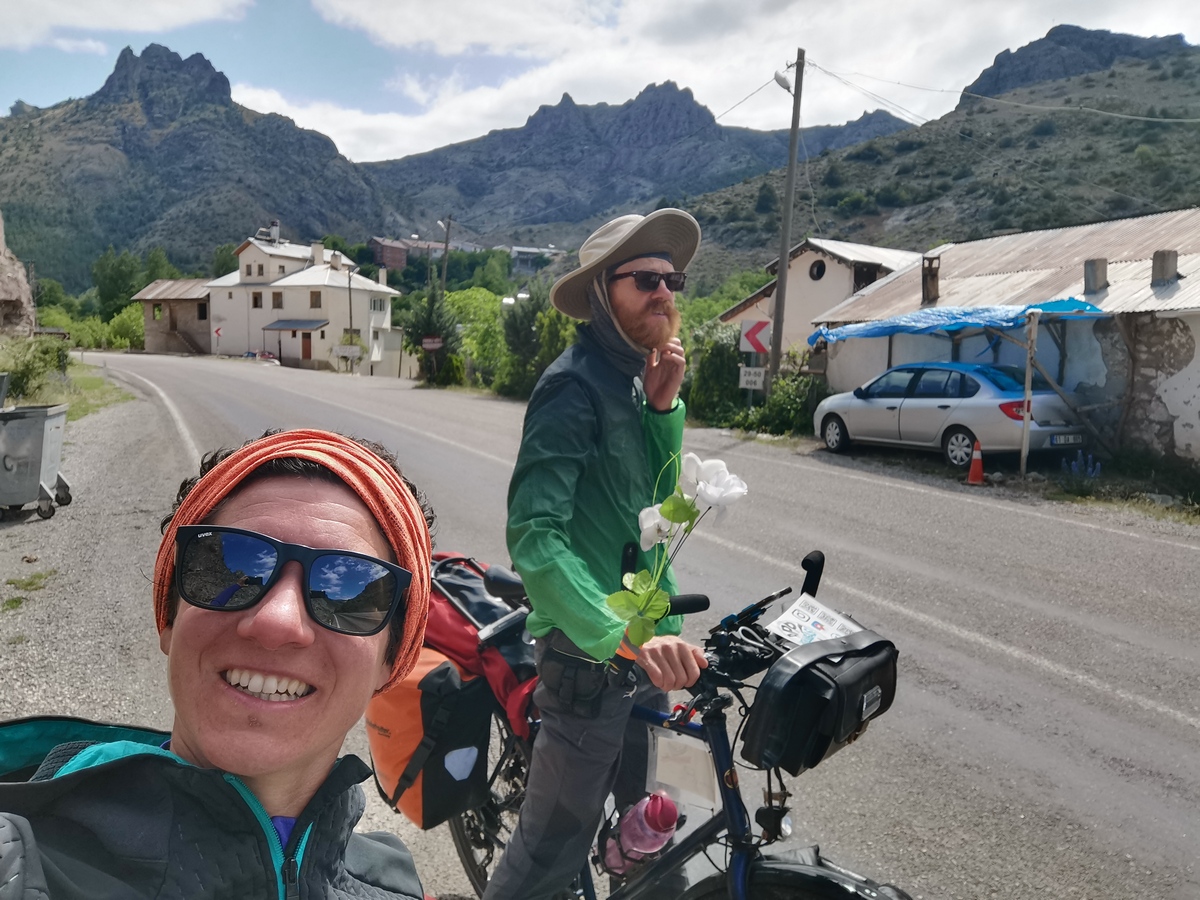 Gemeinsam starteten Kathrin, Julia und Tilmann am 23. Juni und damit am Tag 82 unserer Reise. Doch nach nur wenigen Kilometern durch mittlerweile an den Schwarzwald erinnernde Berglandschaft, hatten wir Kathrin aus den Augen verloren. Wir erklommen mal wieder einen 2.000-Meter-Pass, den Tersun-Dagi-Pass, und es wurde langsam alpin. Für die Abfahrt entschieden wir uns einen kleinen unbefestigten Waldweg zu nehmen, der einige Herausforderungen zu bieten hatte und uns über etliche Serpentinen in ein hübsches Tal führte. Es war nun nicht mehr schlicht alpin, wir hatten das Gefühl in die Voralpen teleportiert worden zu sein. Die Temperaturen waren in den letzten Tagen bereits stark gefallen und hier oben war es nochmal kälter, sodass wir tatsächlich noch einmal genötigt waren, die Jacke und Handschuhe auszupacken, womit wir nicht mehr gerechnet hatten für die nächsten Monate. Als wir an Höhenmeter verloren, wurden die Tannen abgelöst von rötlichen Felsen und schon hatte uns der Teleporter aus den Alpen zurück nach Anatolien katapultiert. Als wir wieder auf die Landstraße stießen und die Datenverbindung wieder stabil war, stellte sich heraus, dass sich eine Speiche von Kathrin verabschiedet hatte, die sie mit Panzertape provisorisch geflickt hatte und uns nun wieder auf den Fersen war. Allerdings wählte sie den längeren aber nicht so holprigen Weg über die Hauptstraße.