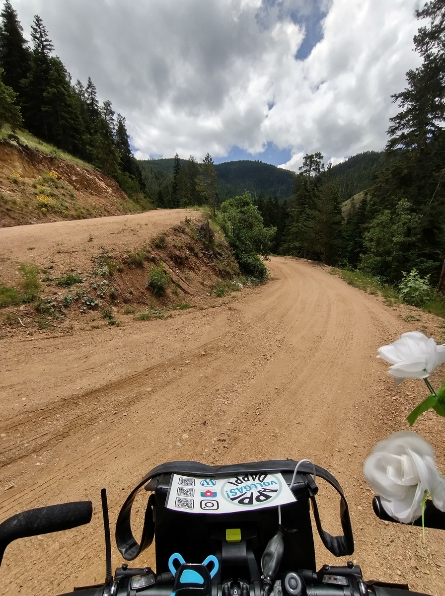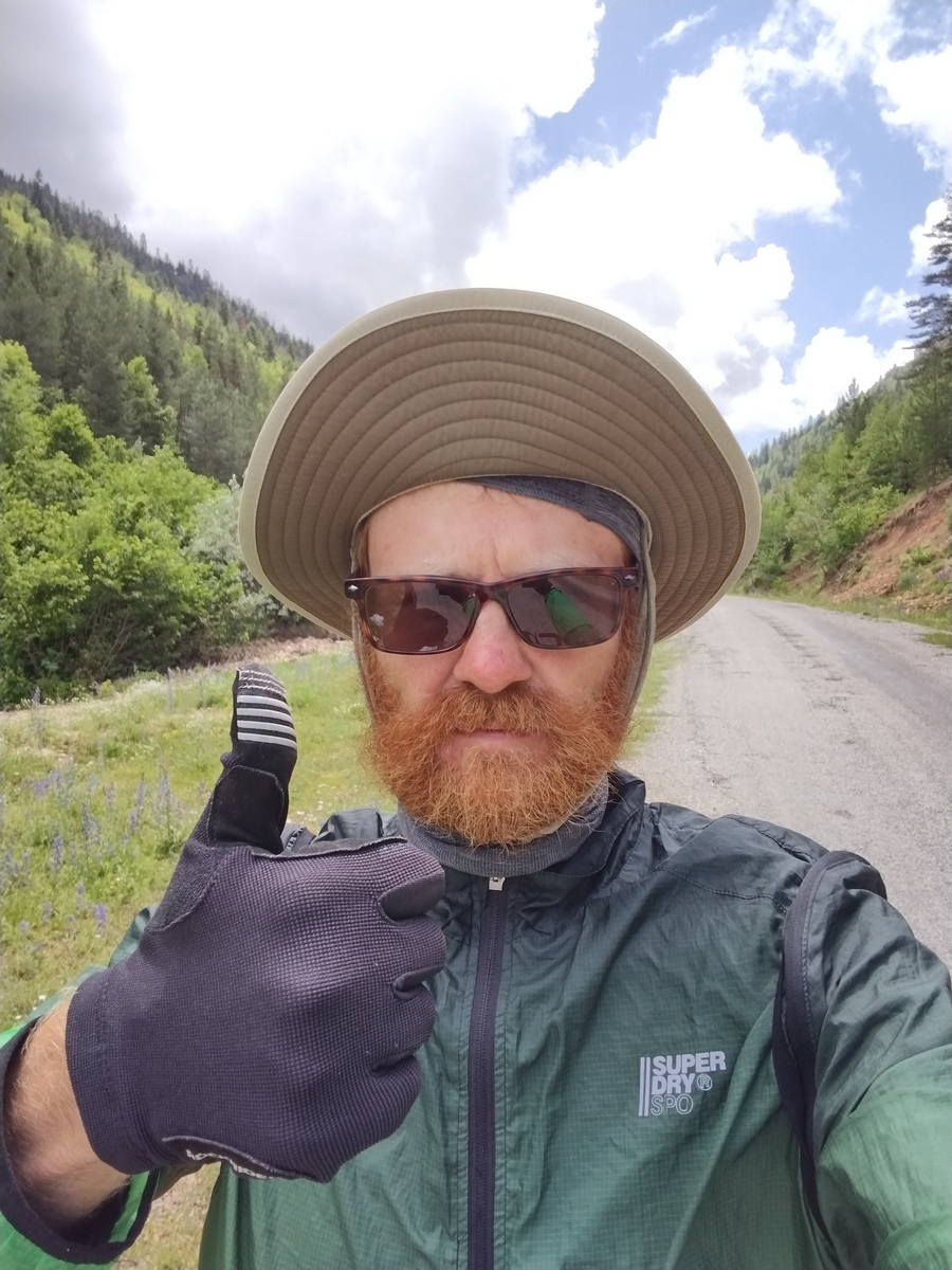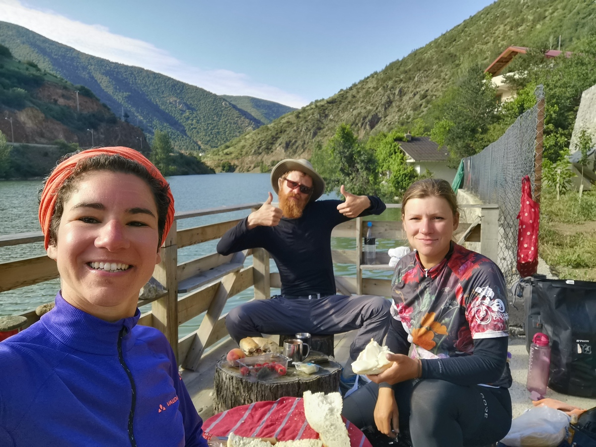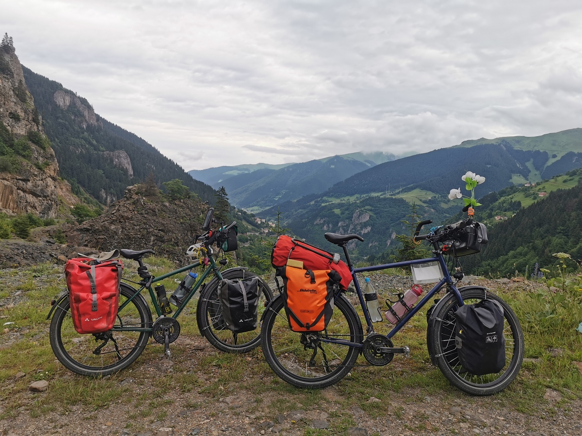 Gemeinsam starteten Kathrin, Julia und Tilmann am 23. Juni und damit am Tag 82 unserer Reise. Doch nach nur wenigen Kilometern durch mittlerweile an den Schwarzwald erinnernde Berglandschaft, hatten wir Kathrin aus den Augen verloren. Wir erklommen mal wieder einen 2.000-Meter-Pass, den Tersun-Dagi-Pass, und es wurde langsam alpin. Für die Abfahrt entschieden wir uns einen kleinen unbefestigten Waldweg zu nehmen, der einige Herausforderungen zu bieten hatte und uns über etliche Serpentinen in ein hübsches Tal führte. Es war nun nicht mehr schlicht alpin, wir hatten das Gefühl in die Voralpen teleportiert worden zu sein. Die Temperaturen waren in den letzten Tagen bereits stark gefallen und hier oben war es nochmal kälter, sodass wir tatsächlich noch einmal genötigt waren, die Jacke und Handschuhe auszupacken, womit wir nicht mehr gerechnet hatten für die nächsten Monate. Als wir an Höhenmeter verloren, wurden die Tannen abgelöst von rötlichen Felsen und schon hatte uns der Teleporter aus den Alpen zurück nach Anatolien katapultiert. Als wir wieder auf die Landstraße stießen und die Datenverbindung wieder stabil war, stellte sich heraus, dass sich eine Speiche von Kathrin verabschiedet hatte, die sie mit Panzertape provisorisch geflickt hatte und uns nun wieder auf den Fersen war. Allerdings wählte sie den längeren aber nicht so holprigen Weg über die Hauptstraße.