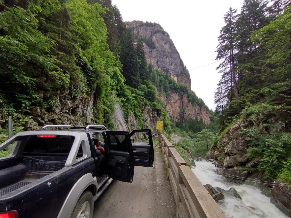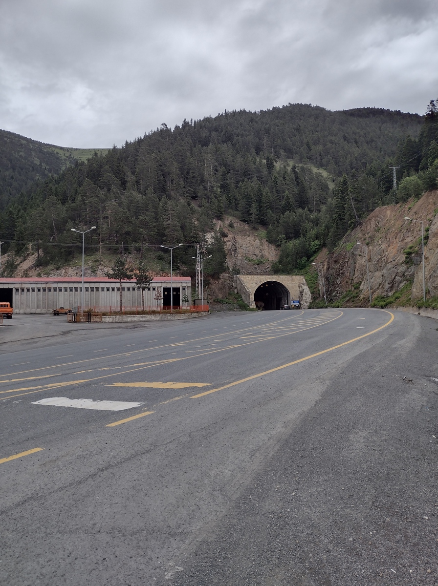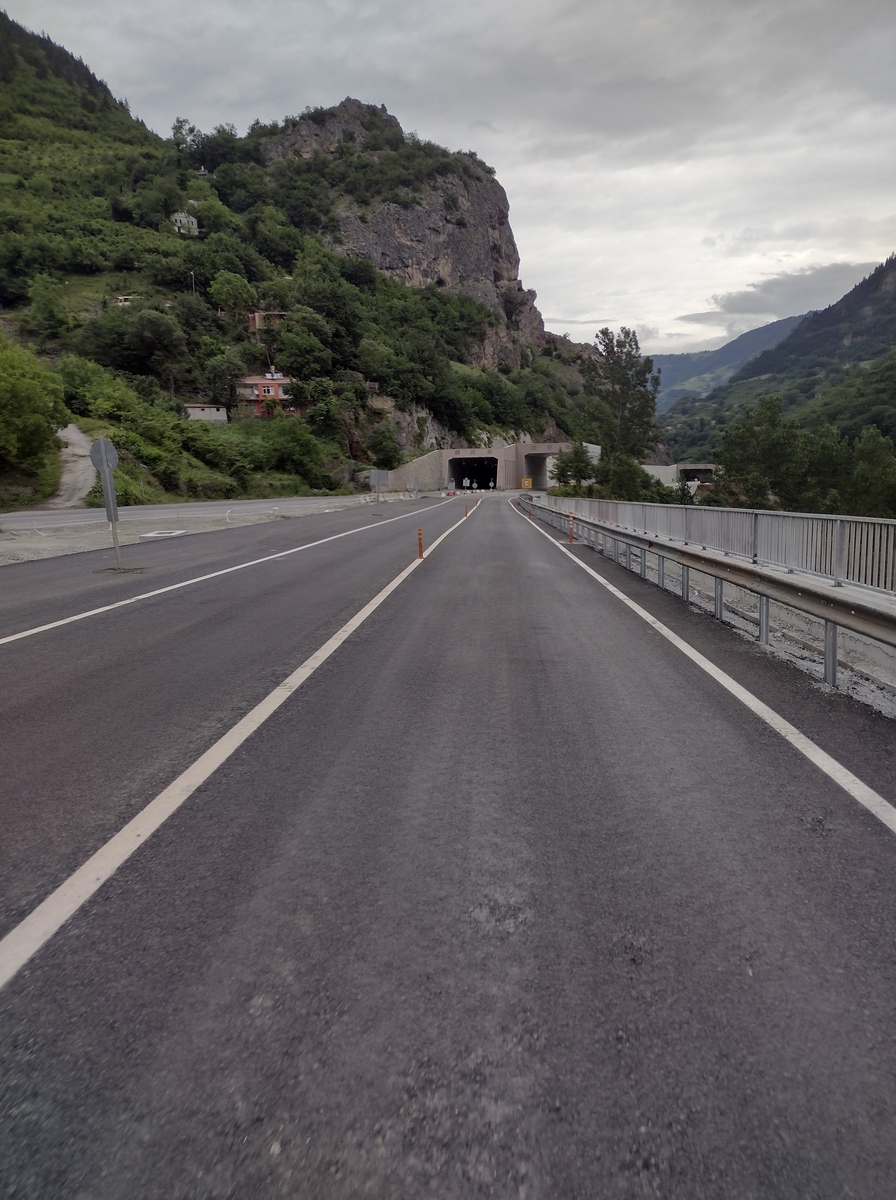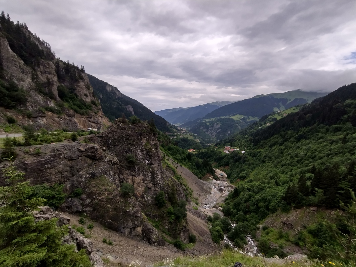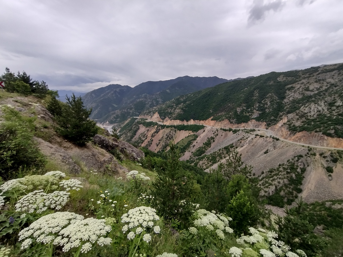 Am nächsten Morgen mussten wir aufgrund der fehlenden Brücke den Staudamm noch einmal umrunden, um wieder auf die Schnellstraße Richtung Trabzon zu gelangen und gleich ging es wieder bergauf, diesmal lang, sehr sehr lang, denn um an das Schwarze Meer zu gelangen mussten wir noch die Kalkanli-Berge überqueren. Unser Dreiergespann wurde zunächst in die Länge gezogen und zerfiel dann nach kurze Zeit in drei Einzelkämpfer. Die stark befahrene Straße wurde schmaler, ließ aber noch genug Platz zwischen uns und den vorbeifahrenden LKW auf der einen und uns und dem Abgrund auf der anderen Seite. Tilmann nutzte die Zeit, um mittels Internetrecherche und Taschenrechner zu ermitteln wie viel teurer das Kochen mit Gas im Vergleich zu Benzin ist (das unerfreuliche Ergebnis haben wir bereits in einem der vergangenen Beiträge mitgeteilt) und postete einige Insta-Stories, um unsere Follower über den dramatischen Anstieg auf dem Laufenden zu halten.