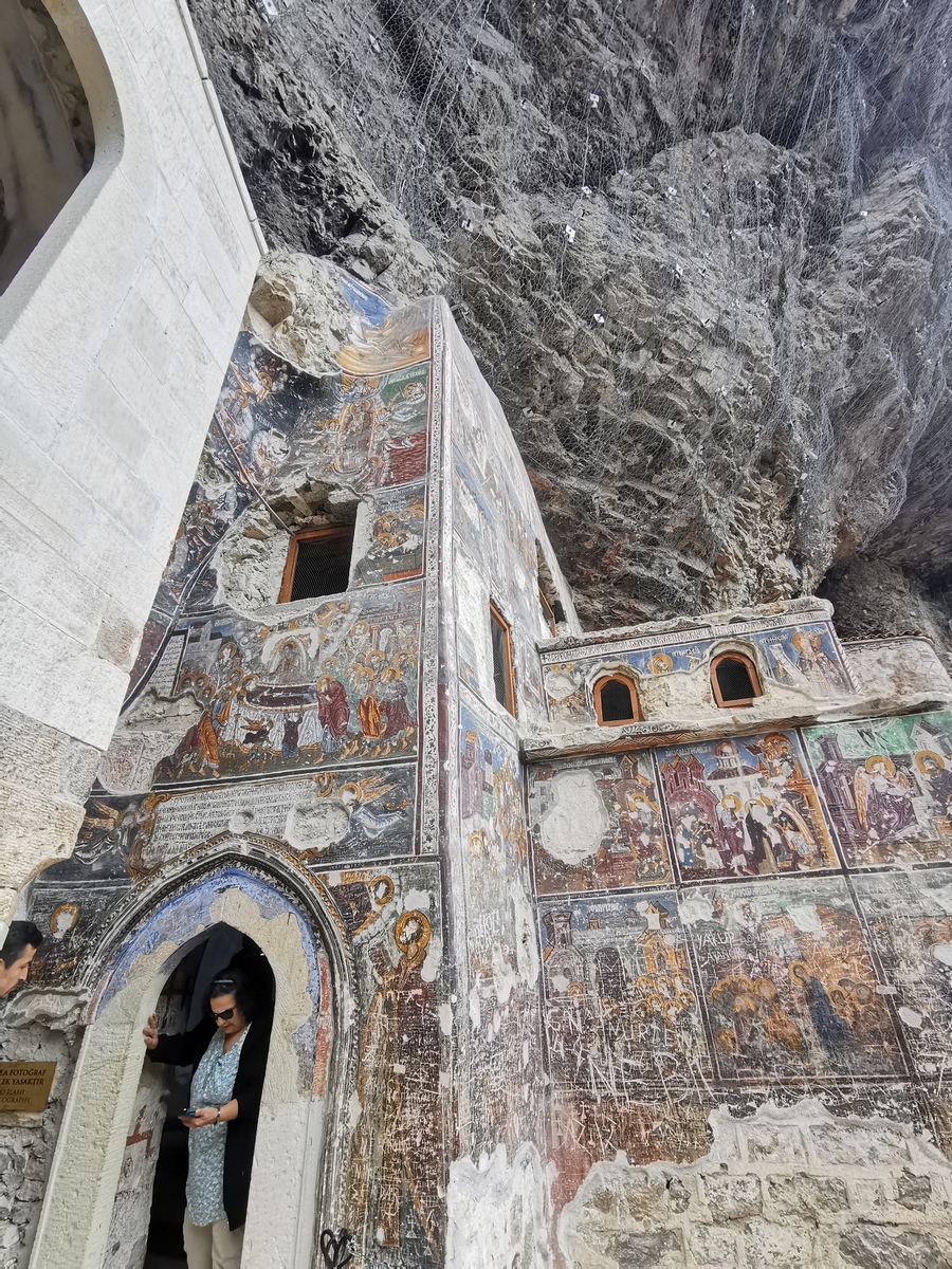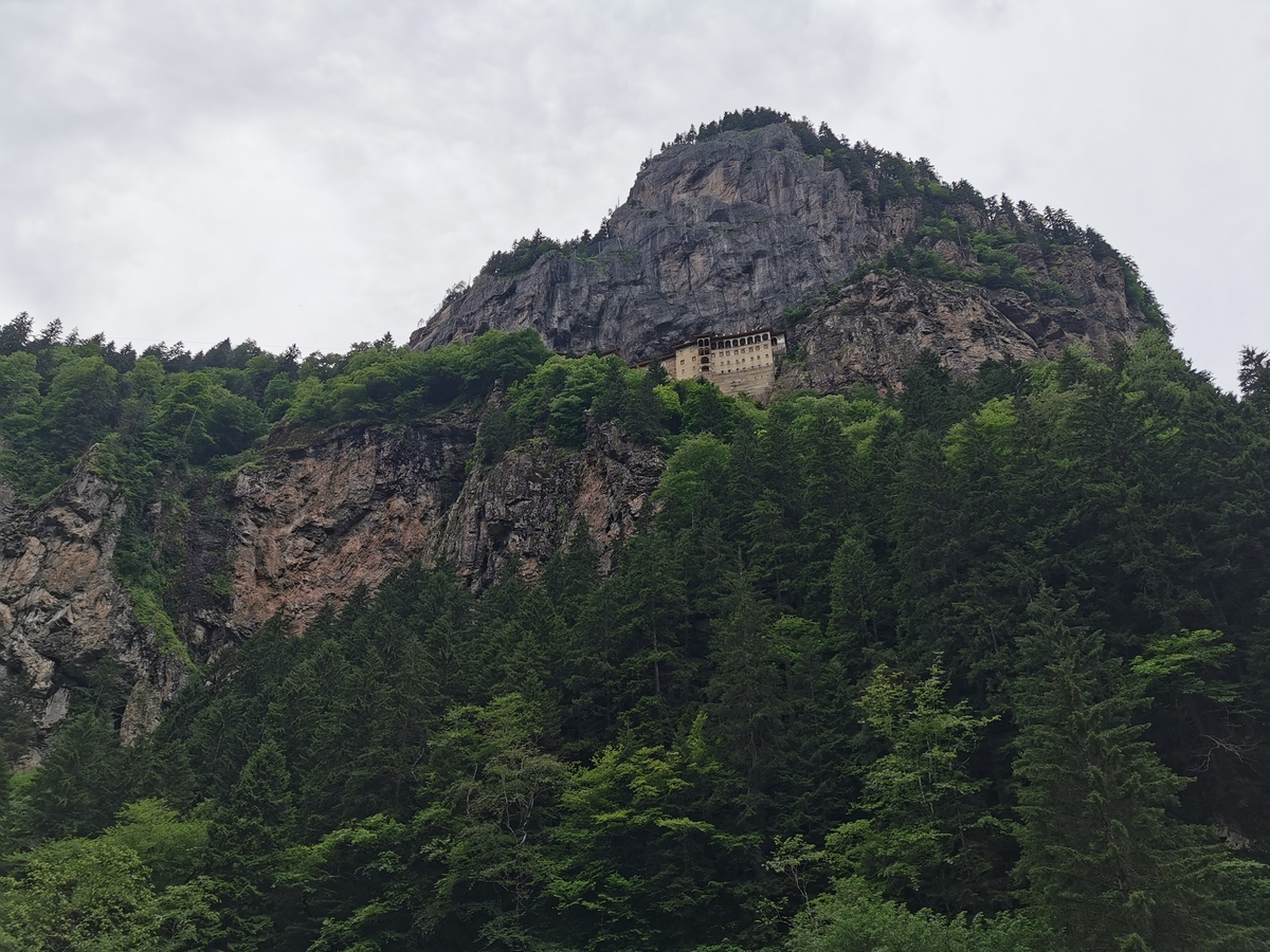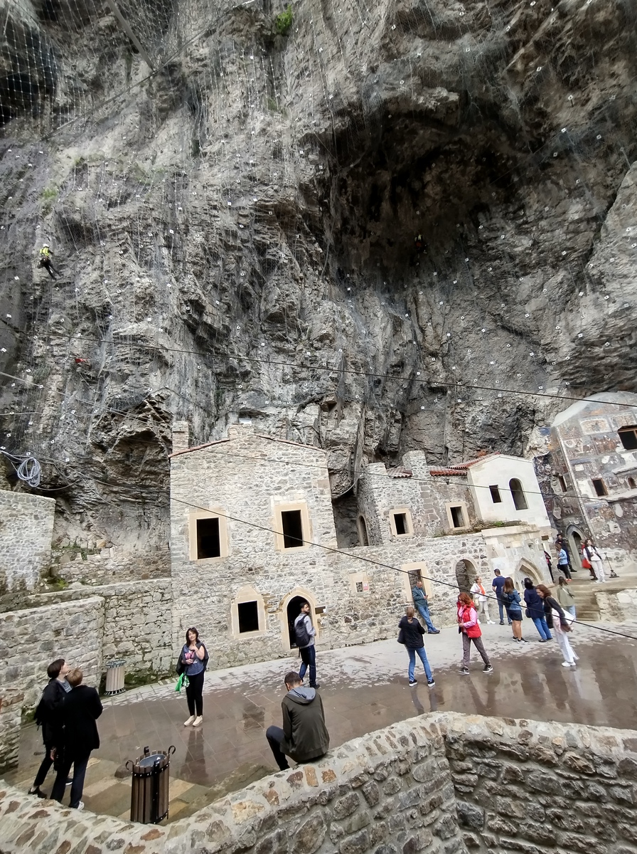 Das Kloster war genauso beeindruckend anzusehen, wie wir erhofft hatten, auch wenn die Fotos wegen des grauen Himmels nicht so gelungen sind, wie gewünscht. Der Anblick von unten hinauf in die Felswand, in der das Kloster thront, war spektakulärer, als das Kloster von innen zu besichtigen und das nicht nur wegen den ganzen anderen Touristen, die sich unhöflich in den engen Räumen vordrängelten. Ein Teil der Innenräume war nicht zugänglich wegen Renovierung und die alten Fresken aus dem frühen 18. Jahrhundert sind stark beschädigt, obgleich die Farbe nach so langer Zeit immer noch einen vollen Ton aufweist. Ebenso absurd, wie der Ort, an dem das Kloster erbaut wurde, ist die Absicherung, die heutzutage vorgenommen wird, um Steinschläge von der Felswand über dem Kloster zu verhindern. Mehrere Kletterer sind dort beschäftigt, um diese Absicherung stetig nachzubessern. Als echte Touristen, die wir an diesem Tag waren, gönnten wir uns im Museumsshop einen Kaffee, der für türkische Verhältnisse ausgezeichnet war und genossen den Anblick auf die Bergwelt der Schwarzmeer-Region. Zurück auf dem Campingplatz verbrachten wir den Rest des Tages mit Faulenzen, Yoga, Biertrinken, Quatschen und mit Two-Face Dragonhead zu kuscheln.