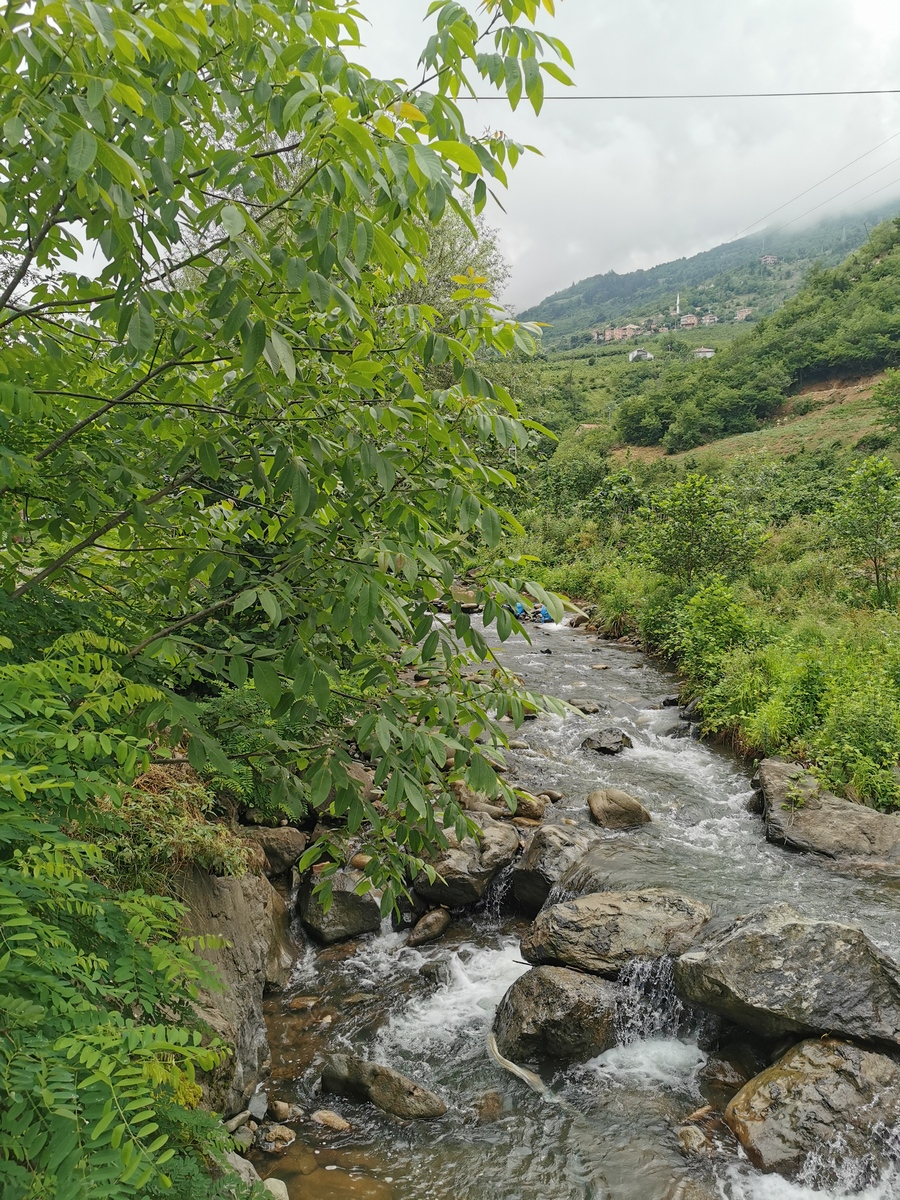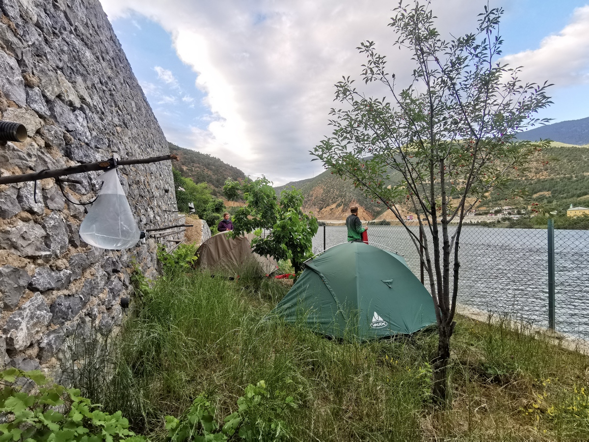 Wir erhofften uns am Ufer des Staudamm des Dogankent eine geeignete Stelle zu finden und da Google-Maps uns mitteilte, dass es dort eine Brücke geben sollte, würden wir am nächsten Tag auch schnell wieder auf die andere Seite zu der Schnellstraße wechseln können. Als wir dort ankamen, war keine Brücke zu sehen und auch das Ufer war sehr steil. In Camlica fragten wir einen Herren, der gerade aus seinem Neubau kam, ob wir von ihm Wasser bekommen könnten. Er bot uns seinen Wasserhahn an und während wir unsere Wassersäcke in seiner schicken brandneuen Küche füllten, erklärten wir, dass wir zu zelten beabsichtigten. Wie nicht anders zu erwarten war, bot er uns seinen Garten an, der direkt am Ufer des Stausees lag und mit einem kleinen Steg zum Angeln sowie mit Obstbäumen sehr hübsch war.