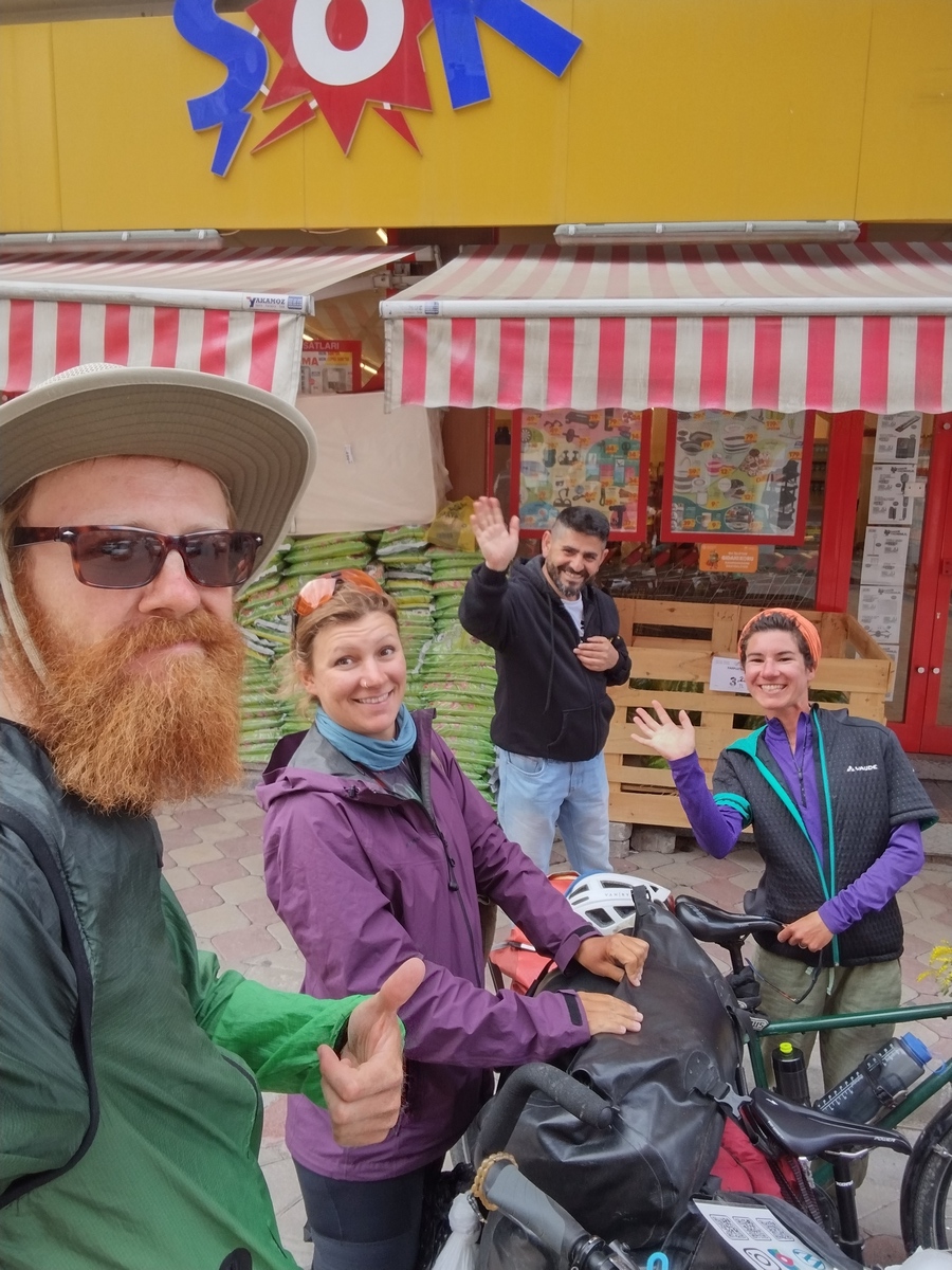 Wir checkten derweil schon einmal die Lage aus und fragten im Ort Övündü in einem Laden – der neben Kaltgetränken und einigen (zu) wenigen Lebensmitteln, eine reichhaltige Auswahl an Hundefutter und Nägeln führte – ob wir den von Komoot vorgeschlagenen „Schleichweg“ von hier zum Kloster Sümela fahren könnten (der uns auf 2.600 m Höhe gebracht hätte) oder ob wir auf der Schnellstraße gemeinsam mit den Lkw fahren müssten. Alle Anwesenden in dem Laden waren sich einig, dass wir auf der gut ausgebauten Straße und damit über Macka fahren sollten. Etwas traurig, mal wieder ein Abenteuer in den Bergen (wie damals als wir Richtung Sarajevo nicht durch das Rika-Tal gefahren sind) verpasst zu haben, machten wir uns an die Weiterfahrt, nutzten aber die Gelegenheit uns einen großes Nagel als Ersatz für einen abhanden gekommenen Heringe schenken zu lassen.