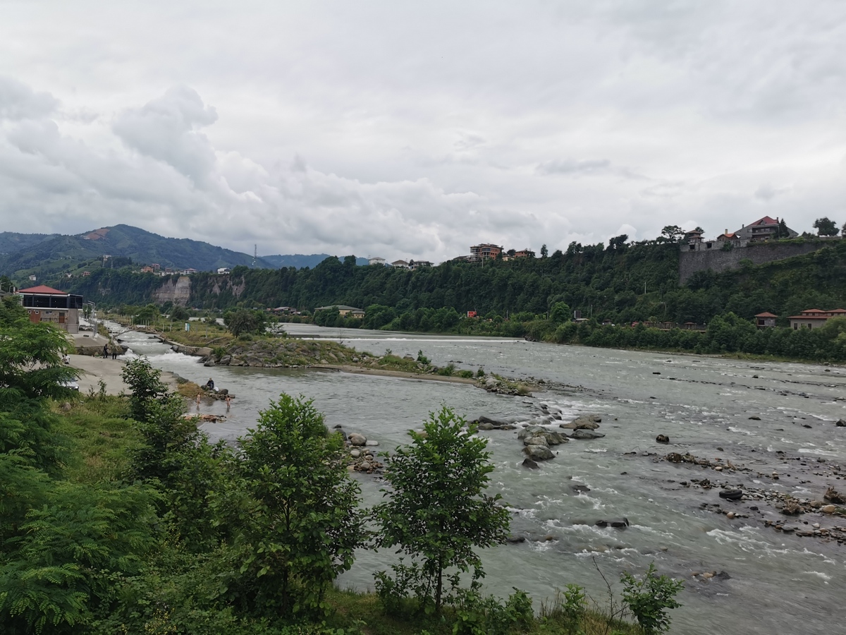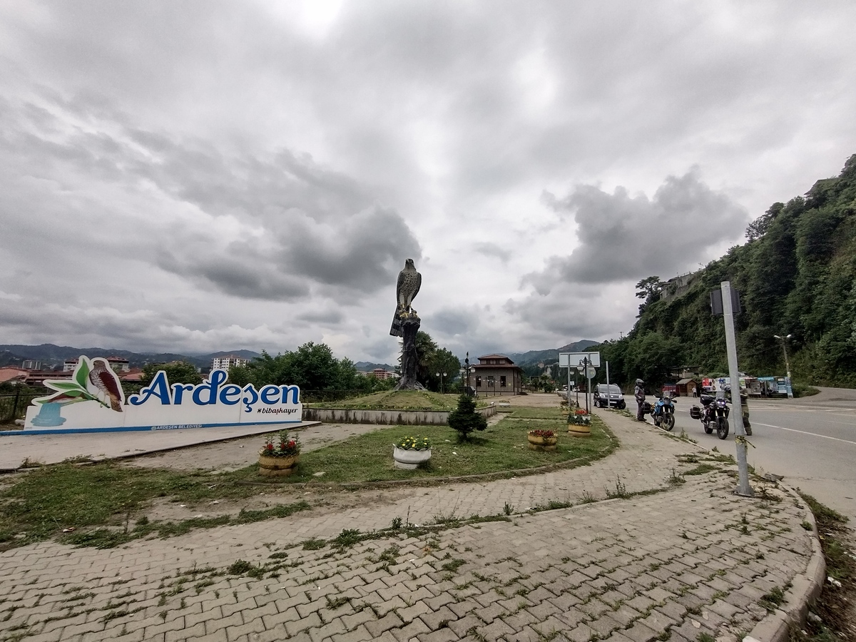 Dieses Grün wurde nun von einer Teefabrik nach der anderen durchbrochen. Eine Einladung zum Cay konnten wir da natürlich nicht ausschlagen, da wir jetzt direkt an der Quelle waren. In Rize wollten wir dann der Küste noch eine Chance geben uns zu überzeugen. Die touristisch bekannte Stadt würde doch gewiss eine nette Strandpromenade haben, also fuhren wir für eine Pause von der Autobahn ab, quälten uns durch das Gedrängel in der Innenstadt und wurde damit überrascht, dass der „Strand“ einer Müllhalde glich, die man von einer äußert unbequemen Bank von der Promenade aus bewundern konnte. Völlig desillusioniert fuhren wir weiter und waren etwas bange, ob sich in dieser Umgebung wohl ein geeigneter Schlafplatz finden würde. Wir hofften auf einen Fluss, den wir auf der Karte sehen konnten, doch auch an seinen Ufern waren die bereits bekannten Wohnblöcke, auf der anderen Seite einige kleine Industrie- und Gewerbeanlagen.