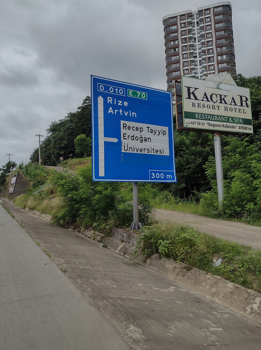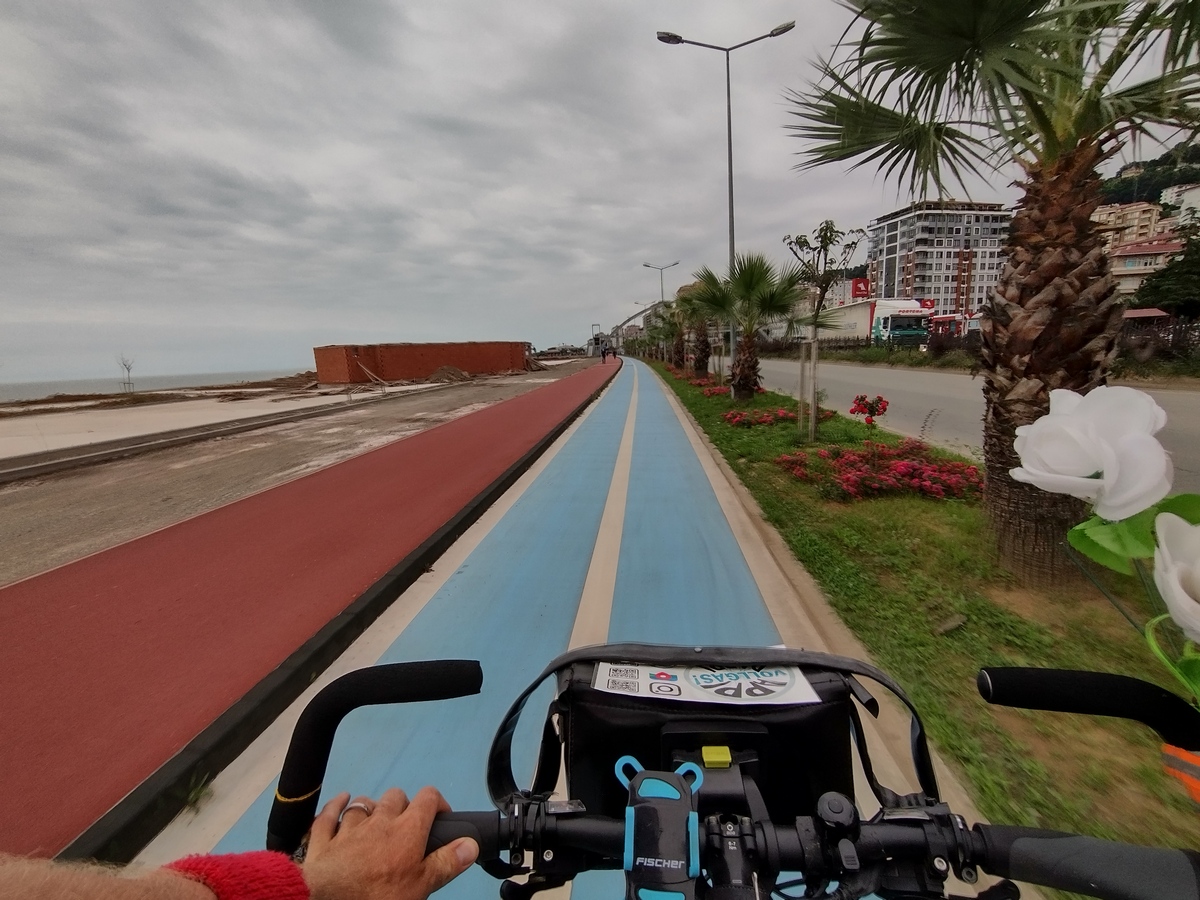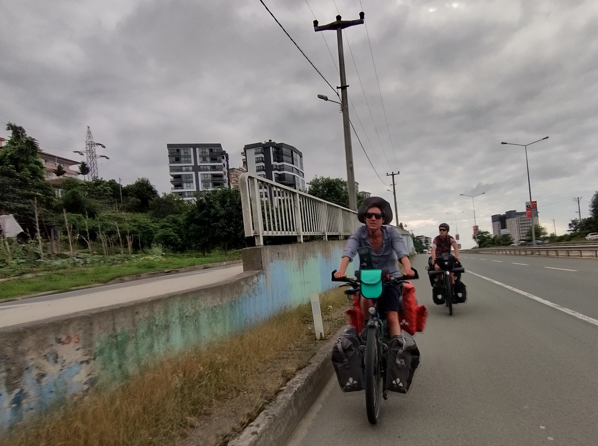 Aus der Autostadt Trabzon führte eine vielbefahrene Autobahn an der Schwarzmeer-Küste entlang Richtung Nordosten. Der Himmel war grau, die Straße war grau und wir konnten nur ab und an einen Blick auf das Schwarze Meer erlangen, dass heute auch grau war. Zu allem Überfluss hielt uns die meiste Zeit auch die graue Mittelleitplanke davon ab, einmal näher an das Meer heranzukommen. Bereits in Trabzon gab es keine Möglichkeit am Meer zu sein, denn dort waren Flughafen, Autobahn und Hafen. Auch bei der Weiterfahrt gewannen wir zunehmend den Eindruck, dass die Türken ihr nördliches Meer und dessen Strände nicht besonders mögen, denn dieses war zugebaut und nicht zugänglich. So radelten wir stoisch die gerade flache Straße entlang und hoffte auf baldige Besserung, die nicht eintreten wollte.