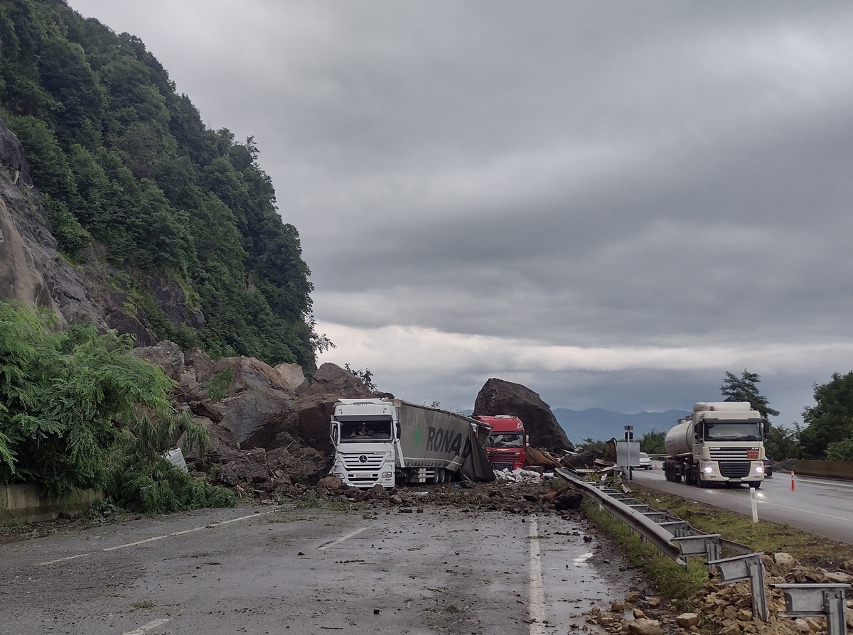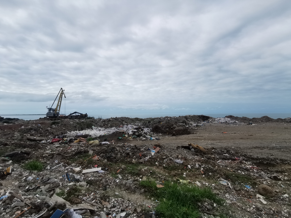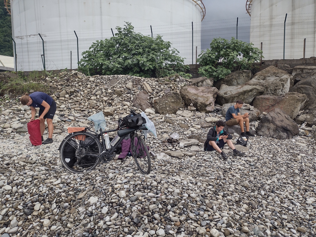 In Hopa kauften wir nochmal ein, tankten Wasser auf und wunderten uns ein bisschen, dass nach dem Ort die Lkw nun auch auf den Fahrspuren standen, wir also durch die Lücken zwischen ihnen kurven mussten. Dann plötzlich war die Schlage vorbei und davor stand ein sehr gestresst wirkender Verkehrspolizist, der auch uns anhielt. Es ging hier also nicht um die Zollfreigabe. Der Polizist nahm sich Zeit, um uns per Google-Translator zu erklären, dass es einen Hangrutsch gegeben hatte und die Straße nun komplett gesperrt sei, mindestens noch für 2 Stunden. Da es bereits Abend war, wurde uns klar, dass wir nun hier in Hopa einen Schlafplatz finden mussten. Tilmann fragte den Pförtner der nächstgelegenen Polizeistation, doch der lehnte entschieden ab. Ein weiterer Mann schlug uns allerdings vor, zum Strand von Hopa zu fahren. Das hört sich vernünftig an. Wir bahnten uns also unseren Weg zurück durch das Verkehrschaos, fanden den zugeparkten Zugang zum Strand und mussten erst einmal lachen: Der Strand war winzig, bestand nur aus großen Steinen und lag neben einem eingezäunten Tanklager. Aber immerhin war es ruhig hier: Obwohl nur wenige Meter von der Straße entfernt, konnten einige Bäume und Büsche das Dröhnen der Motoren und das hupen der Ungeduldigen abschirmen. Nach einem Tag auf der Autobahn, war das fast paradiesisch für uns und wir konnten drei halbwegs geeignete Plätze für unsere drei Zelt identifizieren. Wie wir am Abend noch durch eine Internetrecherche erfuhren, hatte der Hangrutsch auch ein Todesopfer und zwei schwer Verletzte gefordert.
