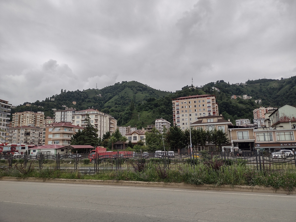 Zumindest wollten wir schnell vorankommen, um dem Elend bald zu entgehen. Die Orte an der Strecke waren groß und charakterlos, lange Reihen von gleich aussehenden Wohnklötzen. Das Ende von Trabzon und den Beginn der neuen Gemeinde hatten wir nicht wahrnehmen können, denn eine Unterbrechung der Bebauung war kaum einmal gegeben. Irgendwann wurde die Besiedlung jedoch lockerer und man konnte erkennen wie schön die Küste eigentlich war, denn das direkt hinter dem Meer aufragende Kackar-Gebirge ist überwuchert von einem undurchdringlichen Feuchtwald. Als wir Rize näher kamen, wurde die Wildnis immer mehr durch saftig grüne Teeplantagen ersetzt, die sich wie Matten in mehreren Lagen an die steilen Hänge schmiegten.