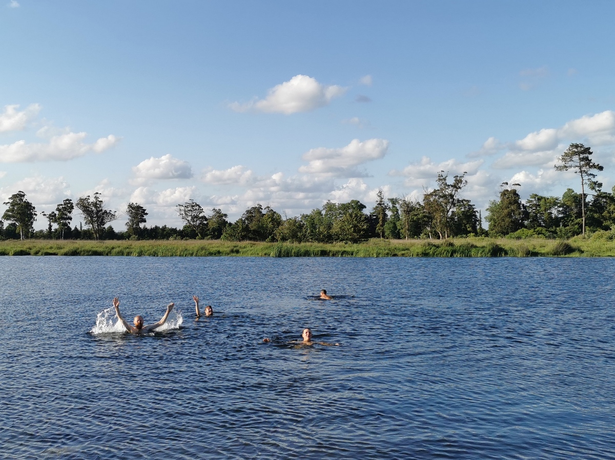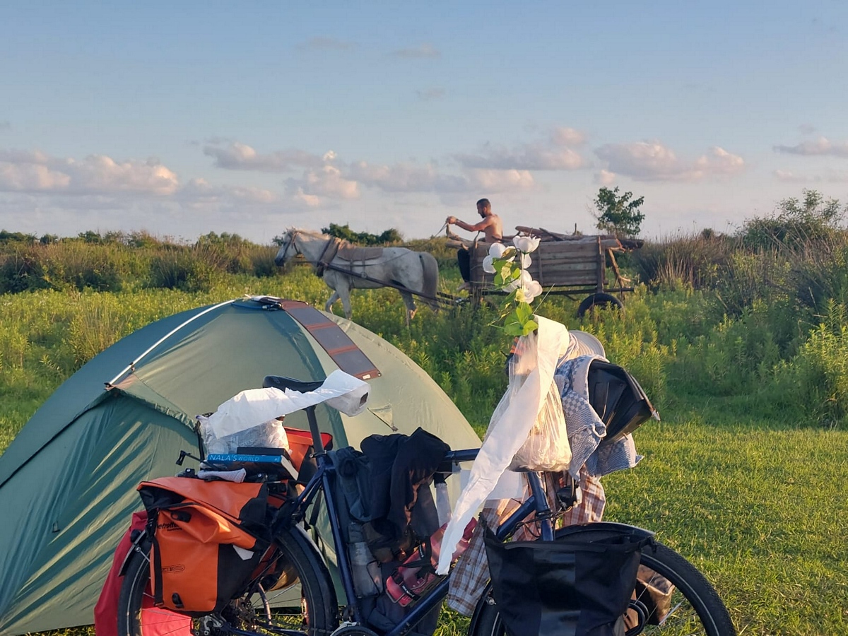Dass Tilmann beim Baden im See nicht müde wurde immer wieder „ist das geil“ zu wiederholen, hielt Alex zunächst für etwas überzogen. Als er sich selbst in das angenehm temperierte Nass begab musste er allerdings einräumen, dass es sich nicht um eine Übertreibung handelte. Am Abend bekamen wir noch Besuch von einem bärtigen Schönling mit freiem Oberkörper, der stehend auf einer Kutsche daher gefahren kam, die von einem prächtigen Schimmel gezogen wurde. Ohne sich seiner schweren Arbeitshose zu entledigen nahm er ein kurzes Bad im See und war auch schon wieder entschwunden. Glückstrunken waren alle so guter Dinge, dass wir mit nichts Schlimmen rechnen konnten.