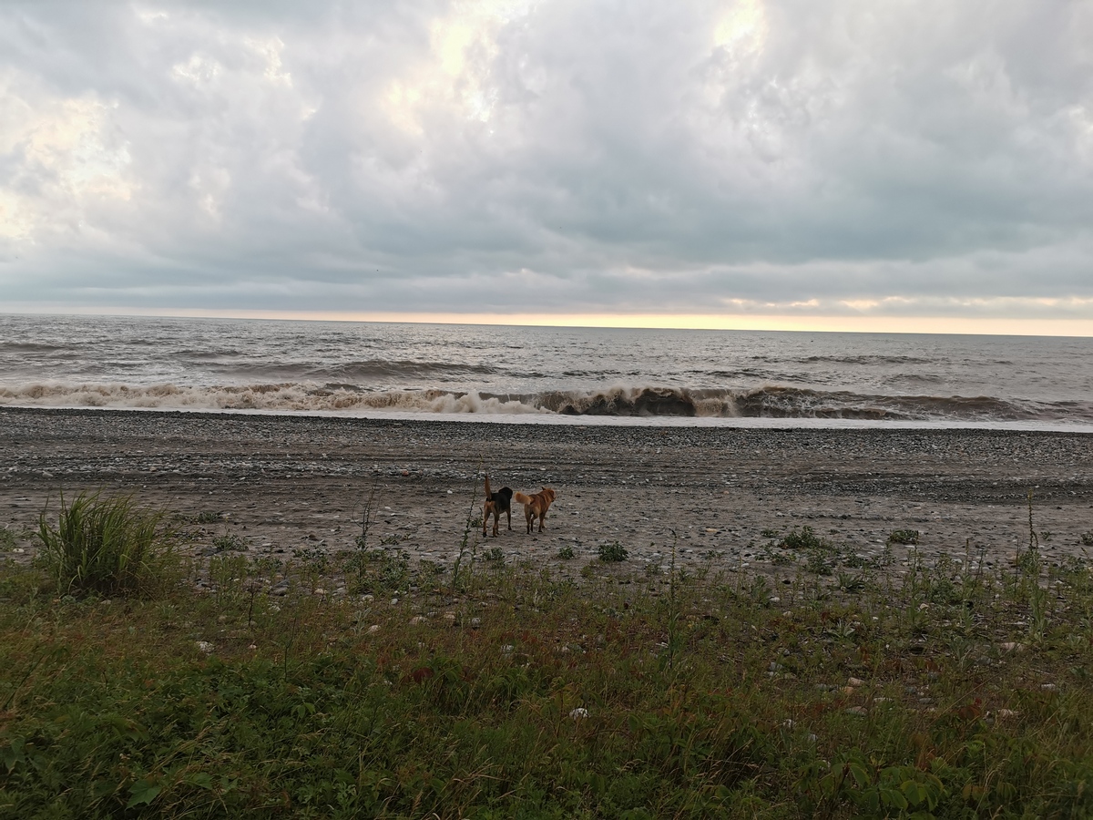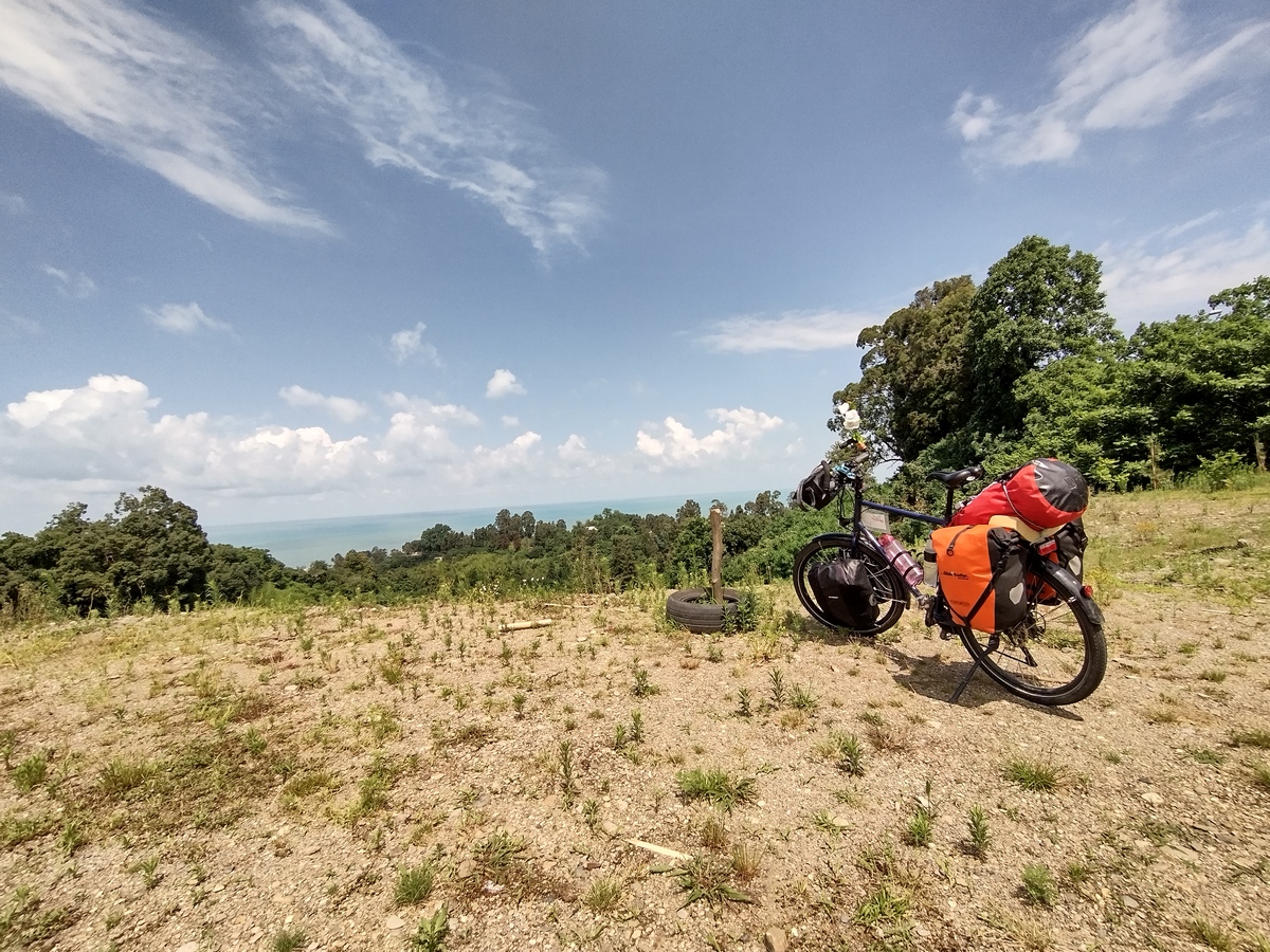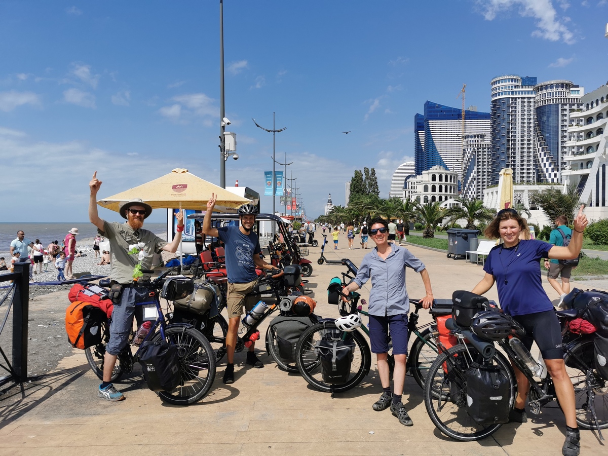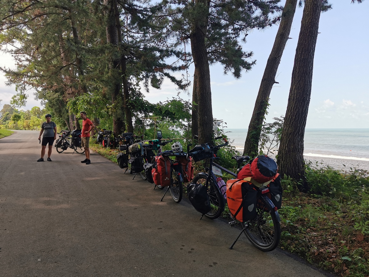 “Wo ist mein Fahrrad”, hörten wir am nächsten Morgen Oliver sagen, als auch wir gerade aus unserem Zelt gekrabbelt waren. Erst da bemerkten wir es, nicht nur Olivers, auch Kathrins Fahrrad fehlte. In diesem Moment plumpsten wir alle von der rosaroten Wolke hinab auf den Boden des georgischen Plumpsklos. Schockiert und ratlos standen wir in dieser schönen Kulissen und waren alle sauer und traurig, zwei ganz besonders. Verzaubert vom Quarken der Frösche und dem Meeresrauschen, hatten wir alle tief geschlafen und nicht gehört, wie nachts die beiden Fahrräder, die zwar abgeschlossen aber nicht angeschlossen waren, weggetragen wurden. Die beiden Pärchen hatten ihr Fahrräder aneinander geschlossen, was wahrscheinlich den Diebstahl aller Räder verhindert hatte. In einem Anflug von purem Aktionismus schwang sich Tilmann auf sein Fahrrad und fuhr die nähere Umgebung ab, um nach den Rädern zu suchen, natürlich ohne Erfolg.