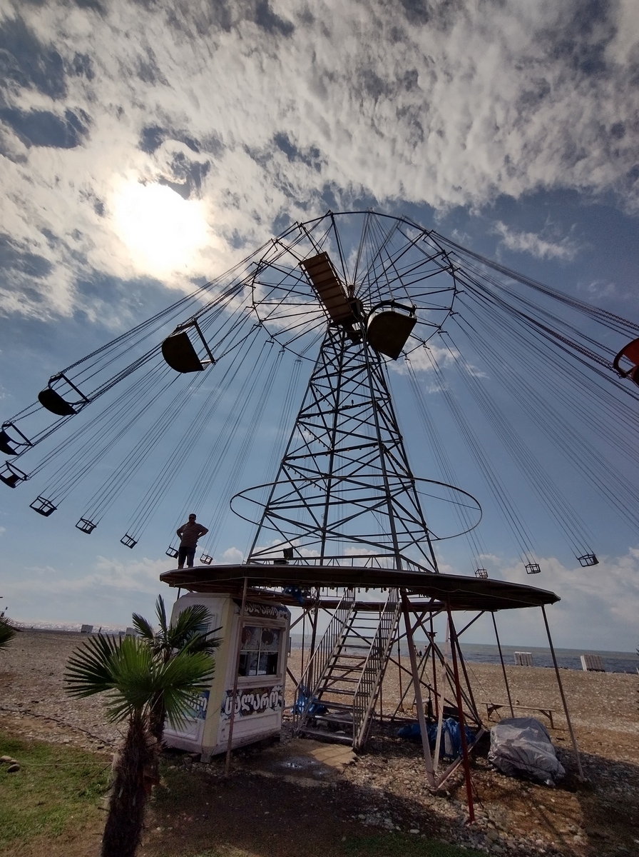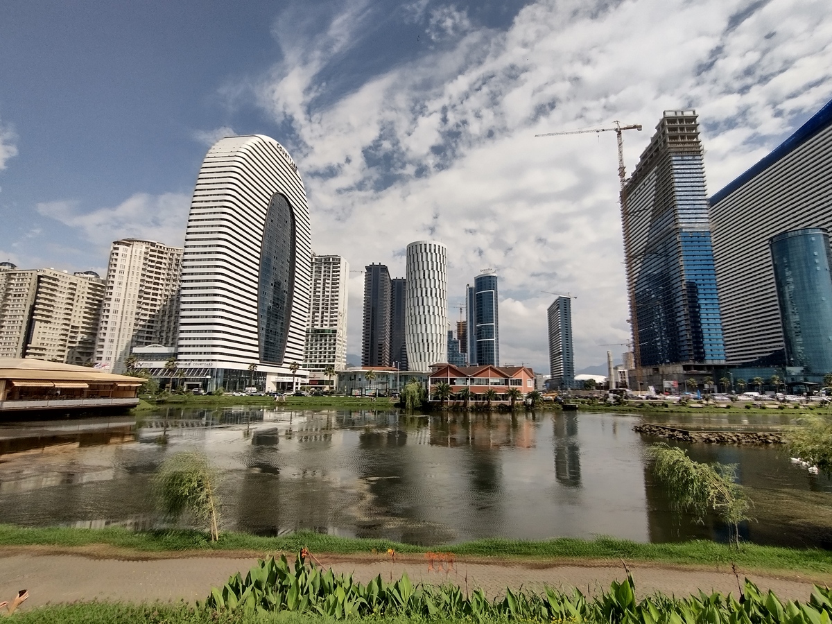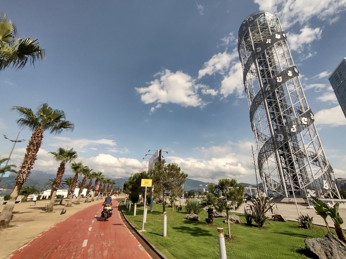Zwei Tage zuvor schwebten wir noch über den Wolken. Die in den letzten Tagen graue Türkei hatte uns ausgespuckt und wir waren im Paradies gelandet. Kaum hatten wir die Grenze überschritten, kam die Sonne raus und glitzert auf den grünen Blättern des Dschungels, der an der Schwarzmeer-Küste den Hang hinauf wächst, ab und an unterbrochen von wunderschönen Wasserfällen. Zusammen mit der Architektur, der aufgetragenen Mode der Einheimischen und den überall herumgrasenden Kühen versprühte das für uns neue Land einen nahezu karibischen Flair. Wir mussten uns kurz die Augen reiben und feststellen, dass die Türkei, die wir doch mit gewisser Wehmut verließen, schon nach wenigen Stunden des Vergleichs ganz schön abstank. Am Strand Boulevard von Batumi erlebten wir dann schließlich einen kleinen Kulturschock. Dieser war kilometerlang, sauber, beherbergte viele Cafés und allerlei Amüsiereinrichtungen und war von spärlich bekleideten Menschen übersät. Das alles kannten wir nicht aus der Türkei. Jenseits des Strandes reckten sich nagelneu glitzernde Hochhäuser und Türme gen Himmel, die mit diversen Gadgets, wie z.B. Riesenrädern auf ihren Dächern ausgestattet waren.