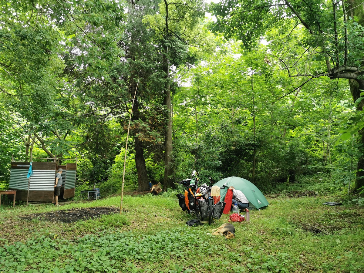 Trotz der Las Vegas Anleihen, die der Architektur der Hotels und Casinos offenkundig zu Grunde gelegt worden waren und die ein reges Nachtleben versprachen, wollten wir es nicht bei einer Tagesetappe von nur 30 Kilometern belassen, fuhren noch weiter und staunten weiter wie plötzlich sich alles um uns herum verändert hatte. Schließlich beendeten wir den ersten Tag in Georgien auf einem besonders schön gelegenen und besonders rudimentär ausgestatteten Campingplatz (mit Holz angefeuert Boiler und Plumpsklo), der lediglich 10 Lari (3,33 Eur) pro Zelt kostete. Kurz nach uns trafen dort zufällig auch Sonja und Alex ein, die Kathrin bereits in Göreme kennengelernt hatten und wir waren nun eine sechsköpfige Fahrrad-Gang, die am nächsten Tag gemeinsam weiter fuhr.