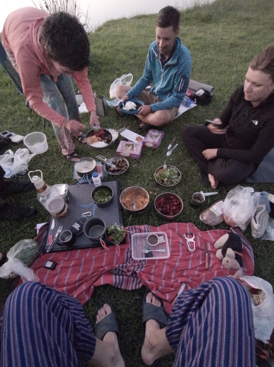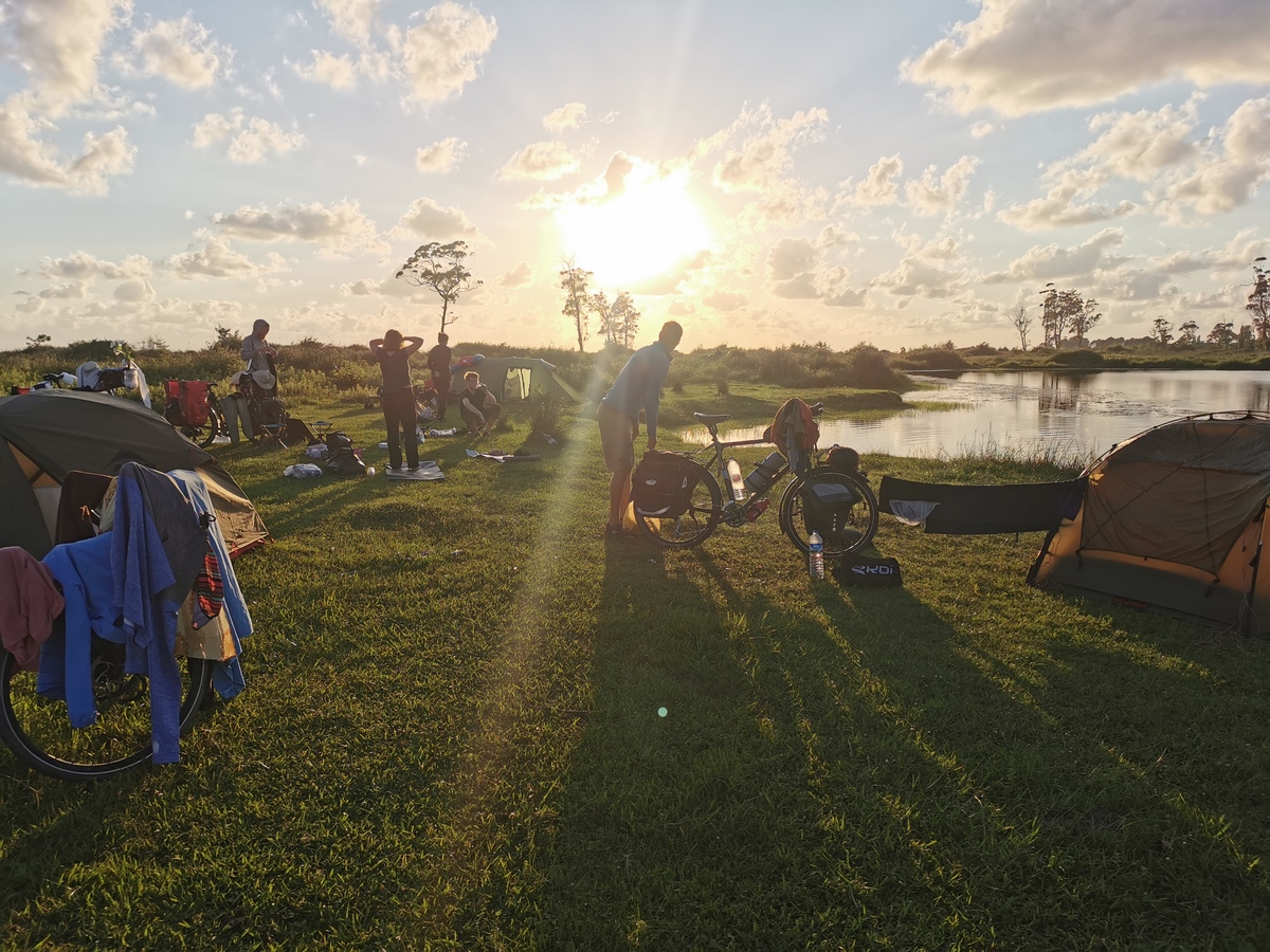 Das wachsen der Gruppe führte am nächsten Tag trotz der Möglichkeit Windschatten zu fahren nicht zu einer Steigerung der Leistung, sondern zu einer Ausweitung der Pausen. Aufgrund der netten Gesellschaften war damit aber keiner unzufrieden und wir kamen uns alle ziemlich cool vor als Fahrradbande. Nach relativ kurzer Etappe ließen wir uns also an einem wunderschönen Fleckchen Erde in diesem paradiesischen Land nieder: Eine saftig grüne Wiese zwischen dem rauschenden Meer und einem ganz klaren Süßwassersee. Natürlich sprangen wir in beide Gewässer und zum ersten Mal kam auf unserem Trip richtiges Urlaubsfeeling auf.