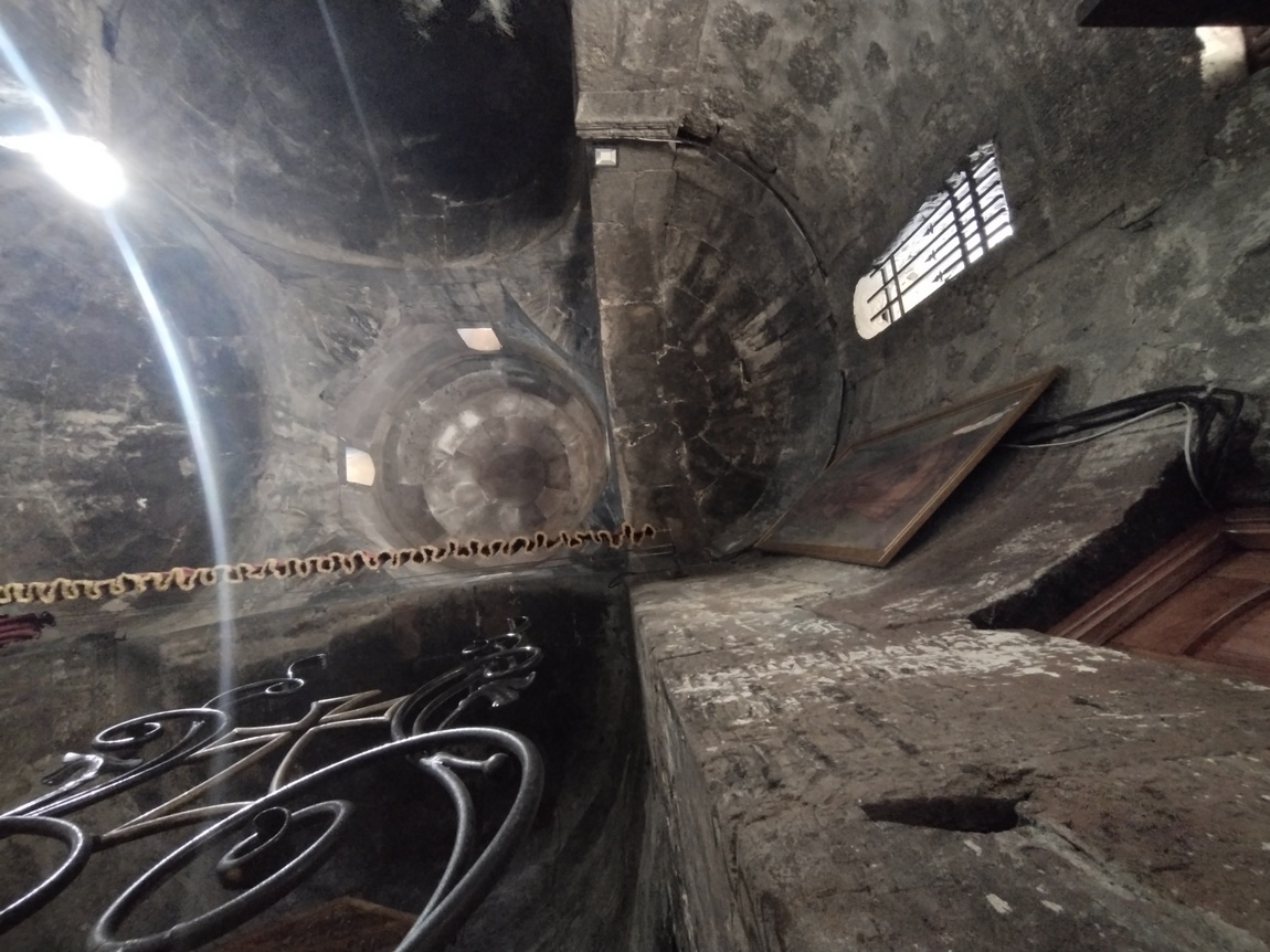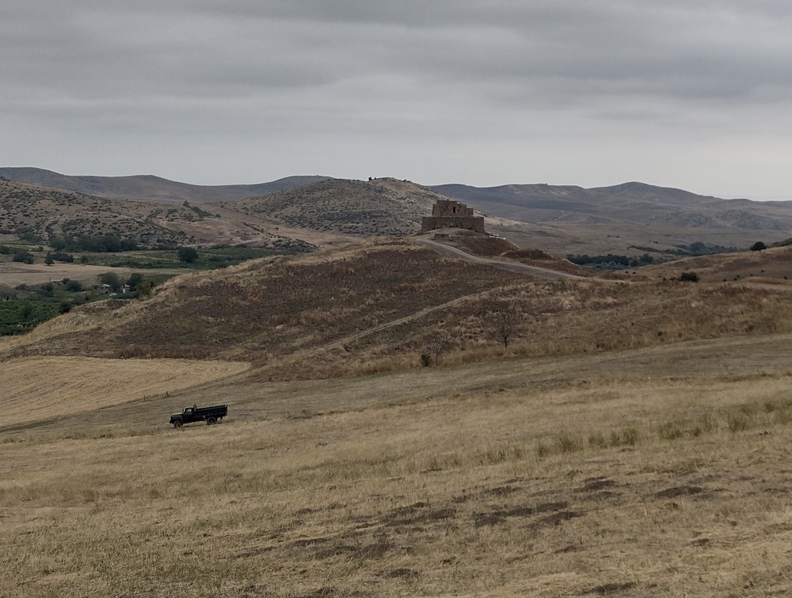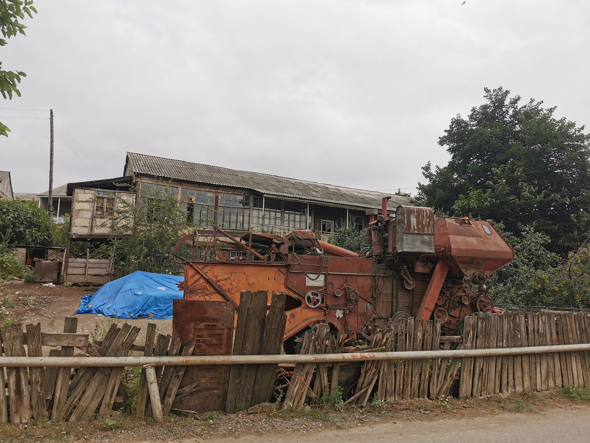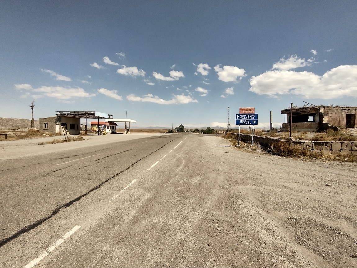 Sowie unsere Körper mit dem Abbau des Alkohols ernst machten setze der übliche Hunger ein. Also mussten wir bald noch eine Essenspause einlegen und wählten dafür eine altehrwürdige Kirche aus, neben der einige verlassene Wohnhäuser standen. Erst nachdem wir uns niedergelassen hatten, merkten wir, dass wir wieder direkt auf der Grenze saßen. Kaum hatten wir unser Brot verspeist, kamen auch schon wieder zwei Soldaten auf uns zu und baten uns entschuldigend woanders zu pausieren. Die Straße führte nun genau an der Grenze entlang und manch eine Kurve der Serpentinen liegt in aserbaidschanischem Gebiet, wird von Armenien aber ganz normal genutzt und auch nur an einigen Posten überwacht. Es gibt keine feste Grenzanlage. So überschritten wir sogar mehrfach die Grenze, was uns nur durch einen Blick auf die Karte deutlich wurde.