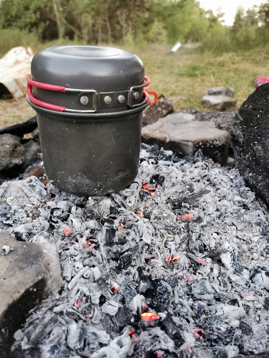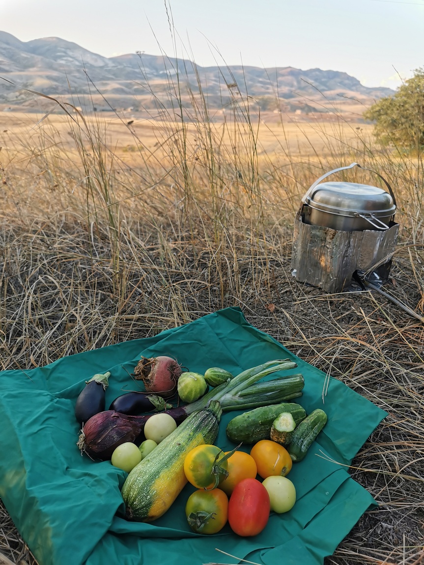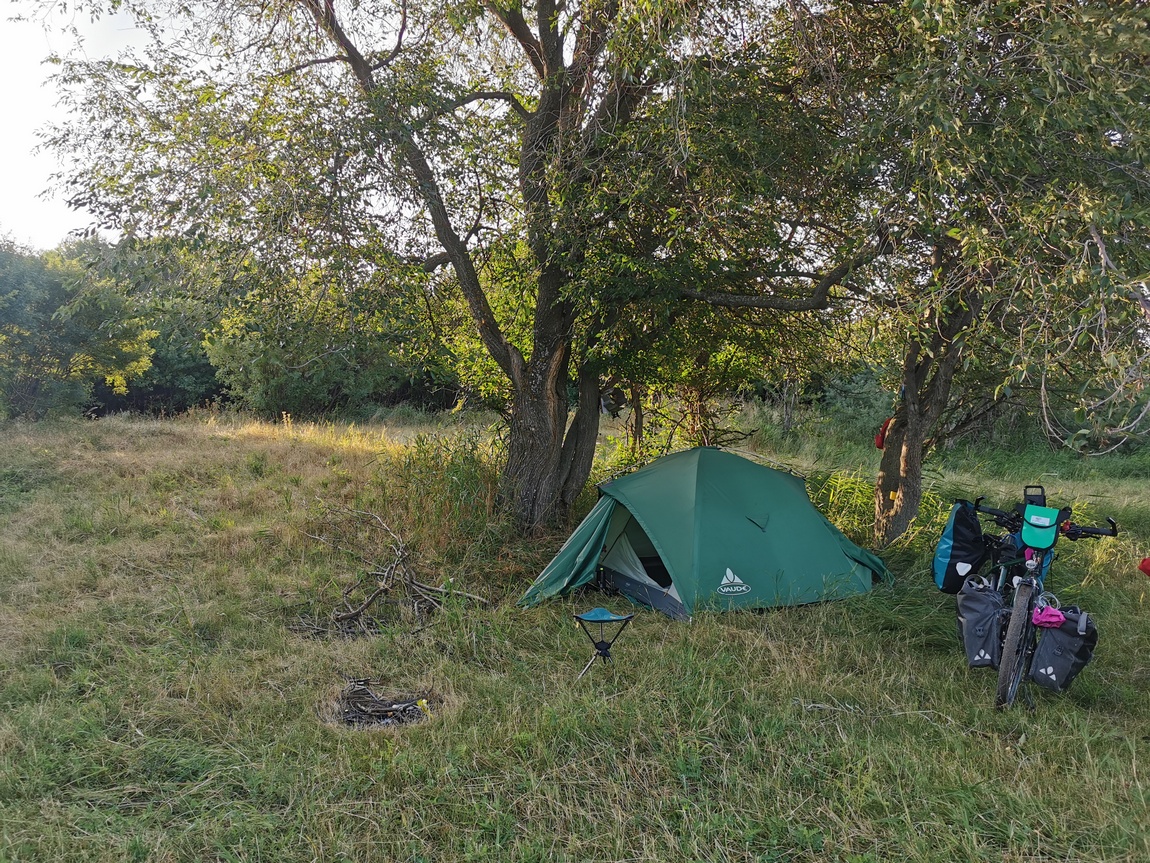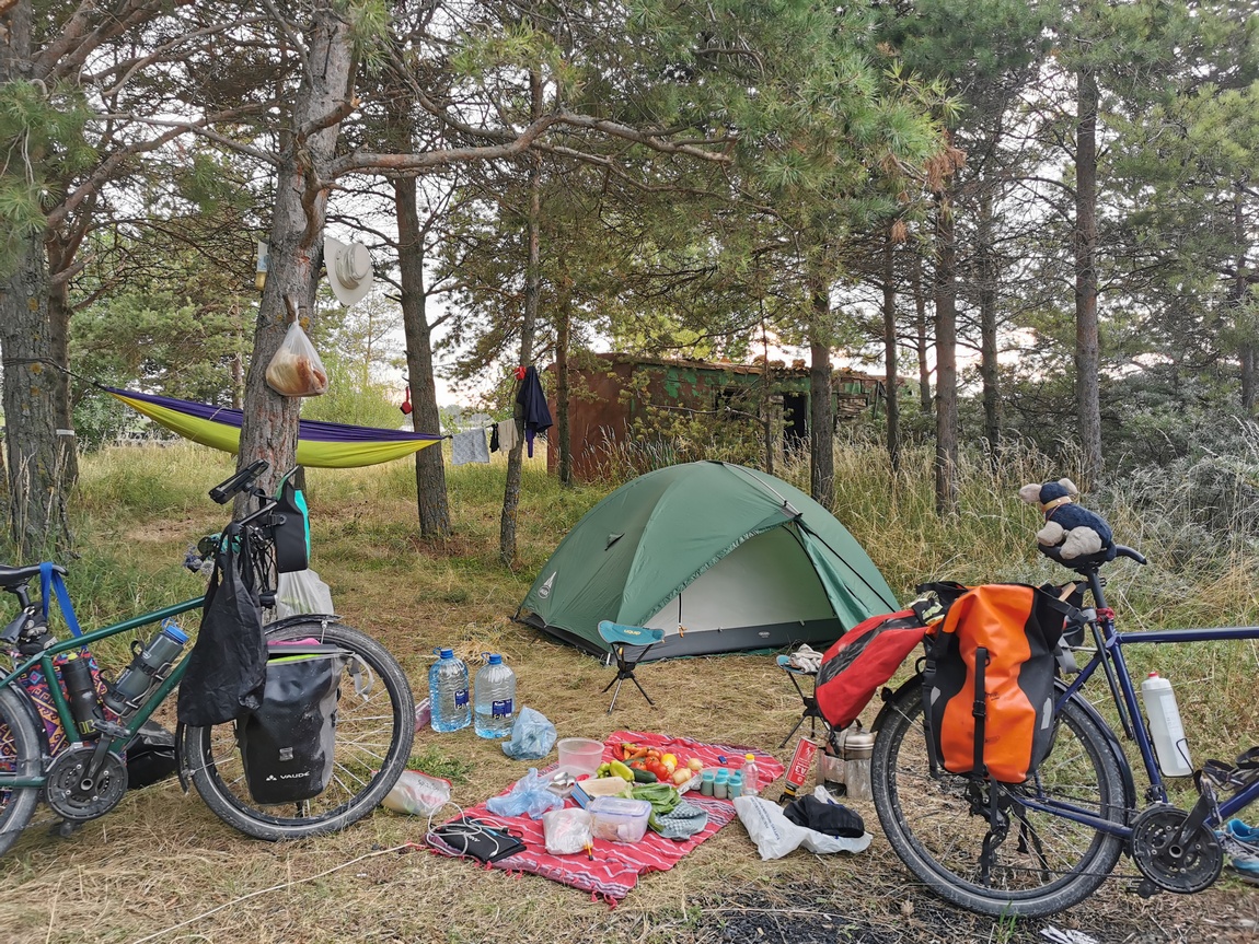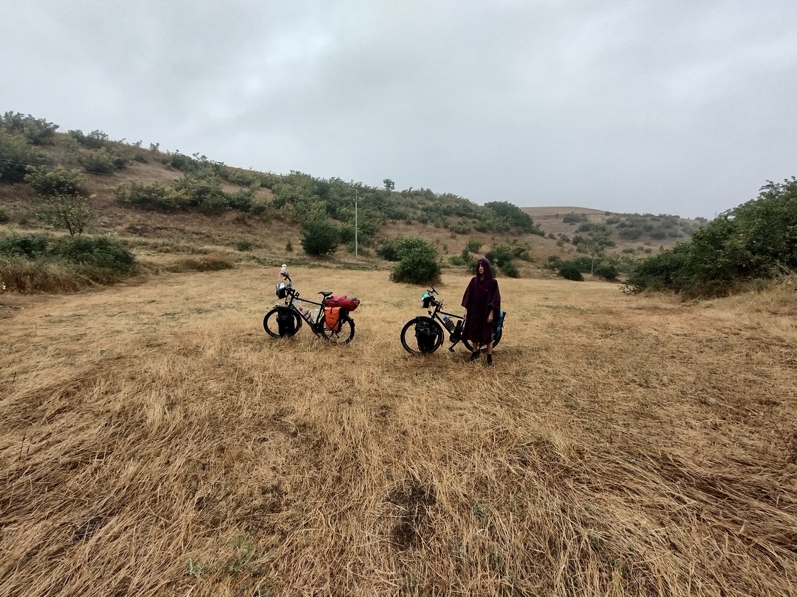 Wieder beschwipst bewältigten wir dann doch noch den Anstieg. Oben angekommen setzte leichter Regen ein und da wir aufgrund der Katerstimmung nicht mehr viel Lust hatten an diesem Tag noch weiter zu fahren, erwogen wir kurz das Zelt gleich an Ort und Stelle aufzubauen obwohl wir quasi immer noch auf der Grenzlinie tanzten und kaum noch Wasser hatten. Die Greenscreen war als Unterlage schon ausgebreitet, als der Regen bereits wieder nachließ. Um nicht wieder von Soldaten abgefüllt oder verscheucht zu werden, schleppten wir uns dann doch noch den Berg hinab an ein Plätzchen auf einem abgemähten Feld, dass etwas weiter entfernt von der Grenze lag. Kurz nachdem wir das Essen zubereitet hatten setzte starker Regen ein und es war wohl das erste mal auf der Reise, dass wir Regen bedingt im Zelt essen mussten.