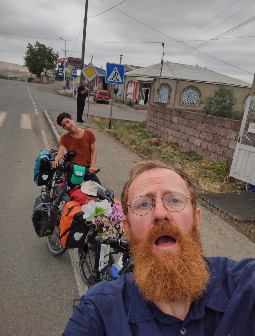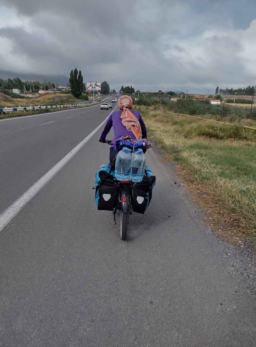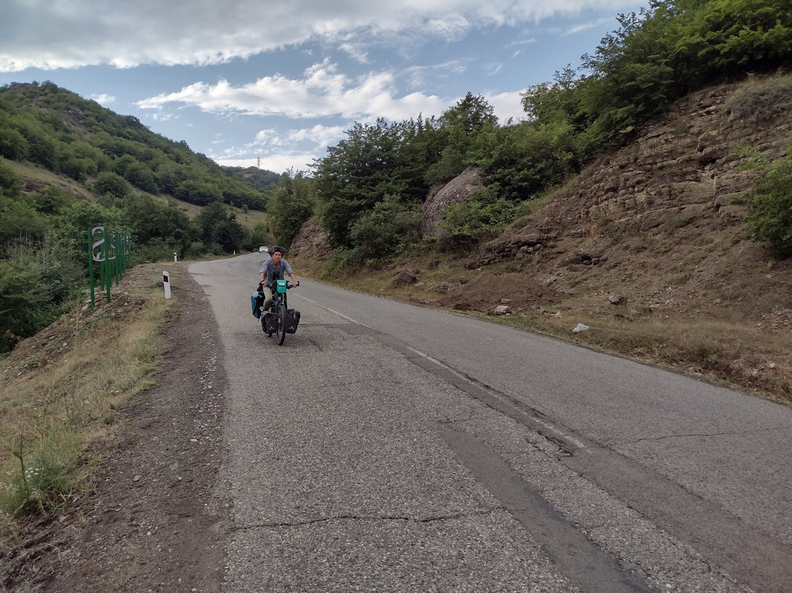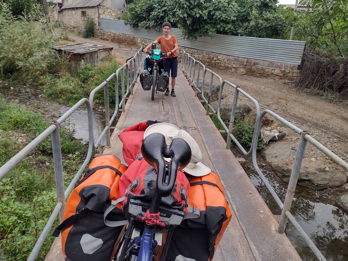 Am zweiten Tag gelangten wir auf die Strecke, die die meisten Radweltreisenden von Georgien kommend Richtung Iran einschlagen, wir waren nun allerdings im Gegenverkehr, also wieder Richtung Norden unterwegs. So begegneten wir gleich drei Fahrrad-“Paaren“, darunter ein junger Radfahrer, den wir bereits in Istanbul kennengelernt hatten (er war mit Kathrin drei Tage lang unterwegs gewesen), ihm hier aber nur aus der Ferne winken konnte, weil er mit seinem Kompagnon gerade weit unterhalb der Straße in einem grünen Tal eine Rast machte. Die anderen schienen sich nicht so sehr vor der Hitze im Iran zu fürchten, wie wir, denn sie wählten den kürzesten Weg Richtung Süden.