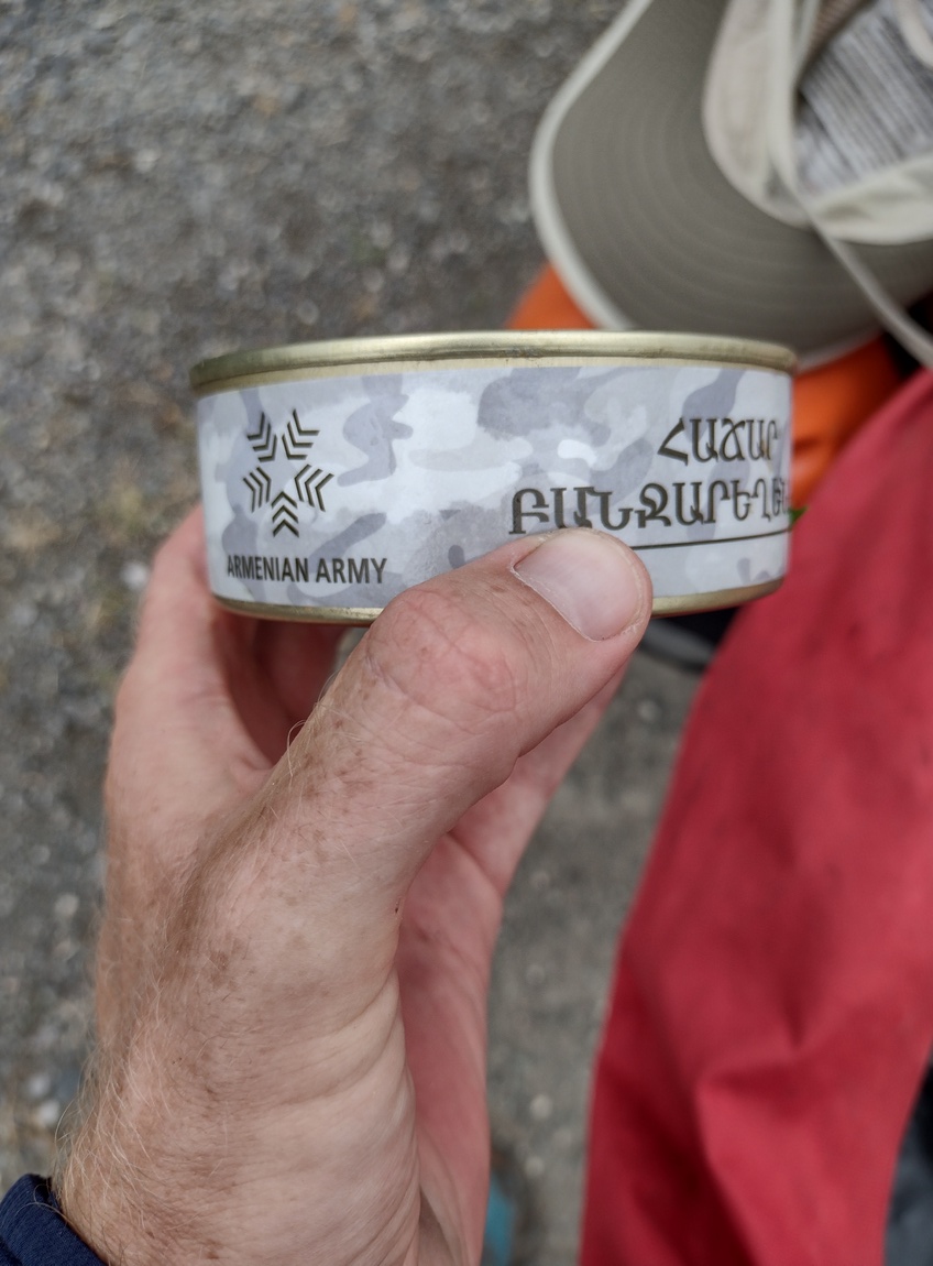 An unserem zweiten Tag in Armenien entdeckten wir ein Schild, dass auf eine Festung aus dem 12. Jahrhundert hinwies. Wir beschlossen diese zu besichtigen, wissend, dass diese an der Grenze zu Aserbaidschan lag. Auf dem Feldweg dorthin entdeckten wir dann auch ein Militärfahrzeug, fragten, ob es ok sei, wenn wir dorthin führen und wurden durchgewinkt. Als wir an der Festung ankamen wimmelt es dort zu unserer Überraschung von armenischen Soldaten. Die Truppe hatte in dem alten Gemäuer einen provisorischen Stützpunkt errichtet. Unter einer großen Plane war ein Bettenlager und an der Festungsmauer lehnten Gewehre. Die Soldaten, größtenteils bierbäuchig, in Badelatschen und in unterschiedlichen Camouflage Outfit, freuten sich uns zu sehen, machten uns aber gleich klar, dass fotografieren nicht erlaubt sei. Dafür wurden wir zum Frühstück eingeladen, dass neben dem mit Gemüse gefülltem armenischen Fladenbrot Lavash aus Wein und Vodka bestand. Wir durften zwar nicht fotografieren, mussten aber als Fotomotiv für die Soldaten her halten. Dafür wurde Tilmann noch mit schusssicherer Weste und Helm ausgestattet, als ein junger Soldat jedoch noch die Kalaschnikow herbeiholen wollte, wurde er von seinem Chef ermahnt und musste diese zurück stellen. Der junge Soldat zeigten uns anschließend noch seine Schussverletzung am Bauch, die er im Bergkarabach-Konflikt davon getragen hatte, woraufhin Tilmann ihm seinen Sonnenbrand vom Vortrag zeigte. Da die Soldaten sich schließlich noch nach Tilmanns Tattoo erkundigten, bildete eine kleine Rap-Performance mit Julia an der Beatbox (sie entschied sich für den einfachst möglichen „bö-se-Ka-tze“ Beat) den Höhepunkt unseres Besuchs. Dann wollte der Truppenführer die Touristen, die die Truppe kurzzeitig erheitert hatten, doch lieber wieder los werden und wir wurden ehrenhaft, sturzbetrunken und mit einer Packung Zigaretten sowie drei Dosen Konserven-Truthahn entlassen.