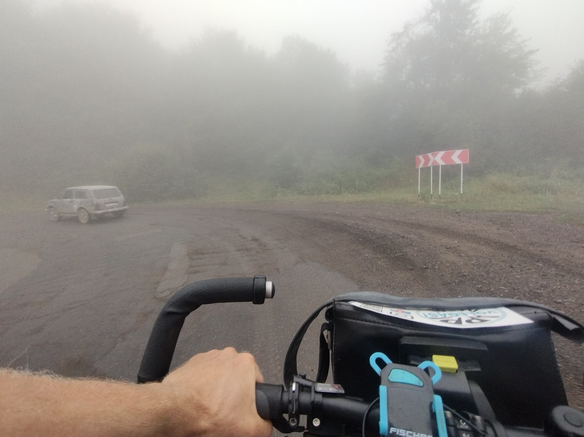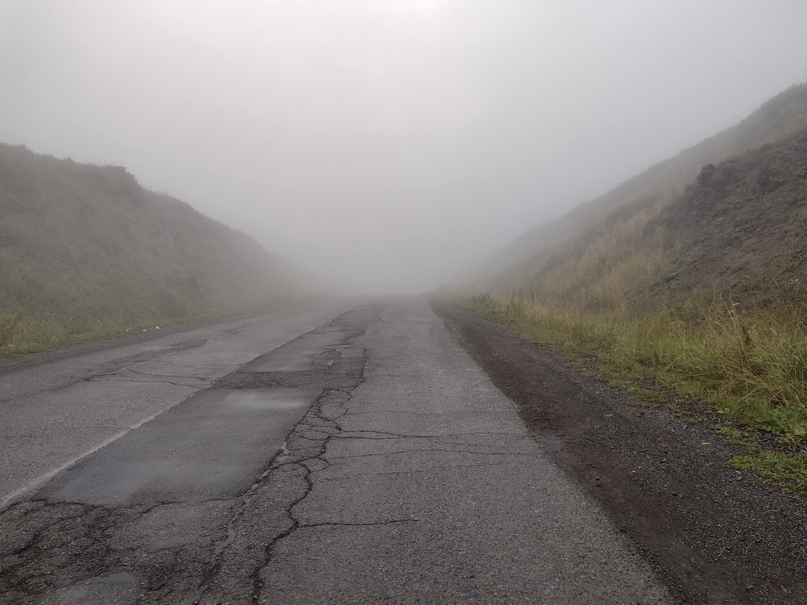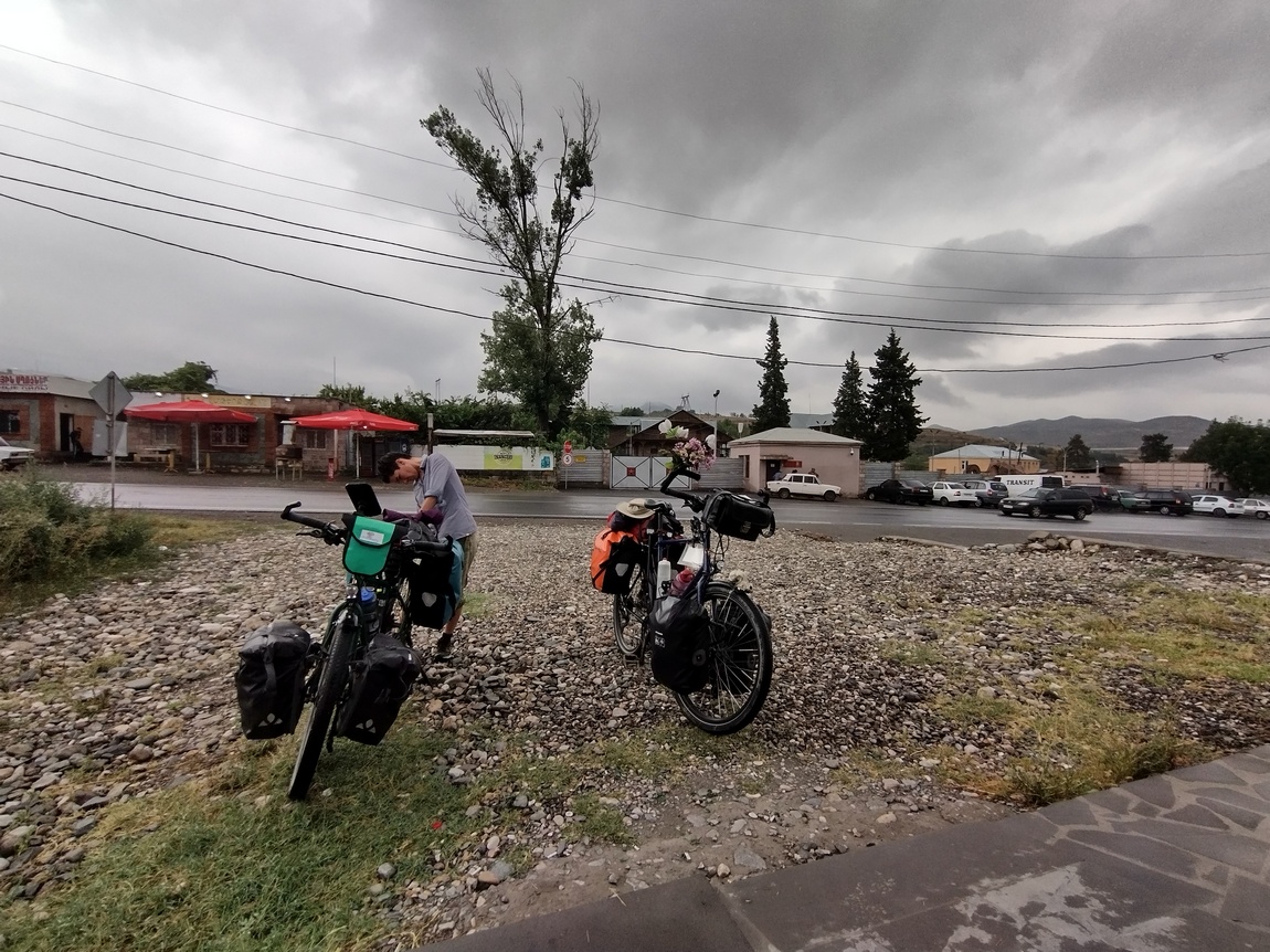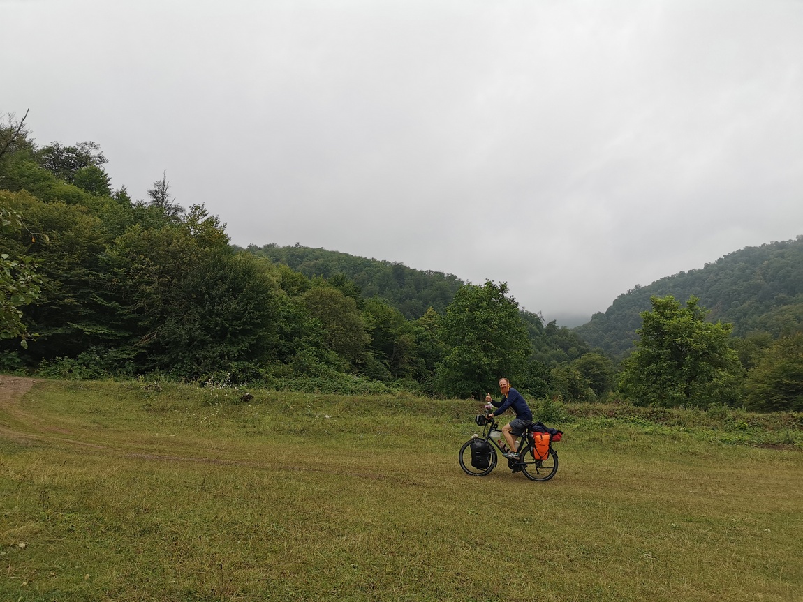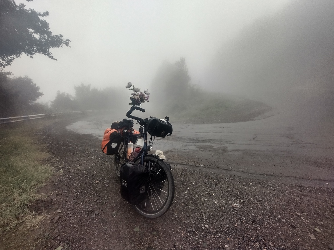 Trotz Nieselregen (in welchem wir das Frühstück einnehmen mussten, da wir das Zelt in einer Regenpause bereits abgebaut hatten) schwangen wir uns am nächsten Tag wieder auf die Räder, schließlich mussten die drei Dosen Putenfleisch an bedürftige Straßenhunde unter die Kiefer gebracht werden. In der Erwartung, dass dort die Versorgungslage unter Streunern besonders schlecht sein dürfte, entschieden wir uns bei einer Pause unter dem Vordach eines Nachtclubs sogar die große Runde durch Tavush (über Berd) zu fahren. Da wir in den folgenden zwei Tagen nur durch Nebel und Nieselregen fahren würden und von der Landschaft gerade einmal die Bäume am Wegesrand erahnen konnten, hatte sich diese Runde von ca. 100 km und 2.000 Höhenmetern (zu großen Teilen auf Schotter), die wir mit 30 km bergab hätten abkürzen können, nicht wirklich gelohnt. Ohne die Fernsicht bzw. bei teilweise Sichtweiten unterhalb der berühmt berüchtigten 50 m, erinnerte uns die Umgebung abwechselnd an das Bergische Land, der Odenwald oder den Schwarzwald. Da wir den Tipp für diese Tour von Freiburgern bekommen hatten, fragten wir uns, ob diese wohl unter Heimweh litten.