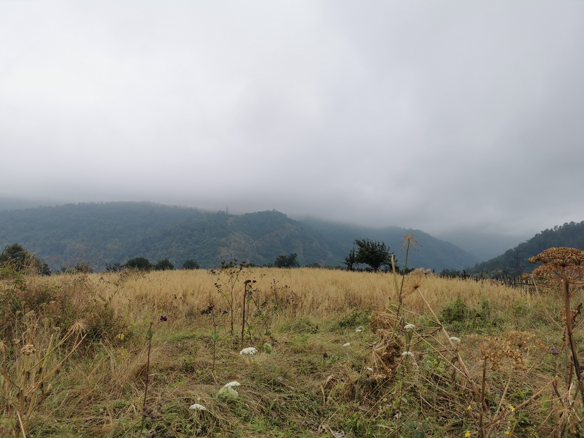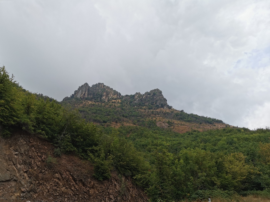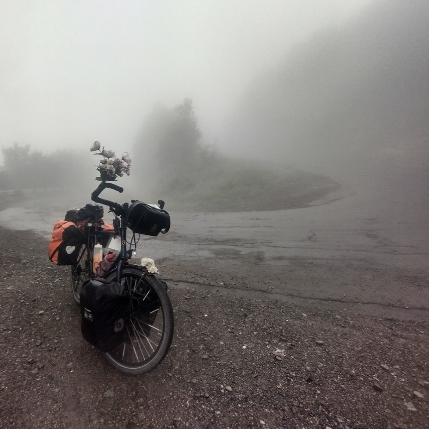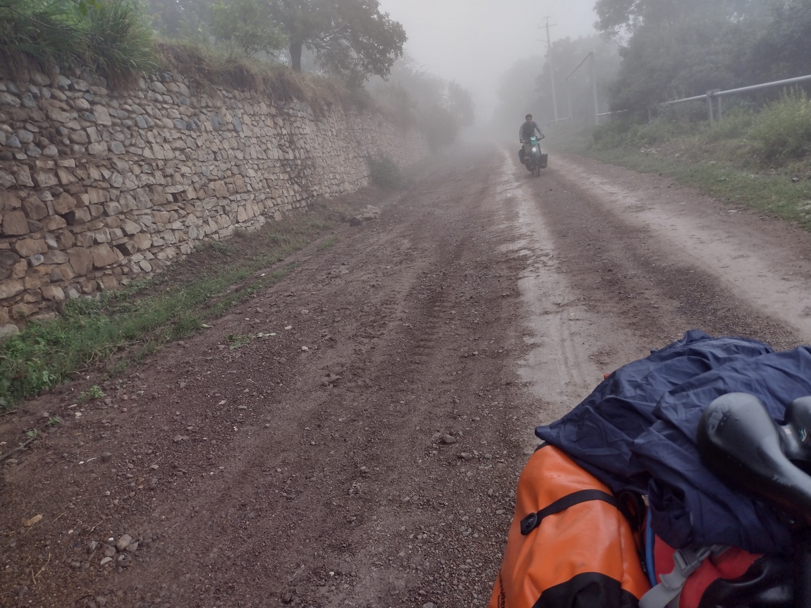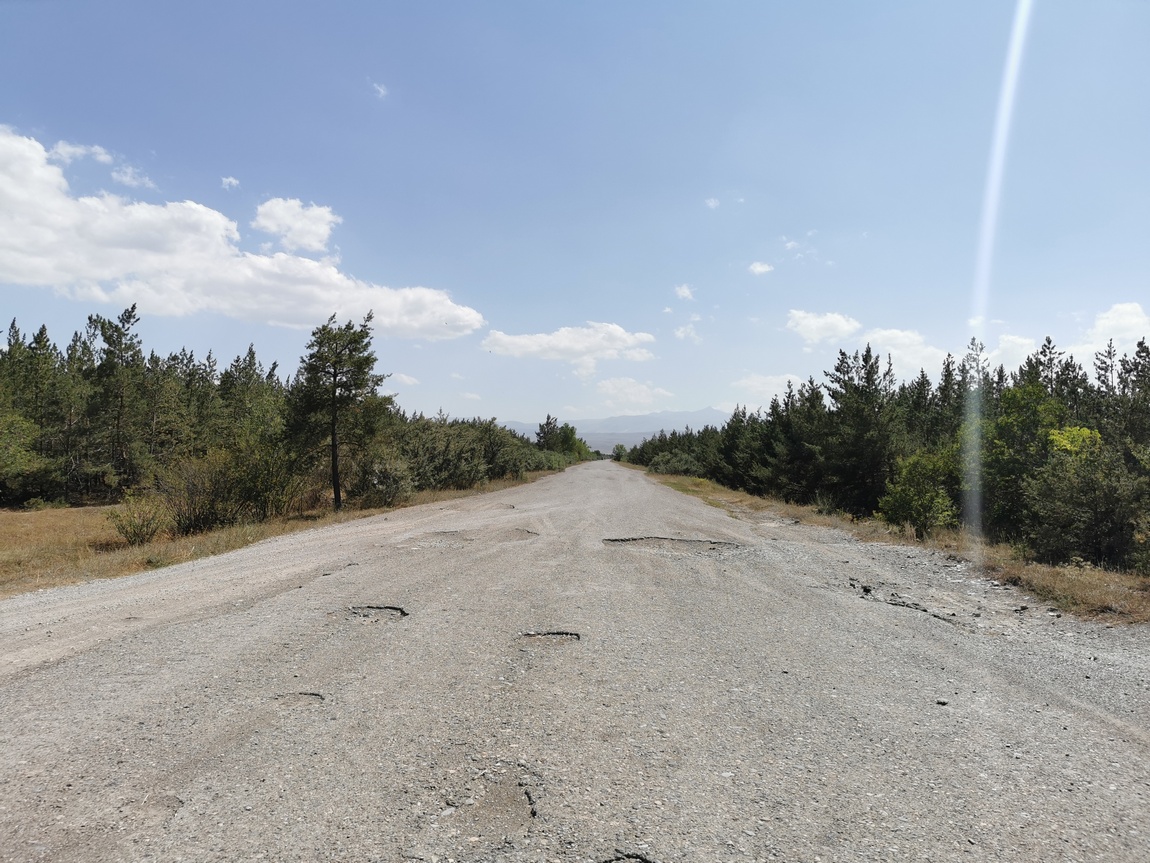 Trotz Nieselregen (in welchem wir das Frühstück einnehmen mussten, da wir das Zelt in einer Regenpause bereits abgebaut hatten) schwangen wir uns am nächsten Tag wieder auf die Räder, schließlich mussten die drei Dosen Putenfleisch an bedürftige Straßenhunde unter die Kiefer gebracht werden. In der Erwartung, dass dort die Versorgungslage unter Streunern besonders schlecht sein dürfte, entschieden wir uns bei einer Pause unter dem Vordach eines Nachtclubs sogar die große Runde durch Tavush (über Berd) zu fahren. Da wir in den folgenden zwei Tagen nur durch Nebel und Nieselregen fahren würden und von der Landschaft gerade einmal die Bäume am Wegesrand erahnen konnten, hatte sich diese Runde von ca. 100 km und 2.000 Höhenmetern (zu großen Teilen auf Schotter), die wir mit 30 km bergab hätten abkürzen können, nicht wirklich gelohnt. Ohne die Fernsicht bzw. bei teilweise Sichtweiten unterhalb der berühmt berüchtigten 50 m, erinnerte uns die Umgebung abwechselnd an das Bergische Land, der Odenwald oder den Schwarzwald. Da wir den Tipp für diese Tour von Freiburgern bekommen hatten, fragten wir uns, ob diese wohl unter Heimweh litten.
