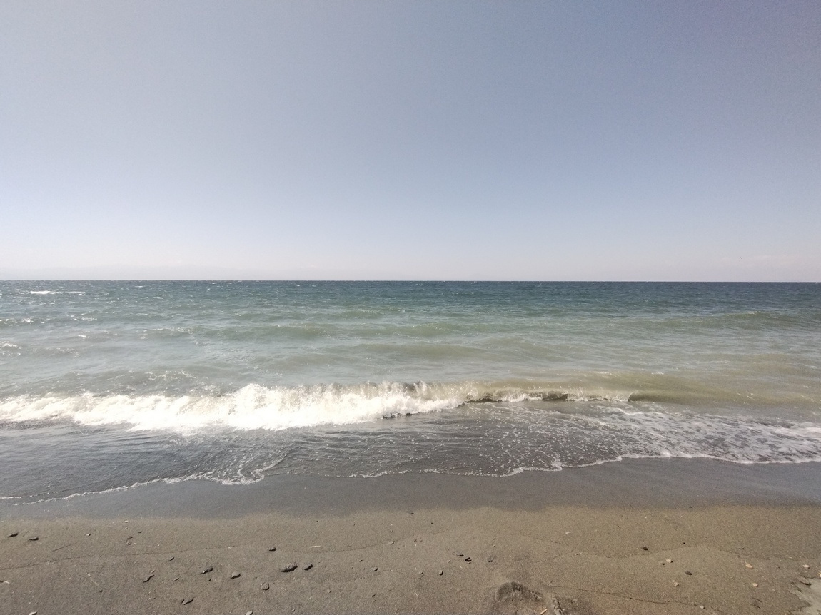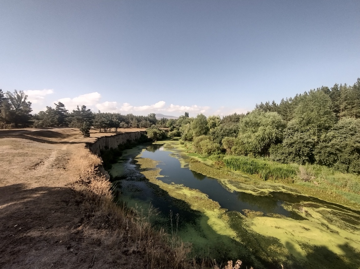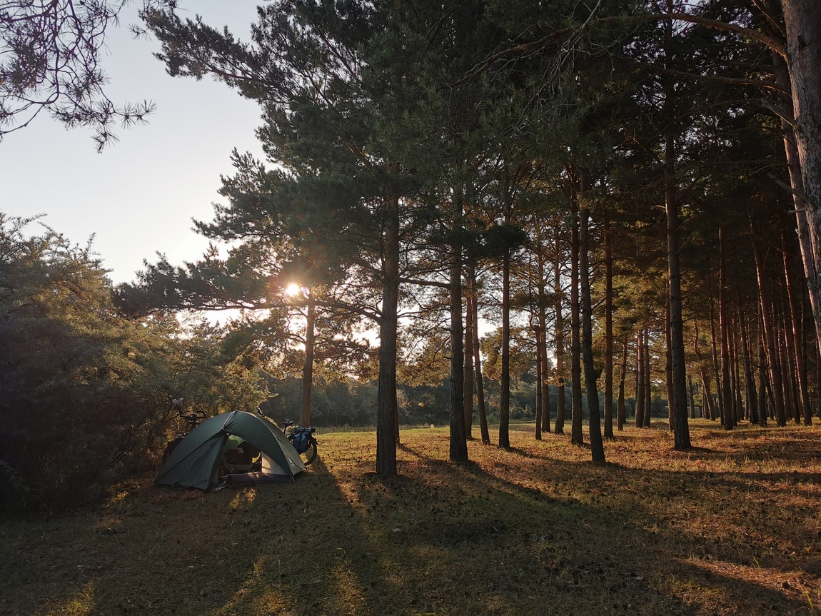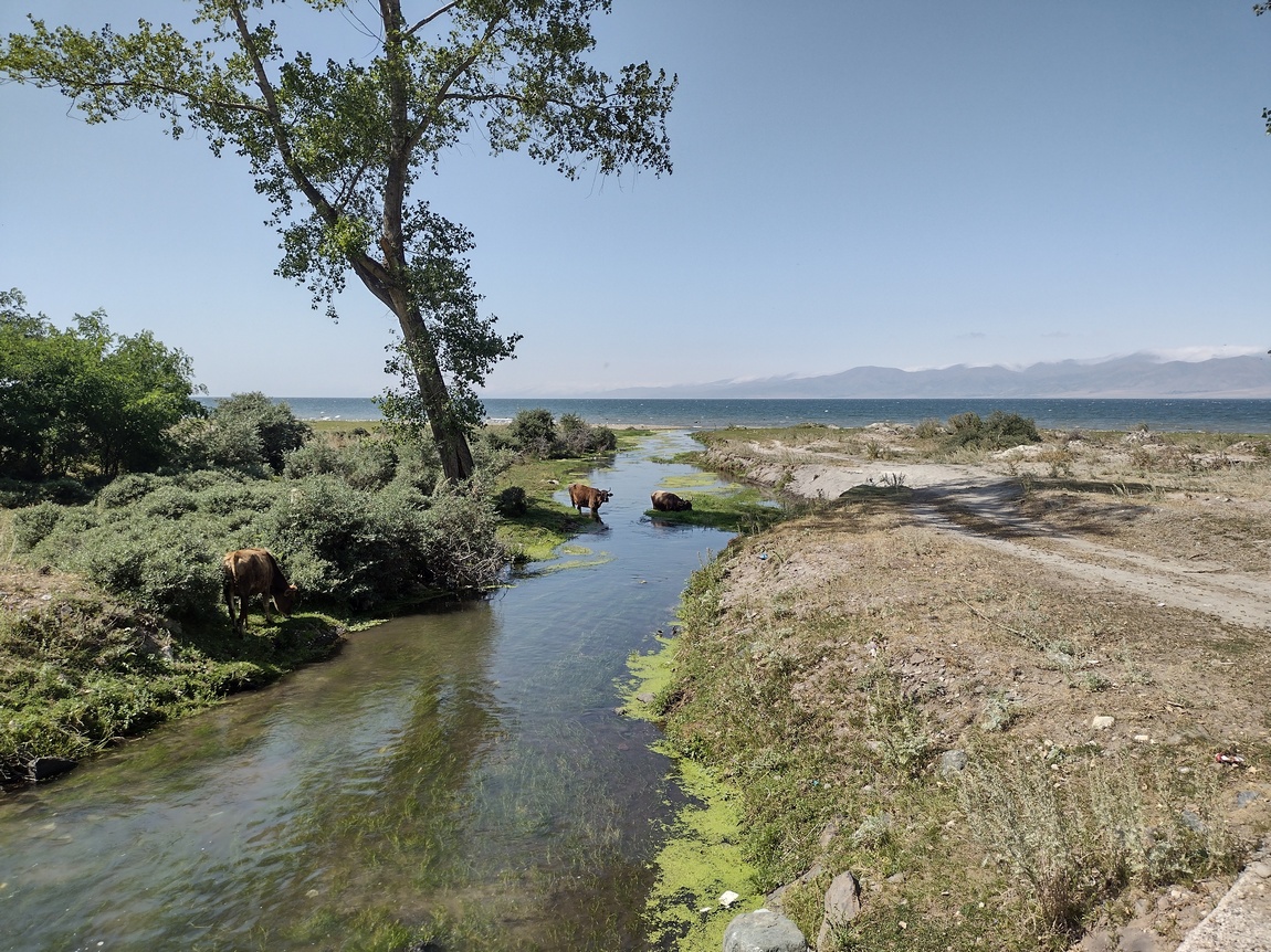 Trotz, dass der Wind aus eben dieser Richtung kam, beschlossen wir am nächsten Tag den See nach Osten hin zu umrunden, da er uns nun so freundlich empfangen hatte. Uns sollte eine größtenteils flache, gut ausgebaute Strecke mit wenig Verkehr bevorstehen. Zur Abwechslung einmal wieder ohne ernstzunehmende Steigungen fahren zu können, war durchaus angenehm, fast wie eine Bodensee-Umrundung nur ohne auf E-Bikes dahinschleichende Rentner, die einem Schlangenlinien fahrend beim Rasen behindern. Nur der Gegenwind bremste uns etwas aus, trotzdem konnte wir endlich einmal wieder die 100 km an einem Tag voll machen. Die Landschaft war erstaunlich abwechslungsreich: Dort die trockenen und kargen Felder begrenzt vom See auf der einen Seite und steppigen hohen Bergen auf der anderen Seite. Durch eben jene Berge waren wir die letzten Tage unterwegs gewesen und die Wolken die uns der Aussicht beraubt hatten, hingen noch immer am Kamm fest. Nicht weniger faszinierte uns die grünen Dörfer und Täler, die sich um Bäche und kleine Flüssen herum gebildet hatten. Ganz plötzlich gelangte man von einer Wüstenlandschaft in einen saftig grünen dichten Laubwald, der wiederum abgelöst wurde von einem auf sandigem Boden stehenden Kiefernwald. Erstaunlich war, dass die Ostseite des Sees weder touristisch noch zur Naherholung durch Einheimische genutzt wurde. Der See wirkte vielerorts vollkommen unberührt.