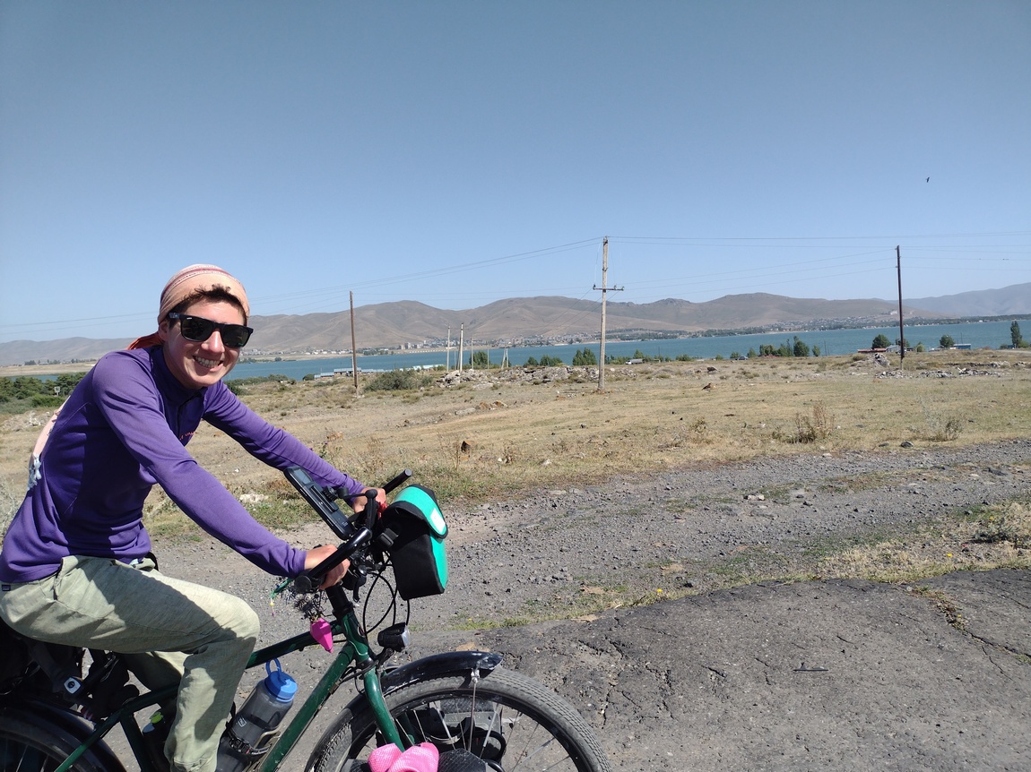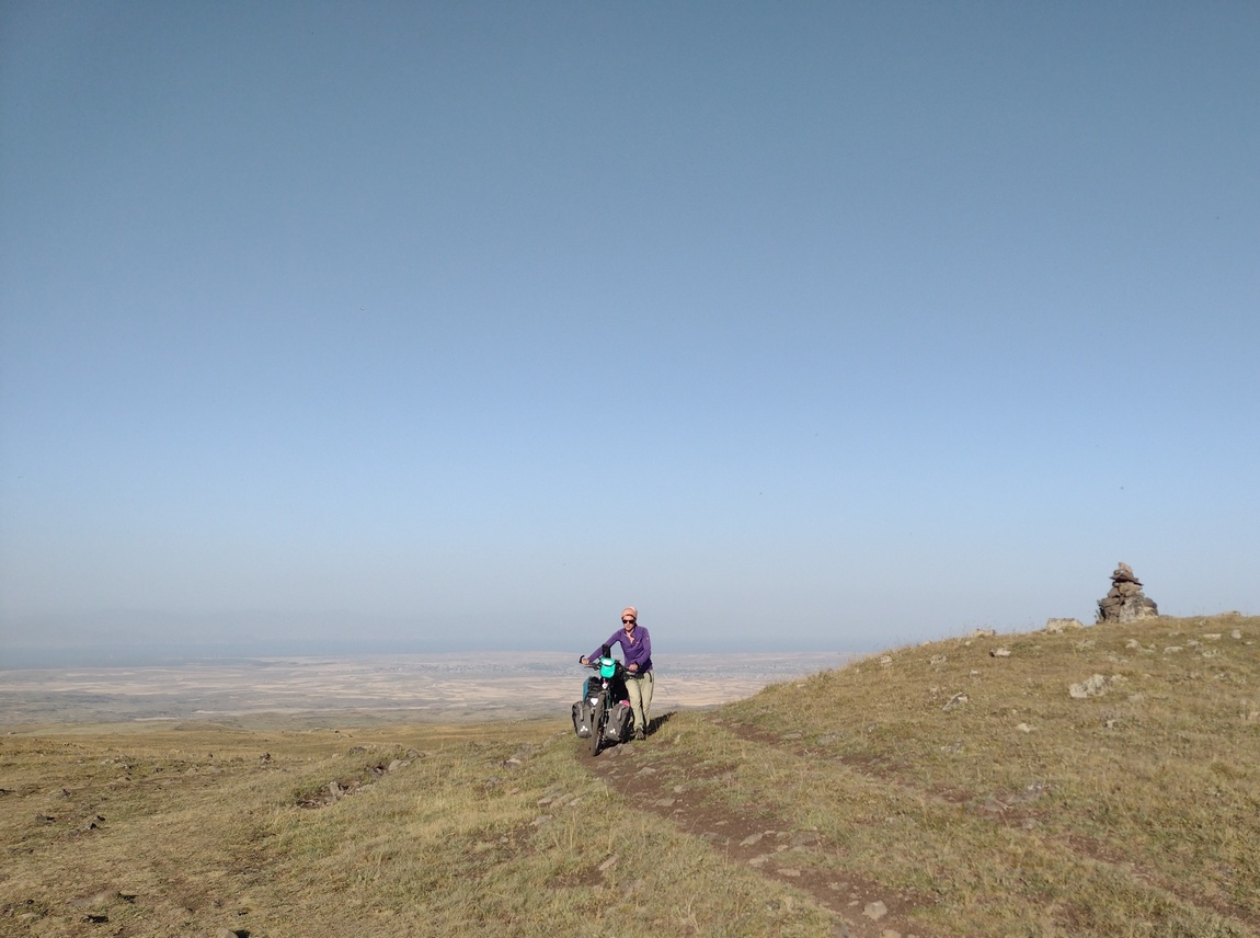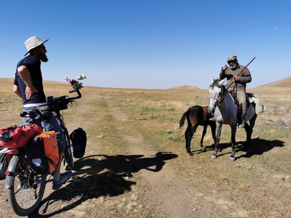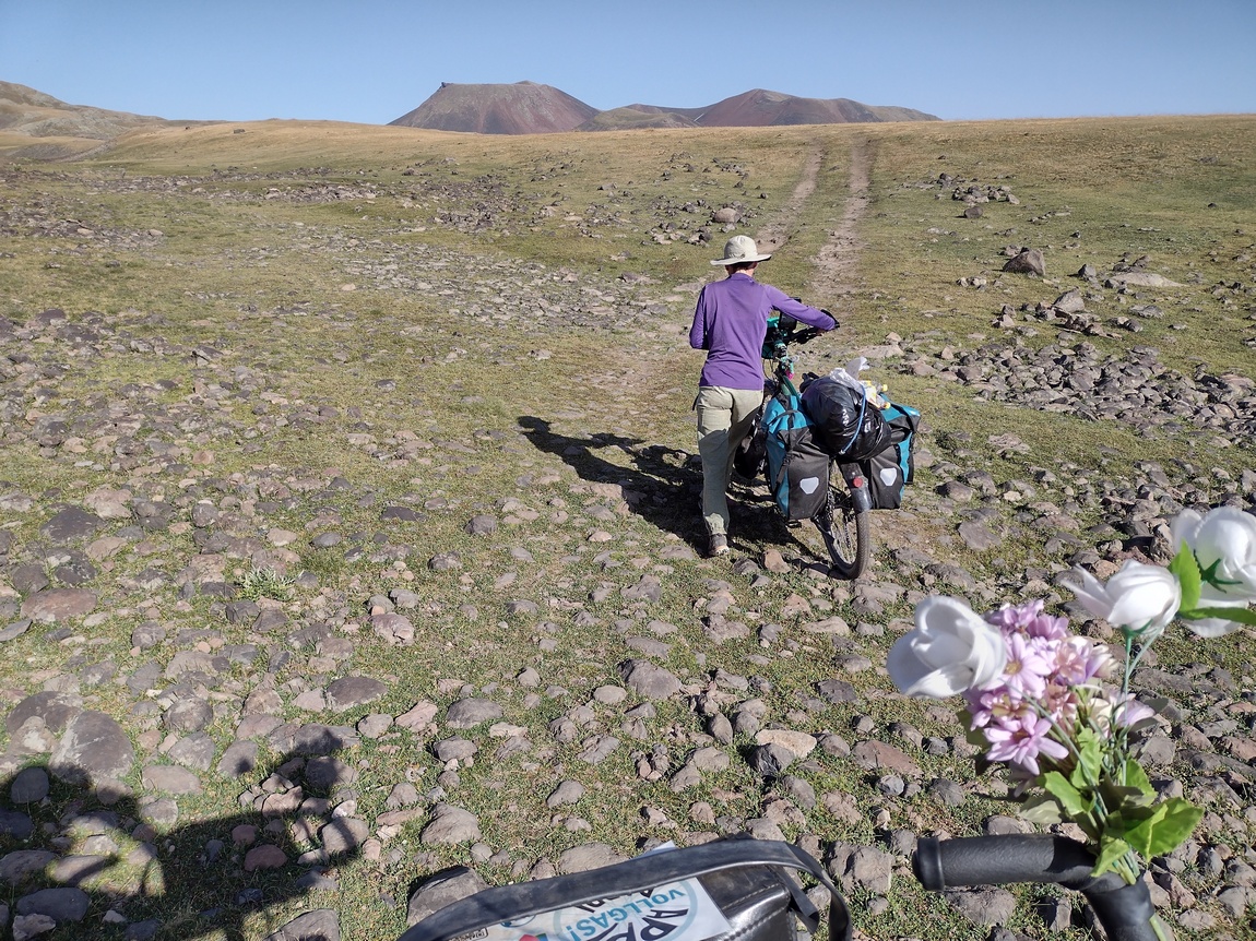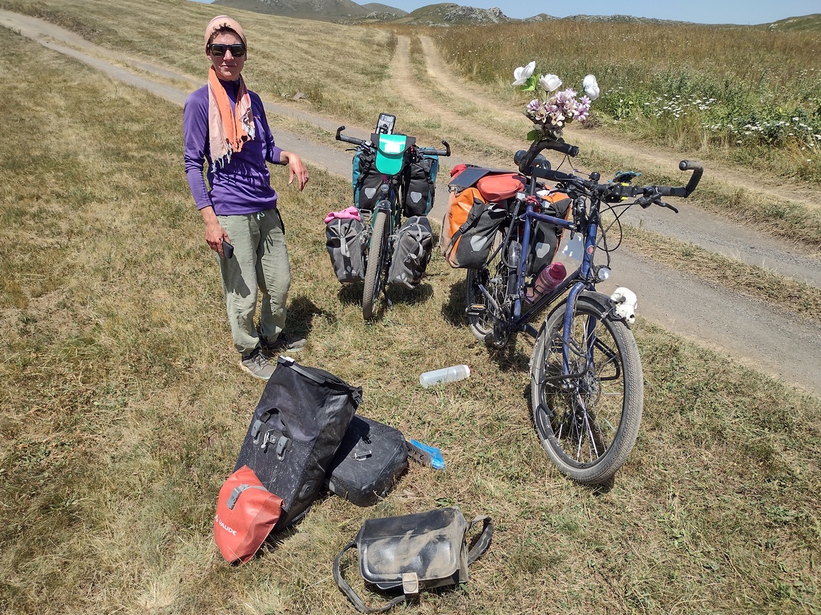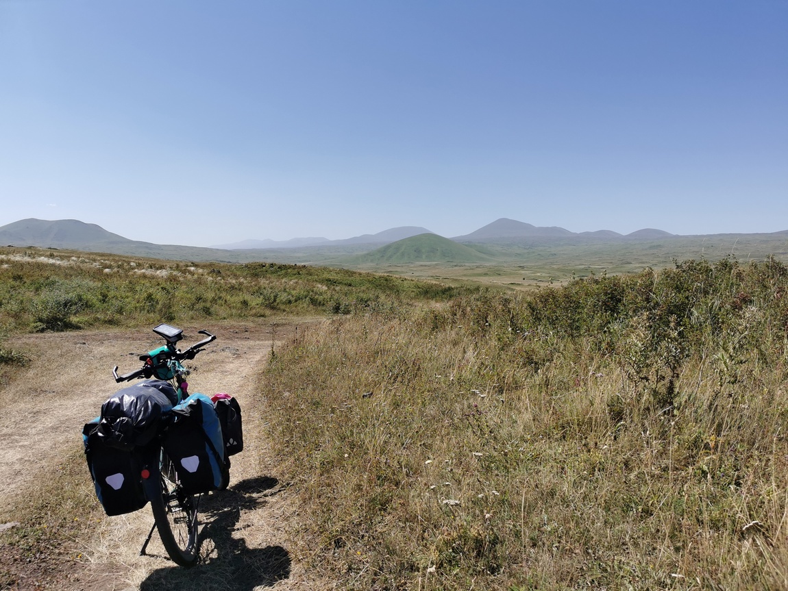 Aufgrund der schlechten Qualität des Weges (wobei es sich auf dem ge- oder abgeschnittenen Gras zumindest nicht unbequem fahren ließ), der zunehmenden Hitze und des unablässigen Anstiegs, kamen wir nur sehr langsam vorwärts, sodass das Gefühl mit der Entscheidung diesen Weg nach Eriwan zu wählen alles richtig gemacht zu haben so langsam zu schmelzen begann. Einen ersten ernsteren Dämpfer bekam das Gefühl, als Tilmann bei einer kurzen Abfahrt auf losem Untergrund die Kontrolle über sein Rad verlor und stürzte. Dabei fiel er so unglücklich, dass sein Bein irgendwo zwischen Rahmen und nach hinten gedrehtem Vorderrad eingeklemmt war. Irgendein Bauteil des Rades drückte gegen sein Knie und er konnte sich zunächst nicht befreien. Als sich dann noch der Eindruck einstellte, dass das Fahrrad mit ihm noch weiter bergab rutschen könnte kam bei der Befürchtung dies könne dazu führen, dass sein Knie weiter eingeklemmt oder verbogen werden könnte, Panik auf und er begann um Hilfe zu rufen. Dies war in zweierlei Hinsicht unsinnig, denn zum einen riskierte er nun, dass die zu Hilfe eilende Julia aufgrund eben jener Eile ebenfalls stürzte und zum anderen stellte er bei ihrem Eintreffen fest, dass er sich eben doch selbst befreien konnte und keine größeren Verletzungen, nicht einmal Schrammen davon getragen hatte. Erst als Julia das Fahrrad anhob, um es ein paar Meter weiter in den ebenen Bereich zu schieben, bemerkten wir, dass der Lenker verbogen war und befürchteten im ersten Moment und noch unter dem Schrecken des Sturzes das Schlimmste.