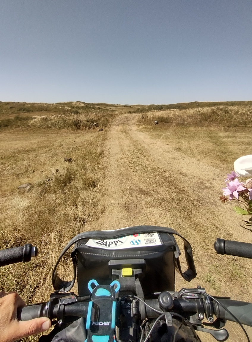 Doch die letzte halbe Stunde hatte Spuren hinterlassen und nun tat die Sonne ihr übriges, sodass wir bei der nächsten Passage bei der wir hätten schieben müssen, dringend eine Rast einlegen mussten. Da es im Umkreis von zig Kilometern kein Schatten spendendes Objekt gab, spannten wir die Greenscreen zwischen die beiden Räder und kauerten uns gemeinsam in den handtuchgroßen Schatten, den diese darunter ins Gras warf.