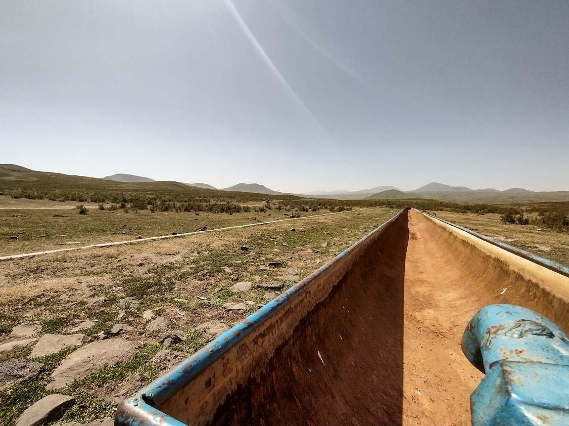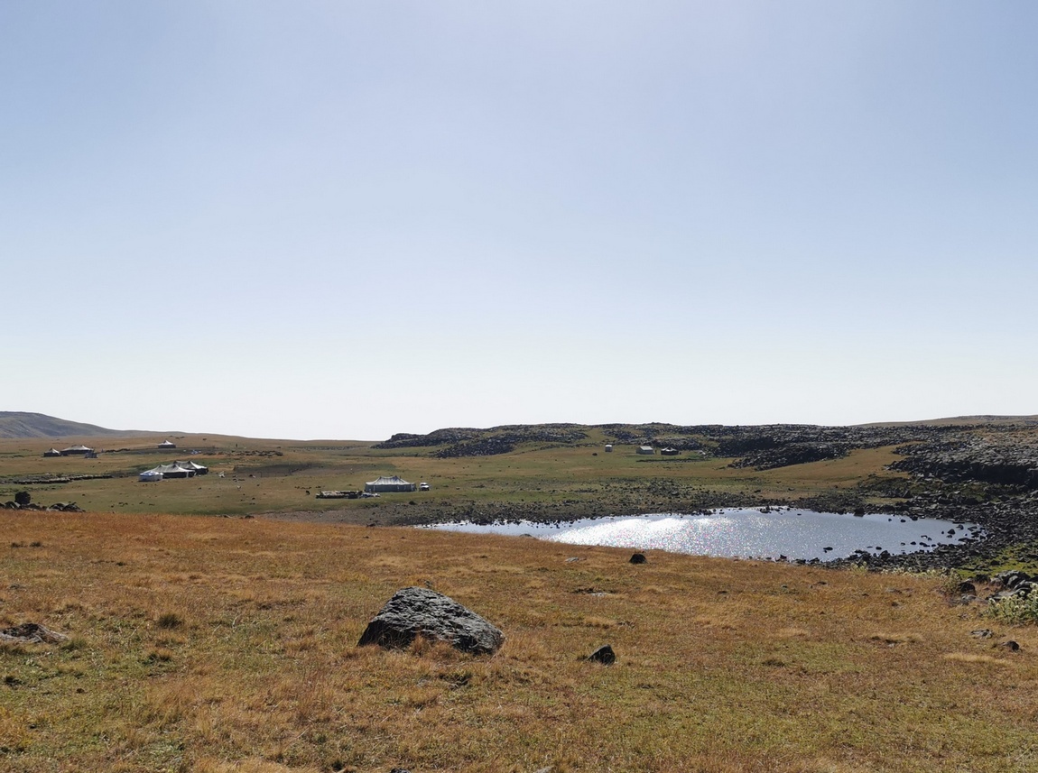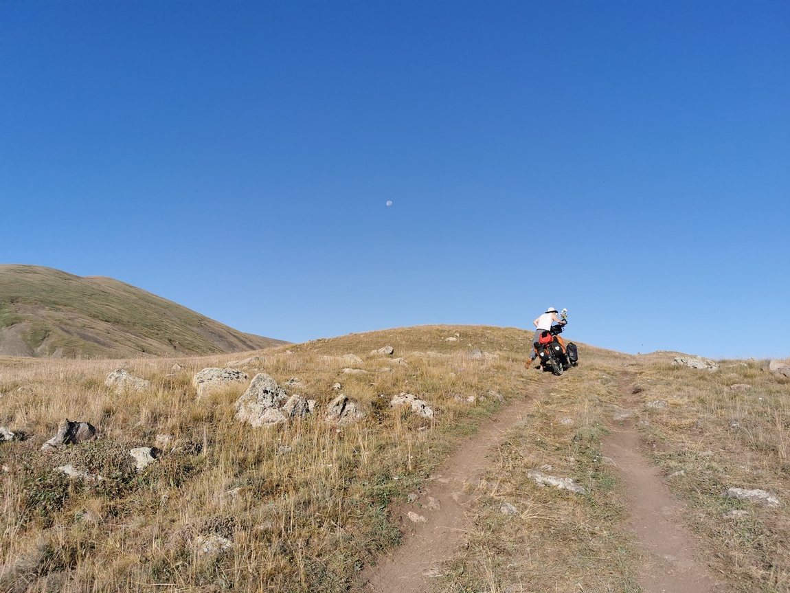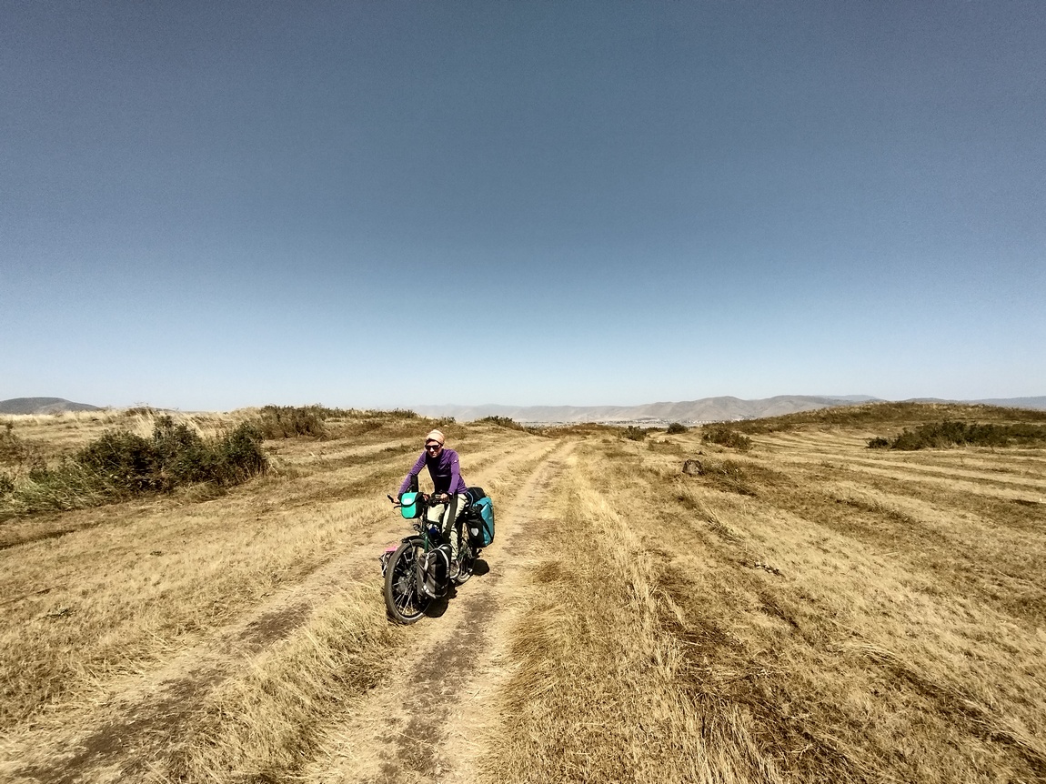 Wir kosteten den Moment eine Weile aus und machten uns dann wieder an den Abstieg, denn wir wollten nun schnellst möglich das Begham-Gebirge hinter uns lassen. Nach ca. drei Stunden waren wir zurück am Zelt und hatten die ausstehende Einladung zu Kaffee oder Tee vom Vorabend nicht eingelöst. Schnell packten wir zusammen und schwangen uns wieder auf die Räder, um noch möglichst lange bevor die Sonne den Zenit erreichte im hoffentlich schattigen Tal zu sein. Unsere Freude auf eine nun bevorstehende endlose Abfahrt wechselte jedoch sehr schnell in reine Frustration. Nicht nur standen uns zunächst noch mehrere auf der Karte nicht ersichtliche Zwischenanstiege bevor, auch wurde die Qualität der Wege immer schlechter und schlechter. Dort wo an den beiden vorangegangen Tagen die Pfade noch oft schlicht aus platt gefahrenen Streifen in der Weide bestanden hatten, waren sie nun zunehmend mit groben Basaltbrocken befüllt, die sich auch bergab mit dem Fahrrad einfach nicht befahren ließen. Wieder mussten wir regelmäßig absteigen und schieben. Als wir die Hochebene endlich verlassen hatten, bestand der Weg schließlich nur noch aus Staub und groben Brocken, sodass wir keinen einzigen Zentimeter mehr fahren wollten. Ja, wollten! Denn den ein oder anderen Abschnitt (von jeweils wenigen hundert Metern) hätte man zwar irgendwie noch fahren können, aber inzwischen wollten wir lieber ernsthafte Schäden an unseren Rädern auf den letzten Metern vermeiden.