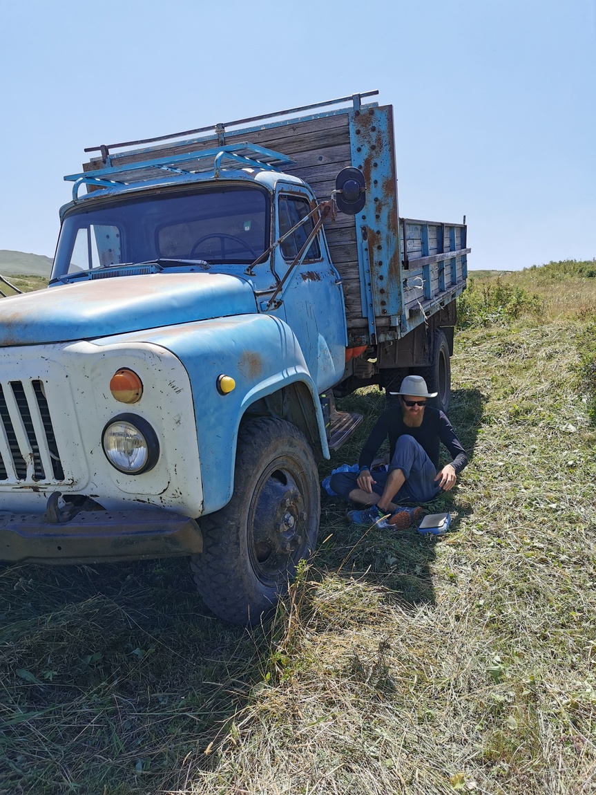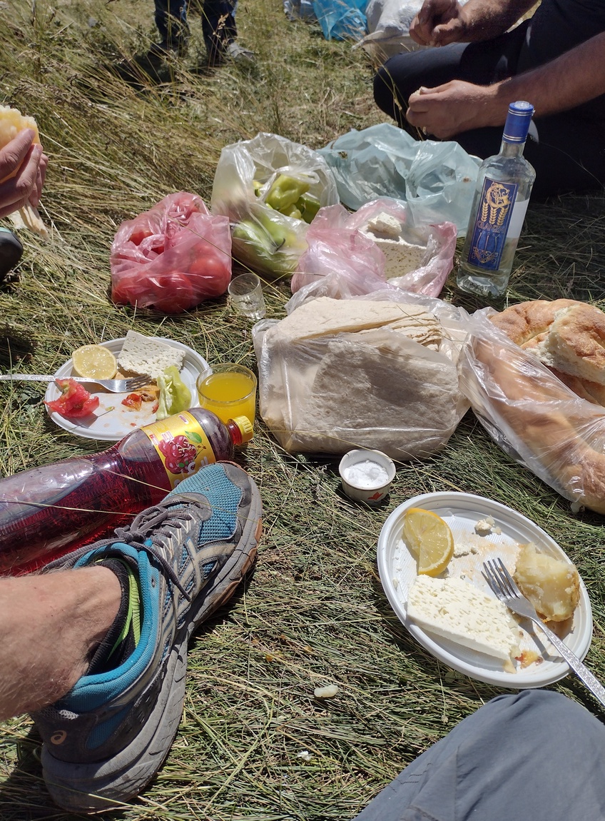 Als wir wieder aufbrachen entdeckten wir am andern Ende des Sees ein paar Zelte und Geländewagen; offensichtlich keine Halbnomaden sondern ebenfalls Touristen. Wir entschieden dort noch einmal nach Wasser zu fragen, erkannten beim näher kommen allerdings, dass es sich um Armenier handelte und befürchteten schon, dass hier schnell wieder Vodka anstatt Voda gereicht werden würde. Da uns allerdings schon zugewunken wurde erschien uns ein Rückzieher nicht ehrenhaft und so gesellten wir uns kurzerhand zu der Herrenrunde. Unsere Frage nach Voda wurde bejaht, aber zunächst einmal bekamen wir sehr reichlich Kartoffeln, Käse, Gurken, Tomaten und Wassermelone gereicht. Eigentlich waren wir nicht hungrig, denn natürlich hatten wir bei der erst wenige Minuten zurückliegenden Rast bereits zu Mittag gegessen, aber ein mit Händen und Füßen vorgetragenes „vielen Dank das reicht“ wurde mit Lachen quittiert und nicht akzeptiert.