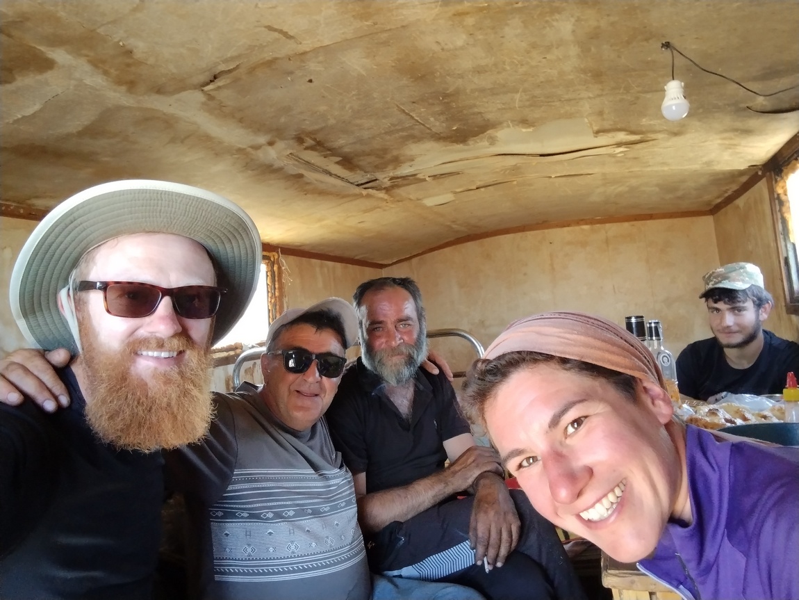 An einem kleinen See wurden wir von einer Halbnomadenfamilie herbeigewunken und nahmen die Einladung interessehalber an. Nachdem wir die Viehgatter hinter uns gelassen hatten, wurden wir in das geräumige Zelt geführt wo sogleich Kaffee und Wassermelone gereicht wurde. Auch wurde aus Wasser kein Wässerchen und so blieben wir glücklicherweise nüchtern. Das spendierte Wasser hatte geschmacklich allerdings, wie wir später feststellen sollten, deutliche Nuancen des Geruchs im Zelt: Eine Mischung aus Paarhufer, Fett und Holzbrand. Der Herr des Zeltes sprach ein paar Brocken Englisch und so erfuhren wir, dass sich die Familie drei bis vier Monate im Jahr in den Bergen aufhielt, 20 Kühe und 400 Schafe besaß und dass er Real Madrid Fan war.