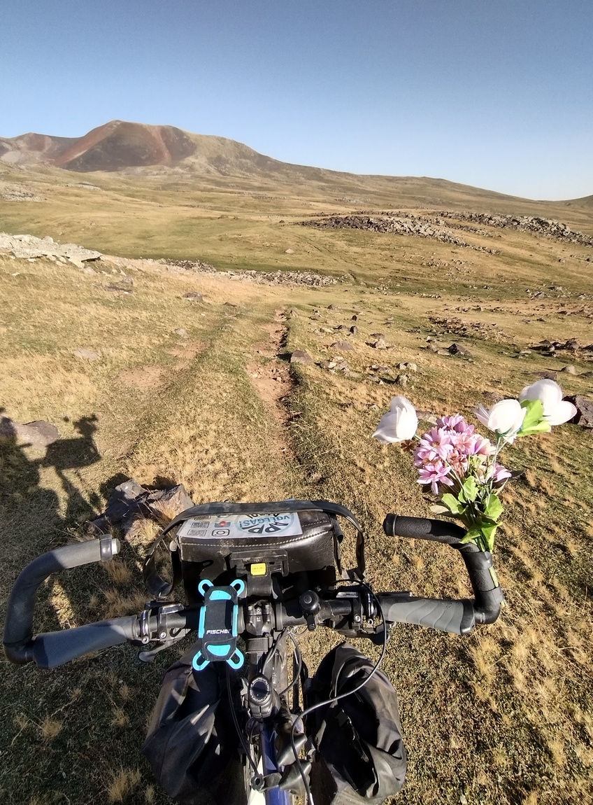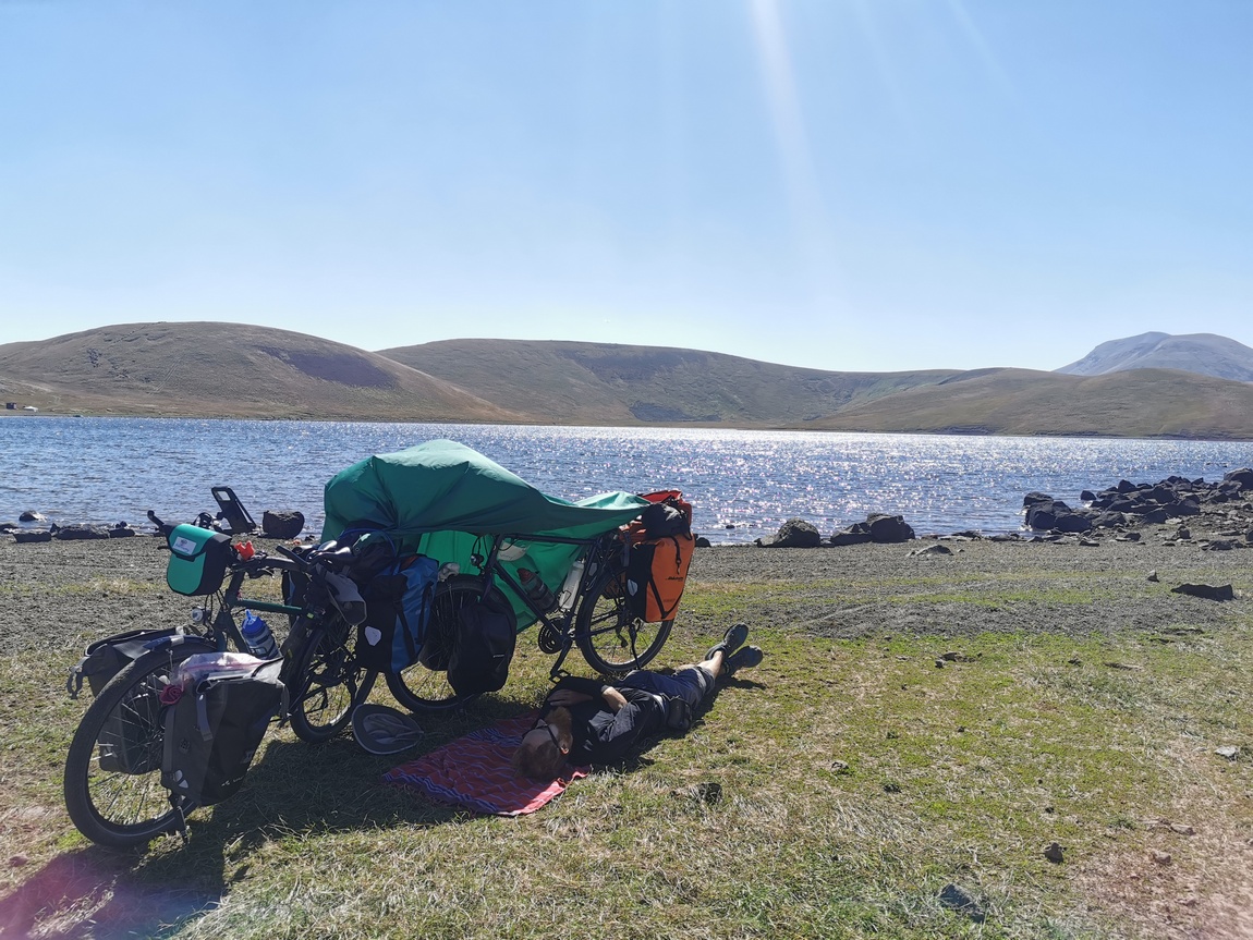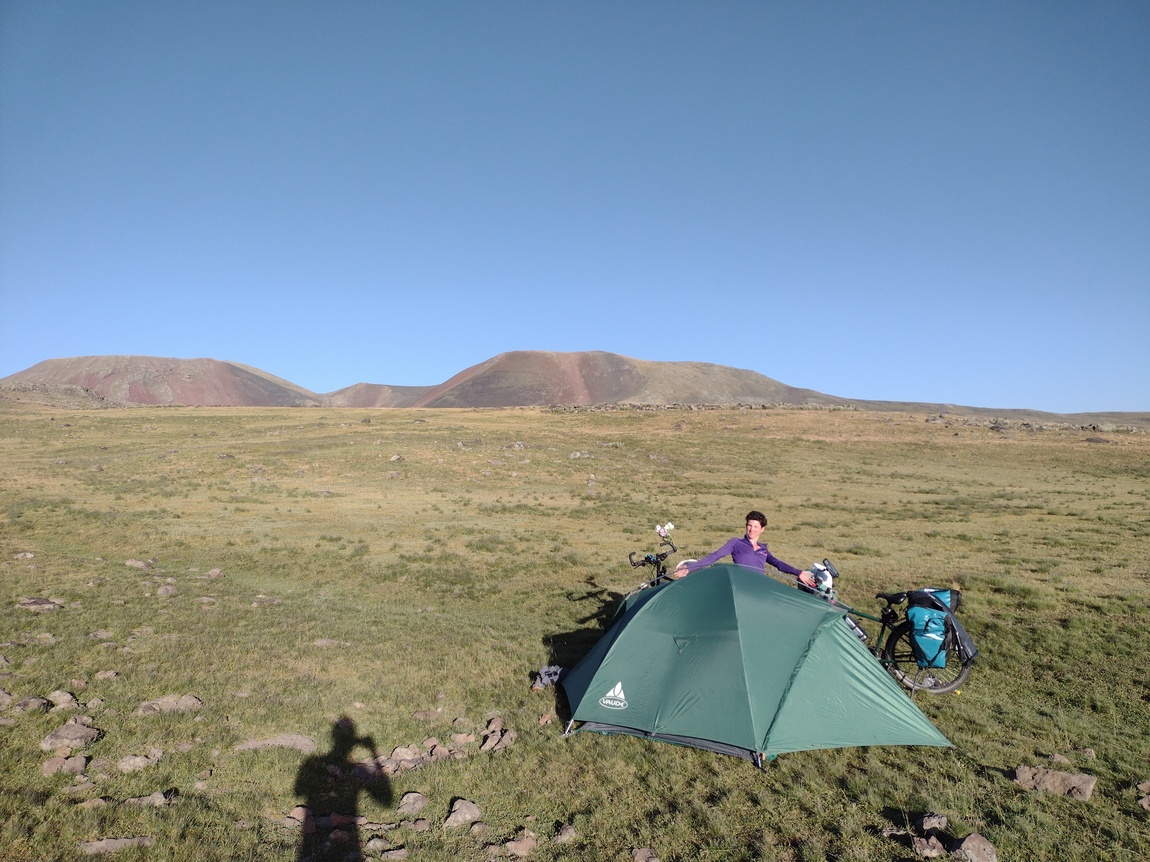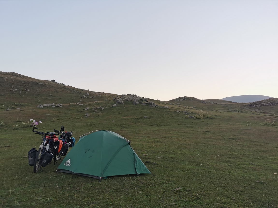 Nachdem wir uns artig bedankt hatten und weitergezogen waren, fuhren und schoben wir unsere Räder weiter über die Hochebene bis wir gegen sechs Uhr den Abzweig zum Wanderweg rauf auf den Azhdahak erreichten. Dort schlugen wir unser Zelt so auf, dass wir von der nächsten uns ersichtlichen Zelt-Stadt genau nicht mehr gesehen werden konnten und Tilmann schlüpfte, so wie alles gerichtet war, todmüde in seinen Schlafsack, während Julia noch letzte Handgriffe an ihren Packtaschen vornahm. Obwohl wir quasi den ganzen Tag unterwegs gewesen waren, hatten wir nur gut 23 km hinter uns gebracht. Wir scherzten noch darüber, dass wir es noch bis zum Nachmittag des Vortages für möglich gehalten hatten, dass wir am frühen Nachmittag des zweiten Tages den Azhdahak erklimmen und bis zum Abend in Jerewan hätten sein können, denn nach dem sechst höchsten Berg in Armenien ging es schließlich nur noch bergab. Noch ahnten wir aber nicht, wie weit wir davon tatsächlich entfernt waren.