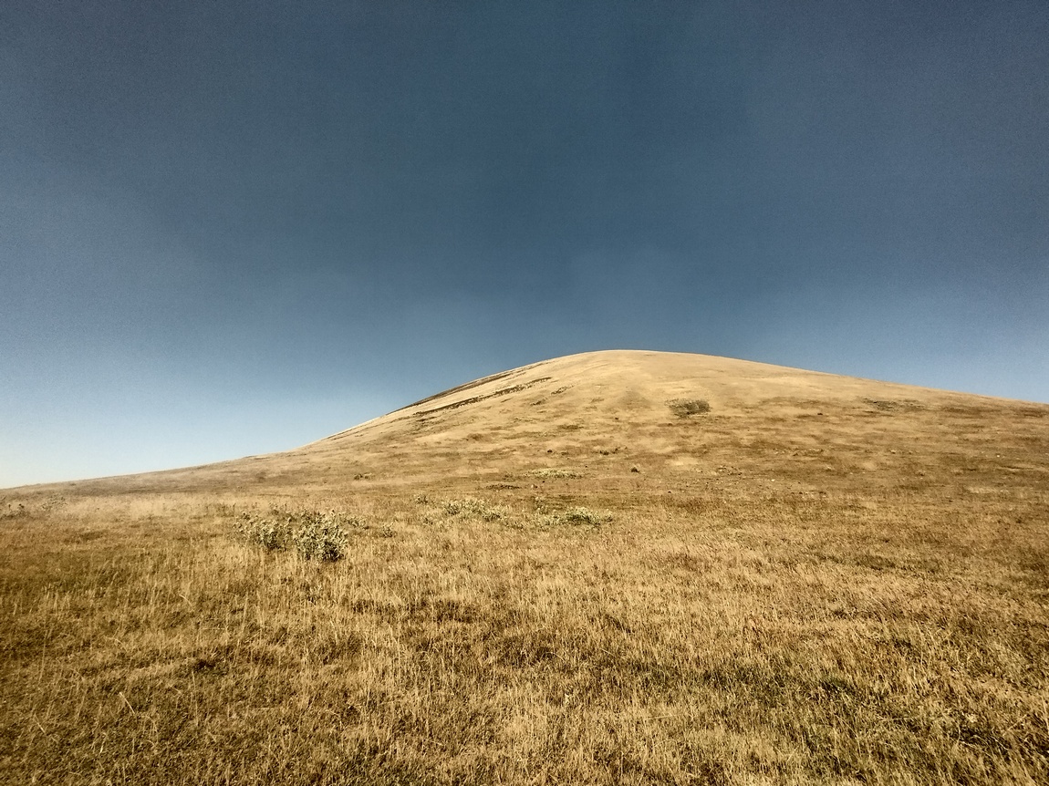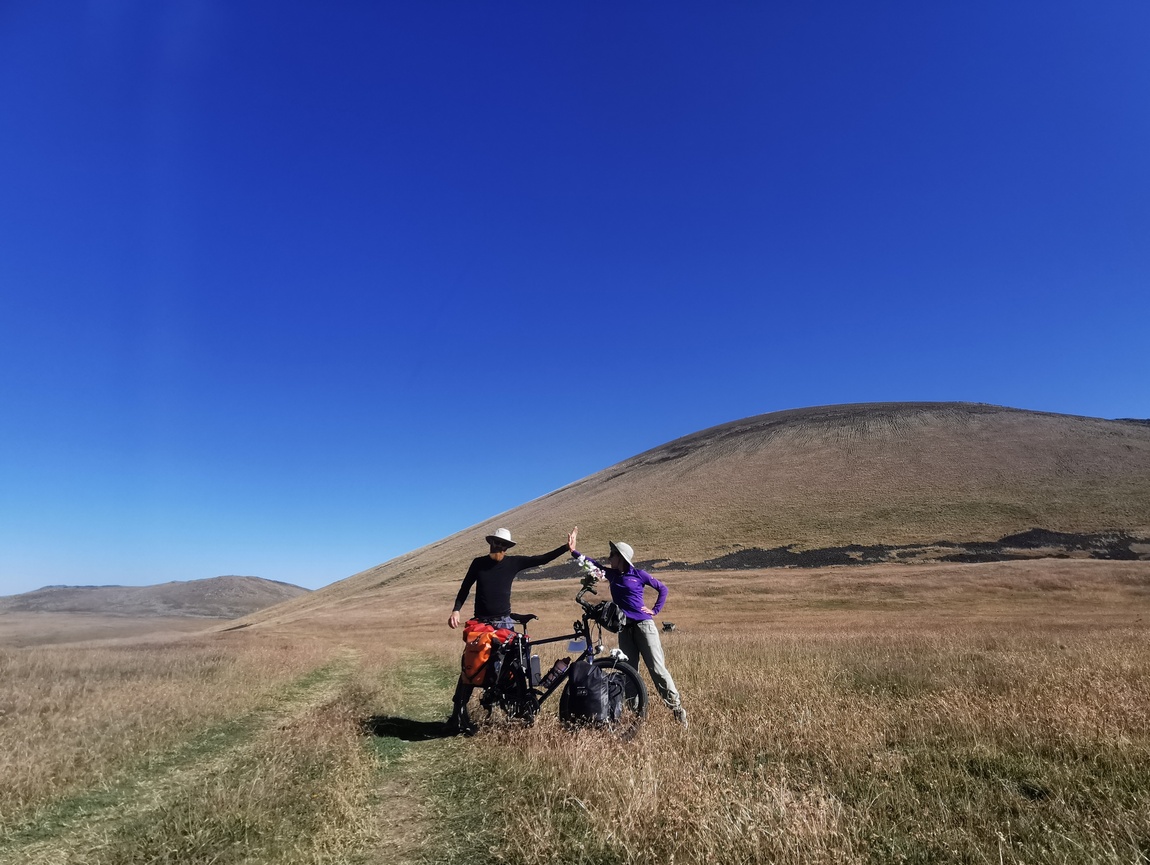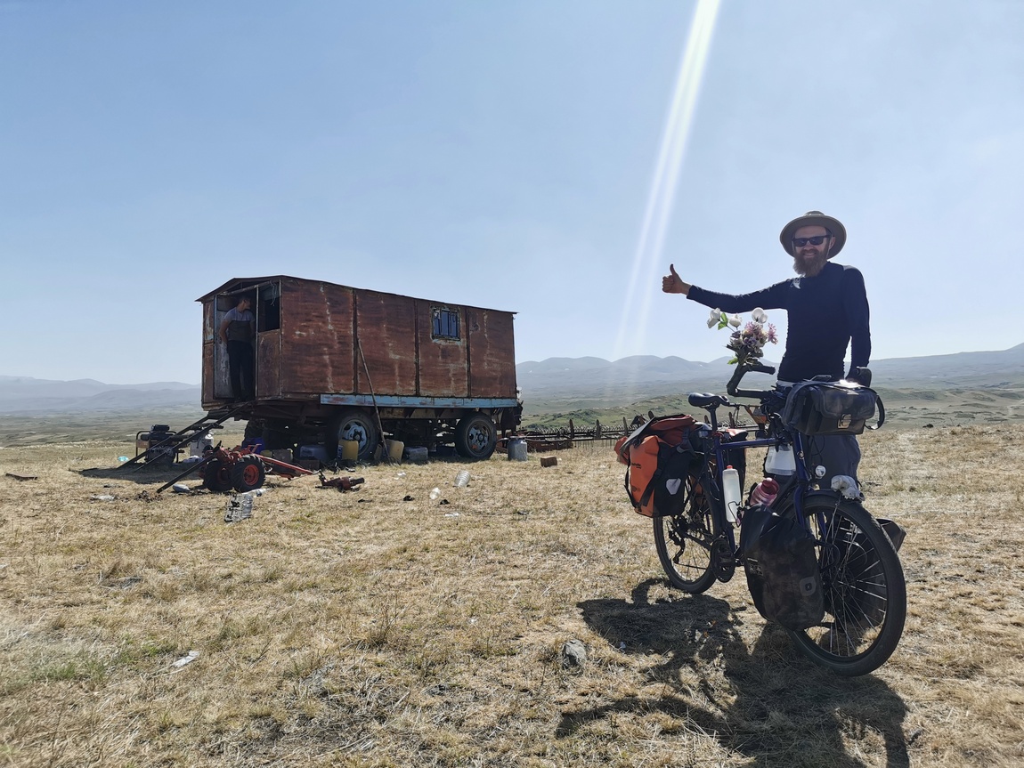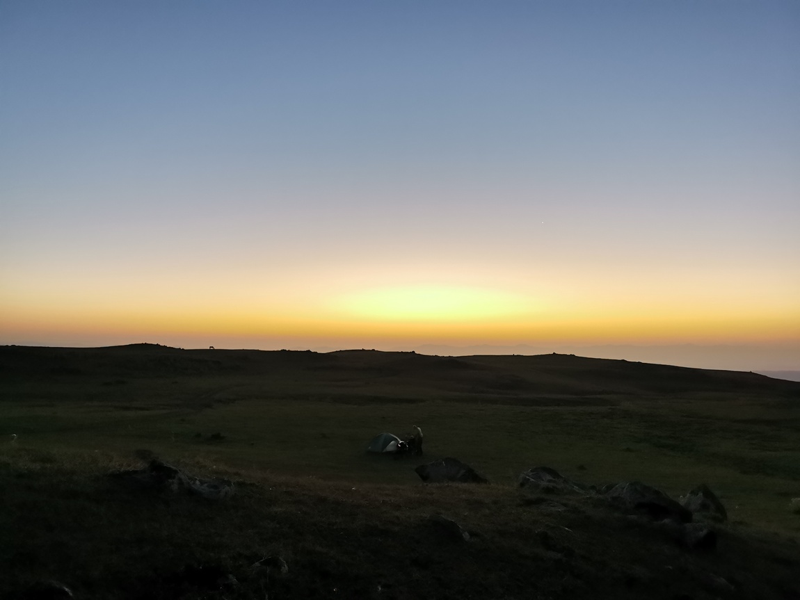Nachdem wir uns artig bedankt hatten und weitergezogen waren, fuhren und schoben wir unsere Räder weiter über die Hochebene bis wir gegen sechs Uhr den Abzweig zum Wanderweg rauf auf den Azhdahak erreichten. Dort schlugen wir unser Zelt so auf, dass wir von der nächsten uns ersichtlichen Zelt-Stadt genau nicht mehr gesehen werden konnten und Tilmann schlüpfte, so wie alles gerichtet war, todmüde in seinen Schlafsack, während Julia noch letzte Handgriffe an ihren Packtaschen vornahm. Obwohl wir quasi den ganzen Tag unterwegs gewesen waren, hatten wir nur gut 23 km hinter uns gebracht. Wir scherzten noch darüber, dass wir es noch bis zum Nachmittag des Vortages für möglich gehalten hatten, dass wir am frühen Nachmittag des zweiten Tages den Azhdahak erklimmen und bis zum Abend in Jerewan hätten sein können, denn nach dem sechst höchsten Berg in Armenien ging es schließlich nur noch bergab. Noch ahnten wir aber nicht, wie weit wir davon tatsächlich entfernt waren.