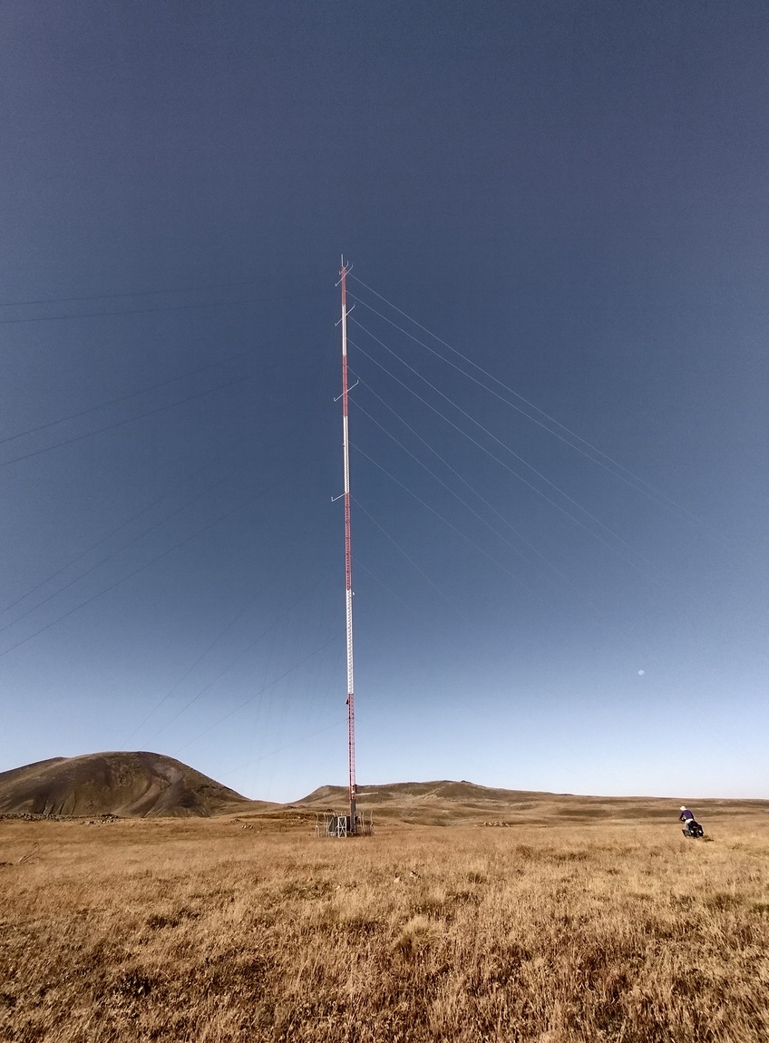 So schleppten wir uns mehr schiebend als fahrend und mehr fluchend als atmend Zentimeter um Zentimeter den Berg hinauf. Nach etwa 6 km flachte das Gelände etwas ab und wir konnten wieder ein wenig fahren. Plötzlich tauchte ein riesiger abgespannter Sendemast vor uns auf, der den ersten „Gipfel“ in etwa 3110 m Höhe markierte und der an diesem Ort reichlich deplatziert wirkte. Ansonsten fing die Landschaft nun langsam an wirklich interessant zu werden, denn links und rechts des Weges ragten nun die ersten Vulkane empor, die in ihrer regelmäßig geformten Gestalt wie menschlich erschaffen wirkten. Inzwischen staunten wir über die hohe Zahl an ansässigen Halbnomaden, hatte der Franzose, der uns ins Verderben geschickte doch in Aussicht gestellt, dass wir dort oben niemanden antreffen würden. Auch wenn unsere Verwünschungen ihm gegenüber nicht abebbten, wollen wir ihm nun doch nicht unterstellen, dass er die lokale Bevölkerung unter „niemanden“ subsumiert hatte, sondern lediglich ein wenig übertrieben hatte. Zum Aknalich-See ging es dann wieder ein Stück bergab und dort angekommen stellten wir fest, dass sich sein Wasser nicht wirklich zum Abkochen geeignet hätte. Nicht nur siedelten in seiner Peripherie einige Familien, auch wurde das Wasser selbstverständlich zur Viehtränkung verwendet, sodass das Ufer sehr schlammig war. Selbst Micropur oder ein Wasserfilter hätten ihre liebe Mühe gehabt. Trotz relativ frühem Aufbruch hatten wir nun bis zur Mittagszeit lediglich 10 km geschafft und waren selbst geschafft. Unter Einsatz der Greenscreen und der Räder errichteten wir eine Mischung aus Wind- und Sonnenschutz am Ufer des Sees und versuchten mehr schlecht als recht uns ein wenig zu erholen.