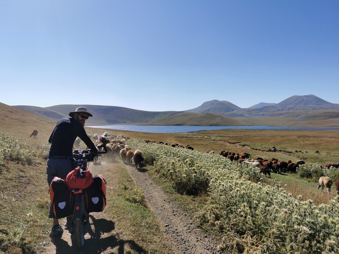 Auf Empfehlung einer reisenden Familie aus Frankreich, die wir am Sevan See getroffen hatten, entschieden wir uns nach einigen Abwägungen nicht die einfache Route über den Highway nach Eriwan zu nehmen, sondern einen Offroad-Trip durch das Begham-Gebirge zu wagen. Dabei sollten wir mit den Rädern auf über 3.000 m emporklimmen und schließlich zu Fuß noch den Gipfel des Azhdahak (3.597 m) erreichen. Das Ganze sollte sich in einer spektakulären Vulkan-Landschaft abspielen. Wir bekamen eine GPS-Route zur Verfügung gestellt und wurden ermahnt uns peinlichst an diese zu halten, da es in der Gegend aufgrund der landwirtschaftlichen Nutzung durch sogenannte Nomaden von Wegen nur so wimmelte.
