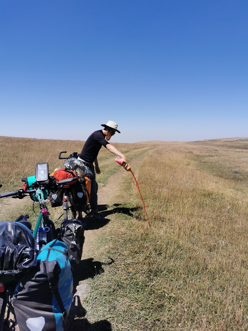 Und wenig überraschend kreiste gleichzeitig schon wieder die Vodka-Flasche. Um das Gesicht zu wahren, ließen wir uns auf odin malen’ky (einen kleinen) ein, was wiederum mit einem Lachen quittiert und nicht akzeptiert wurde. Wie ihr euch nun sicher denken könnt, blieb es weder bei einem noch kleinen und so waren wir im Nullkommanichts schon wieder betrunken und jetzt zudem auch vollgestopft. Irgendwann konnten wir uns losreißen, bekamen diesmal sogar tatsächlich auch Wasser, allerdings zusätzlich eine Tüte mit zwei 1,5 Liter Flaschen warmer Kirschlimonade, etlichen Lappen Lavash, Tomaten, Gurken, Zitrone und ein großes Stück Käse als Care-Paket mit auf den Weg. Somit hatte die Tüte natürlich ein erhebliches Gewicht, aber ein Ablehnen kam selbstverständlich nicht in Frage.