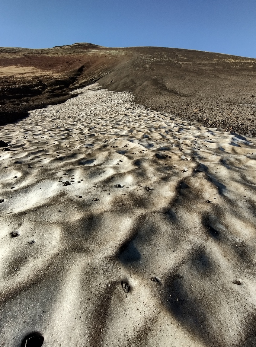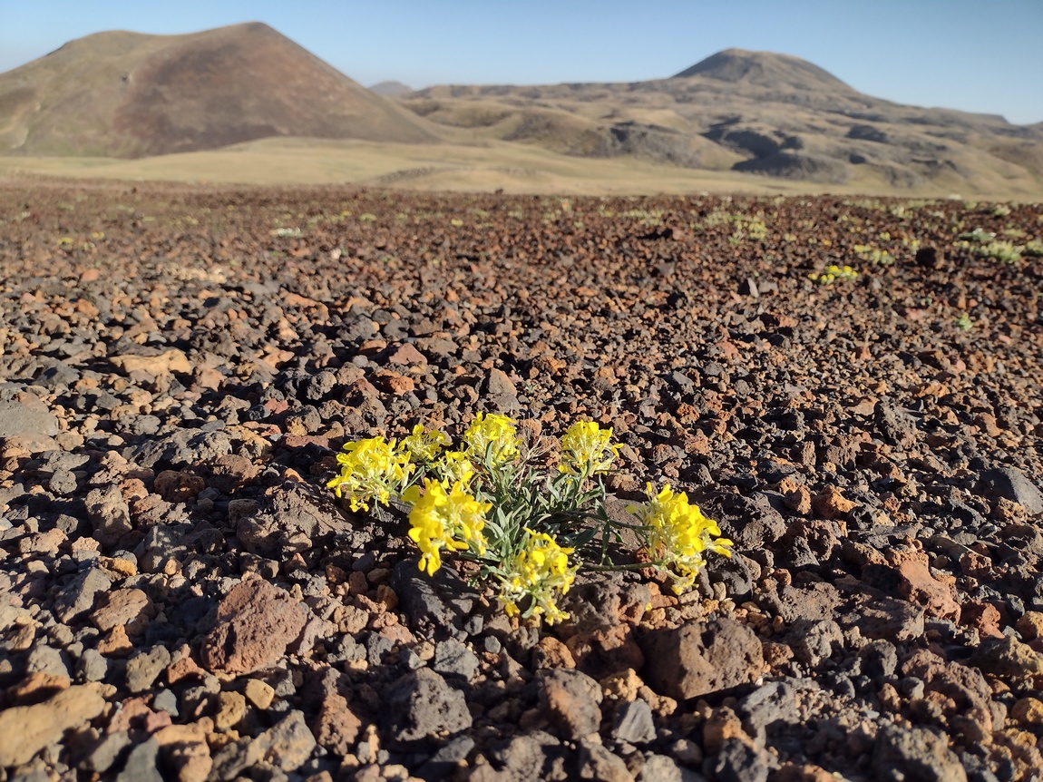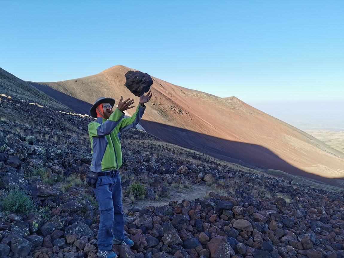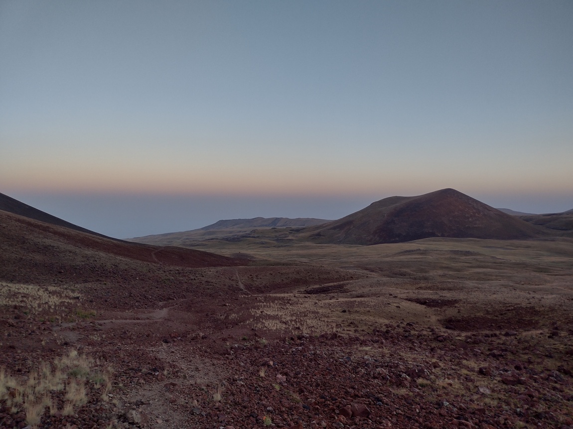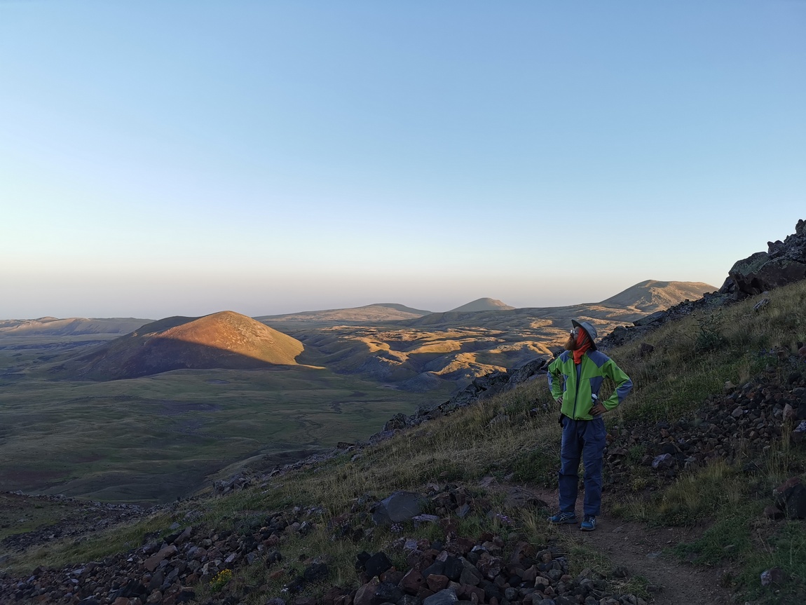So führten wir unseren Weg unbeirrt weiter und erreichten bald die ersten Basalt-Felder. Obwohl der Weg nicht immer einfach zu finden war und wir ihn mehrfach verloren, kamen wir recht einfach voran da es sich um einfaches Terrain handelte. Dabei betrachteten wir fasziniert die unter uns liegende Landschaft, die Stück für Stück von den ersten Sonnenstrahlen erobert wurde. Wir liefen glücklicherweise gen Osten und damit im Schatten des Azhdahak. Mit Überraschung stellten wir fest, wie hoch sich Reifenspuren an den Berghängen finden ließen. Bei der Vorstellung wir müssten auf diesem Untergrund und bei dieser Steigung ein motorisiertes Fahrzeug steuern wurde uns ganz mulmig.