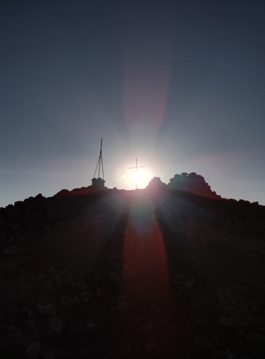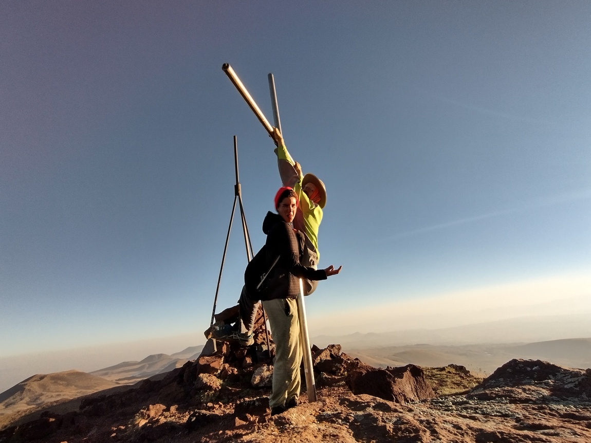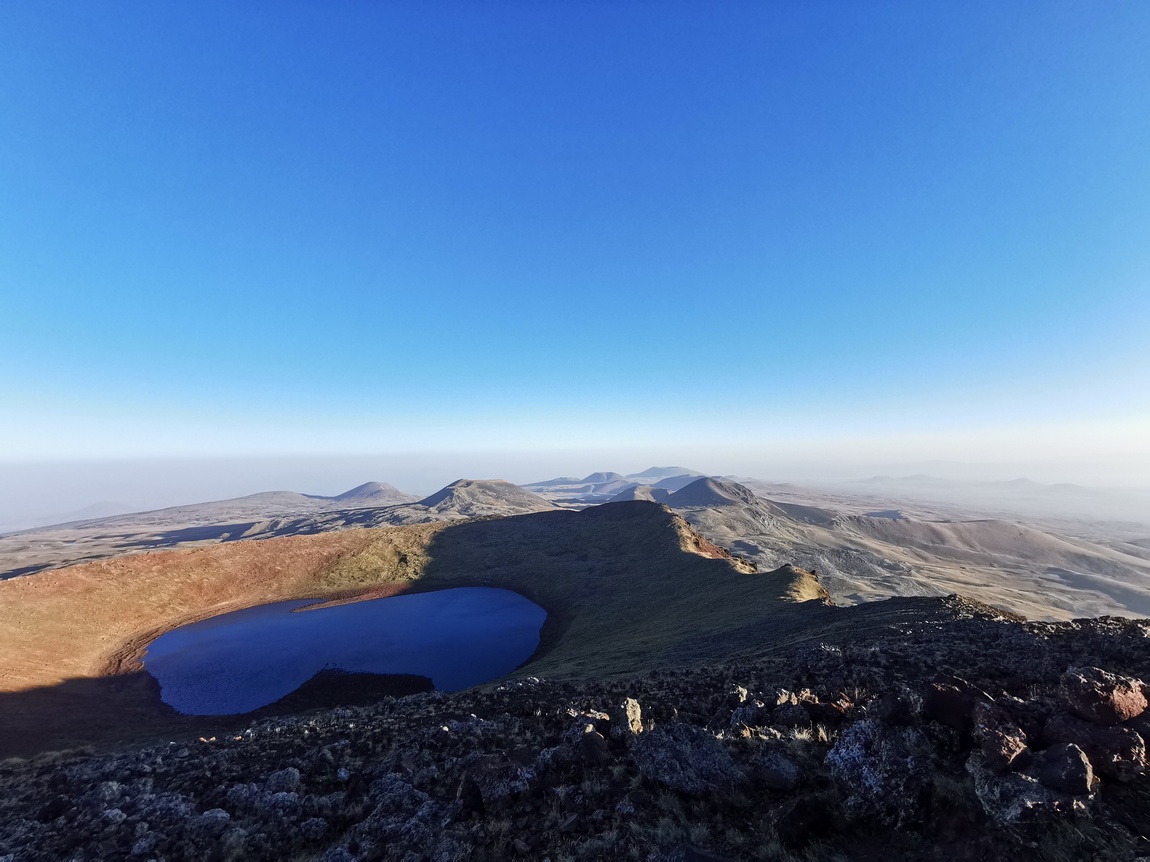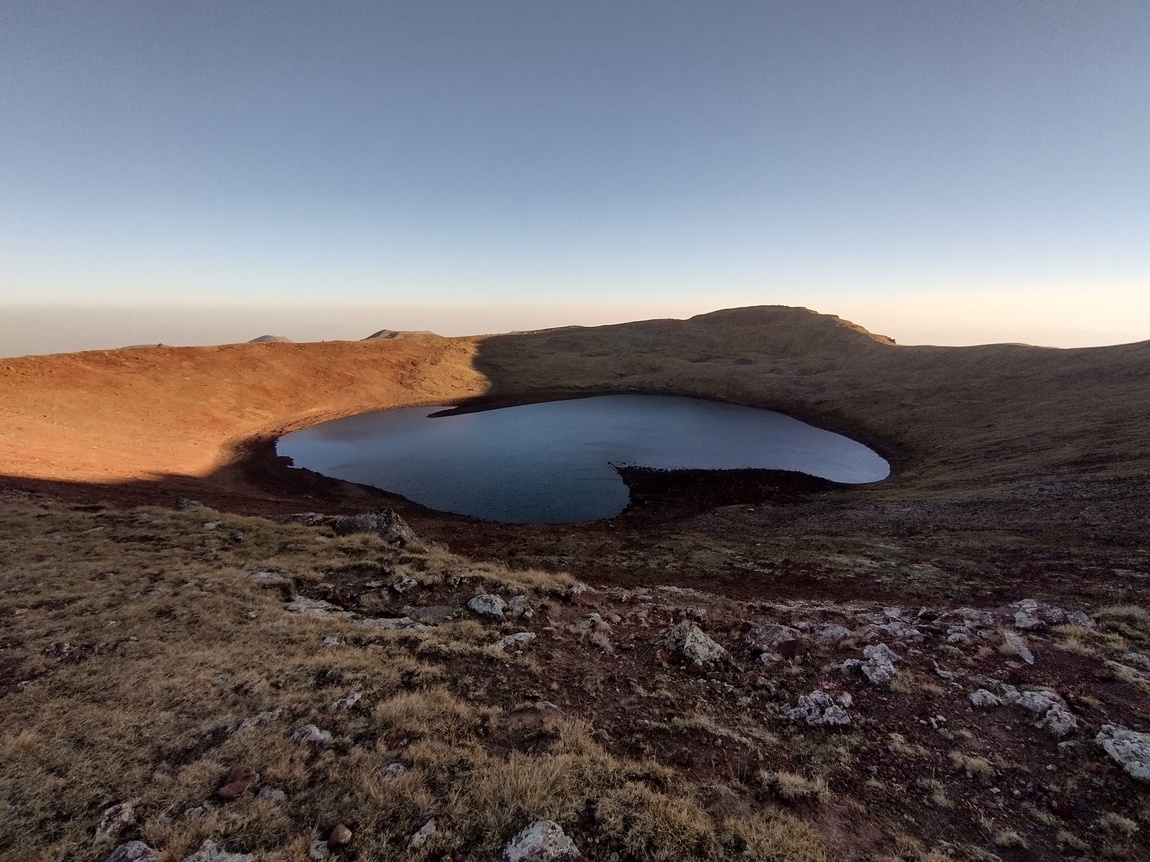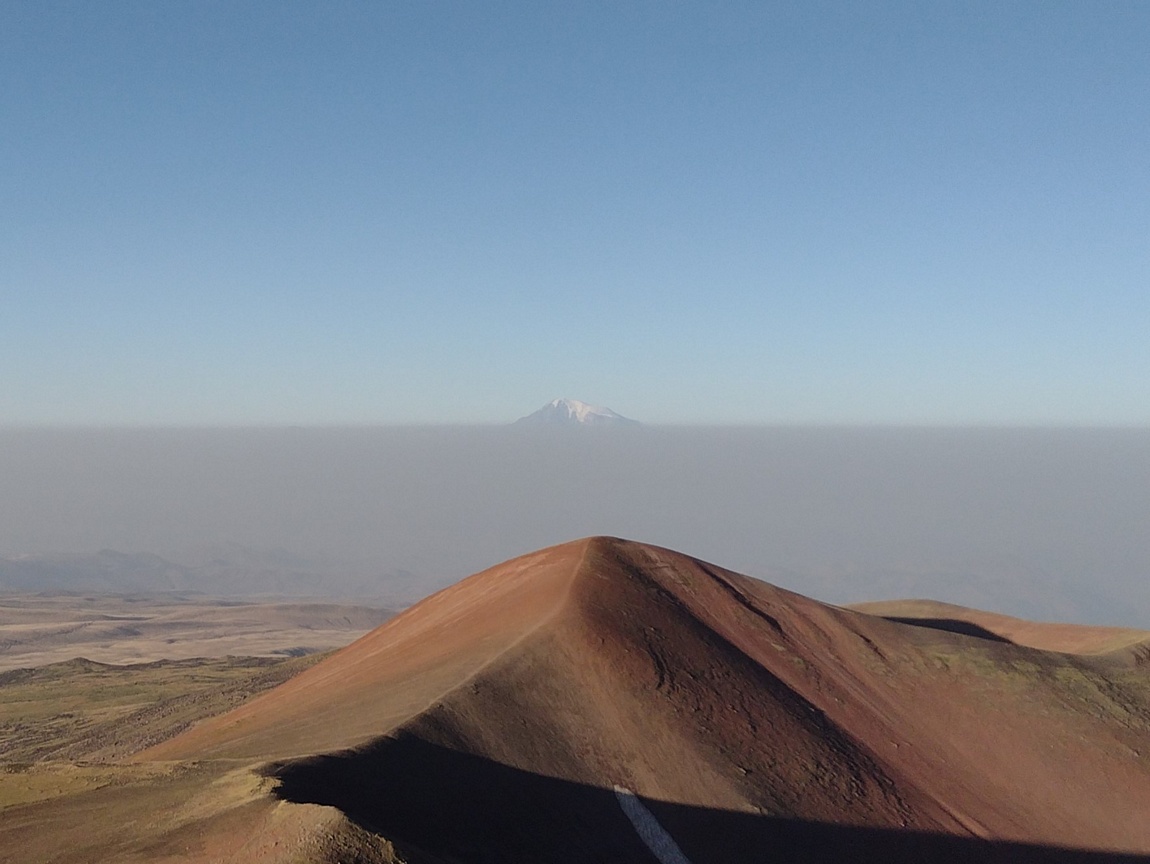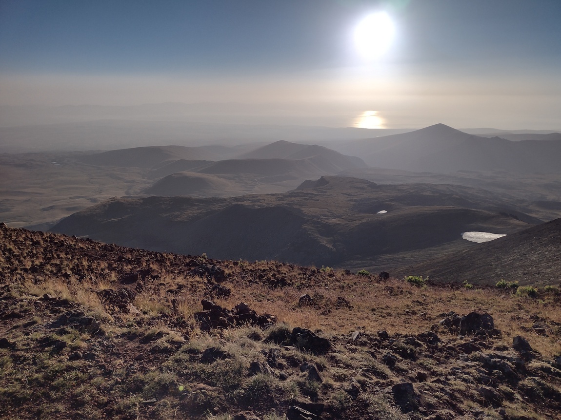 Erst die letzten etwa 250 Höhenmeter wurde der Anstieg zum Gipfel etwas steiler, ließ sich aber selbst mit unseren abgewetzten Turnschuhen noch immer recht komfortabel laufen. Und dann waren wir endlich oben und blickten in die Caldera des erloschenen Vulkans, in der sich inzwischen ein See gebildet hat. Der Anblick war schon hier traumhaft schön, aber noch waren wir nicht ganz oben und kletterten noch schnell die letzten 50 Meter zum Gipfelkreuz hinauf, womit Tilmann auf dem höchsten Gipfel (3.597 m) stand den er jemals erreicht hatte. Nun standen auch wir im gleißenden Licht der inzwischen schon ein gutes Stück in den Himmel aufgestiegenen Sonne. Gen Osten war der Anblick schon wunderschön aber als wir unseren Blick nun gen Westen richteten, bot sich uns ein noch spektakulärer Anblick. Geisterhaft schien über der Dunstglocke der vor ihm liegenden Ebene der majestätische Ararat (5.137 m) zu schweben.