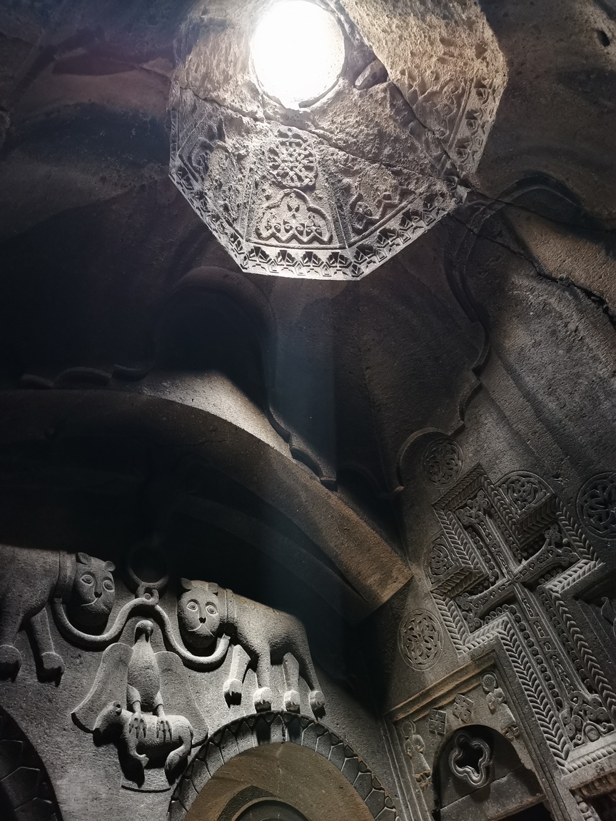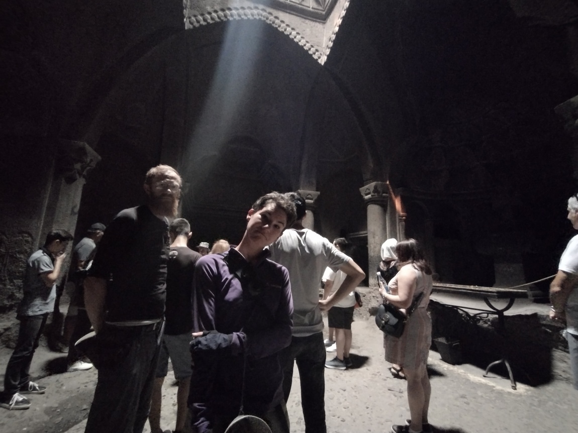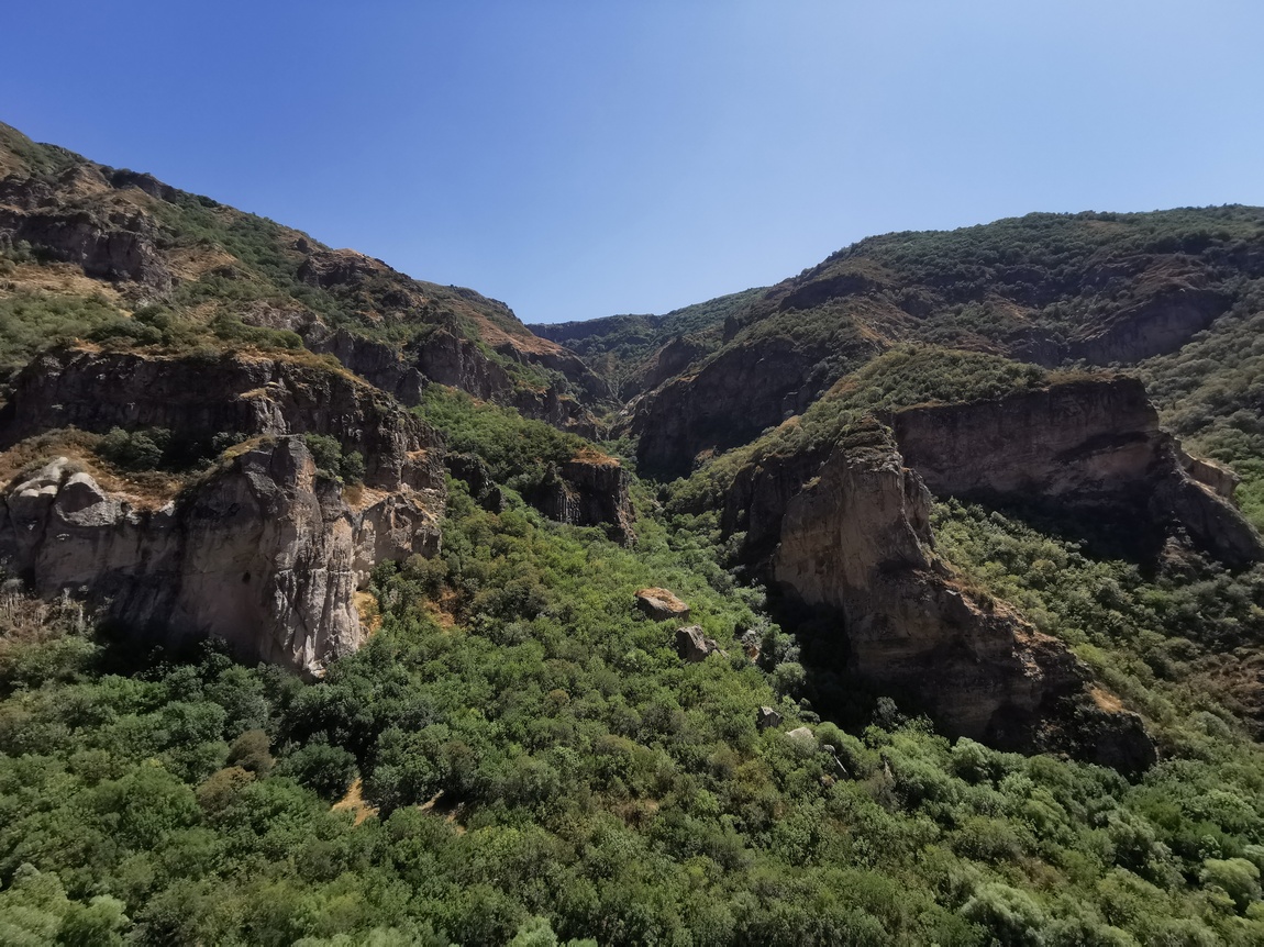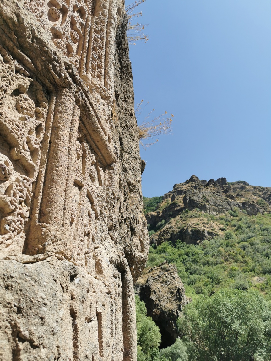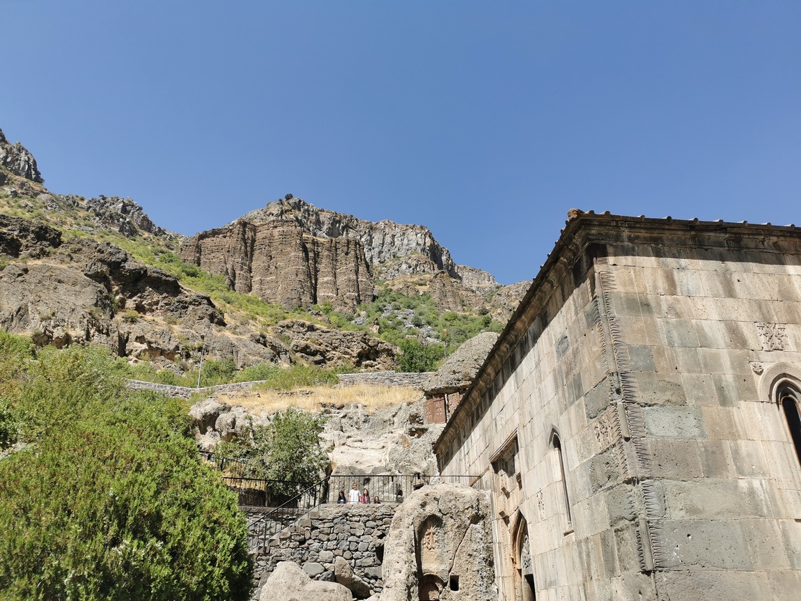 Nach drei Tagen im Camping-Himmel und dem ausgiebigen Austausch mit anderen Reisenden, rissen wir uns dann doch noch los, bevor wir ganz in das Urlaubsfeeling eingelullt waren und fuhren Richtung Yerevan, nicht ohne die Hauptsehenswürdigkeiten auf dem Weg mitzunehmen. Das Geghardavank-Kloster hatten wir schon vor 3 Tagen besucht nachdem wir der Begham-Hölle entronnen waren. In der Hitze des Nachmittags waren wir vor allem schockiert von den Besuchermassen, die ansonsten sicherlich mögliche andächtige Stimmung in der in Fels gehauenen Kirche aus dem 13. Jahrhundert, völlig unmöglich machte. Spektakulärer als das Kloster selbst, war abermals die umgebende Landschaft, nämlich ein eng eingeschnittenes Tal mit schroffen Felsen und kargem Bewuchs.