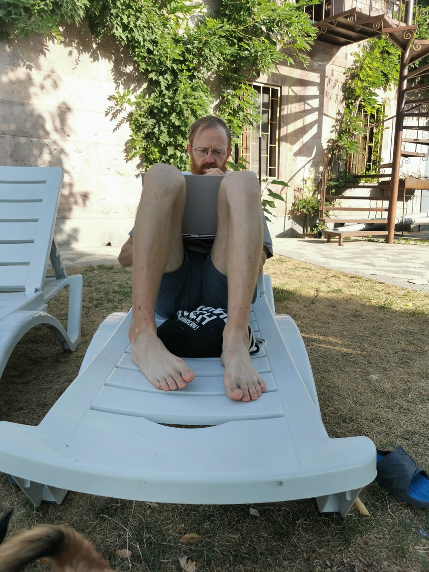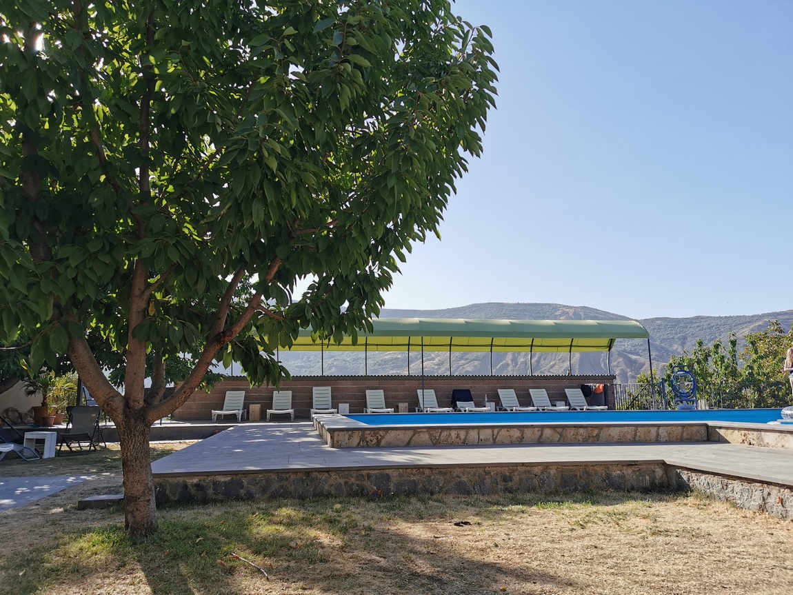 Aus den Lavaströmen der Hölle sprangen wir direkt in den Pool von Sandra. Die Niederländerin betreibt seit knapp 10 Jahren einen äußerst komfortablen Campingplatz in einem Dorf unterhalb des Geghardavank-Klosters. Nach drei Tagen im Halbnomaden-Land kam uns der Anblick reichlich absurd vor, als sich das Eisentor am Ende eines staubigen mit Autowracks gesäumten Dorfweg öffnete und dahinter ein von hauptsächlich deutschsprachigen Touristen umringter Pool zum Vorschein kam. Wir waren gleichzeitig etwas angewidert und ebenso angelockt. Unser Plan, den Platz erstmal nur anschauen zu wollen, scheiterte direkt. Sandra hatte uns sogleich in die Traveler Community aufgenommenen und wir bekamen bereits eine Führung durch die diversen vollausgestatteten Küchen und luxuriösen Sanitäreinrichtungen. Wir kapitulierten vor uns selbst. Zumindest eine Nacht wollten wir bleiben, um dann erfrischt weiter nach Yerevan zu radeln. Daraus wurden drei Nächte, zumal wir an unserem eigentlichen Ziel Yerevan ja ebenfalls ein wenig ausruhen wollten und dies genauso gut hier am Pool erledigen könnten. Da wir nun zum ersten mal auf unserer Reise wirklich großer Hitze ausgesetzt waren, war uns klar dass dieser Campingplatz zur Befriedigung dieses Bedürfnisses wesentlich besser geeignet war, als der Hexenkessel der armenischen Hauptstadt.