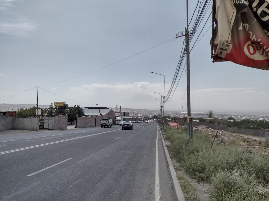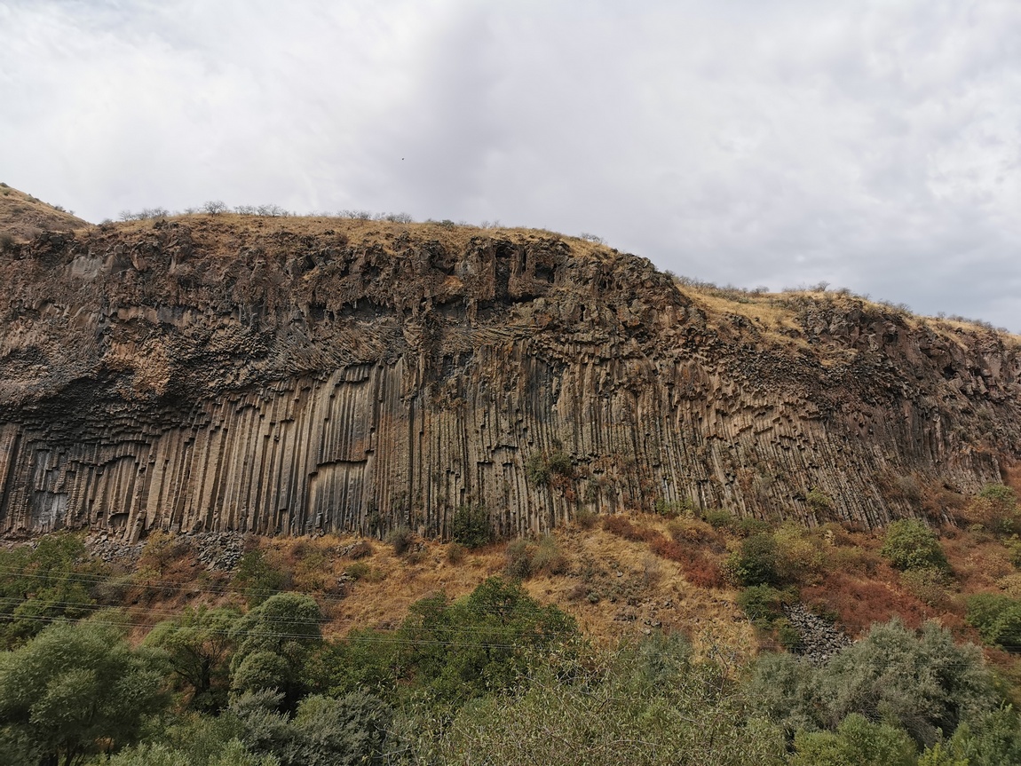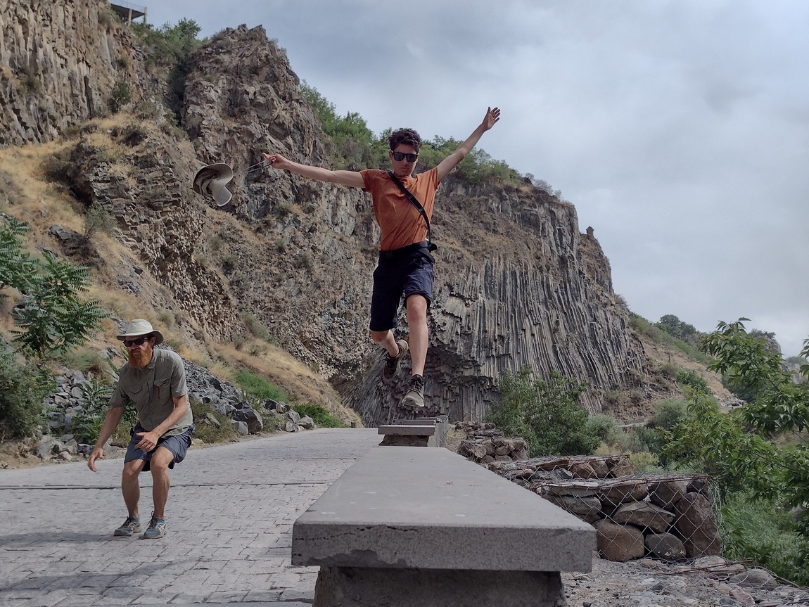 Viel spektakulärer als der Tempel, der vor allem aufgrund seiner Lage an einem Canyon beeindruckt, sind allerdings die Basalt-Felsen, die große Teile der Sole eben jenes Canyon bilden. Um eine Basaltsäule hätten wir diese nicht besucht, weil ihr Zugang nicht ausgeschildert und auch schwer zugänglich war. Froh, diese Felsen nun auch von nahem gesehen zu haben, wollten wir jetzt in die armenische Hauptstadt. Auf dem Weg dorthin konnten wir in der Ferne den Ararat durch eine dichte Dunstschicht sehen, der Fotolinse blieb dies aber verborgen.