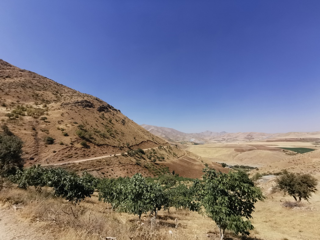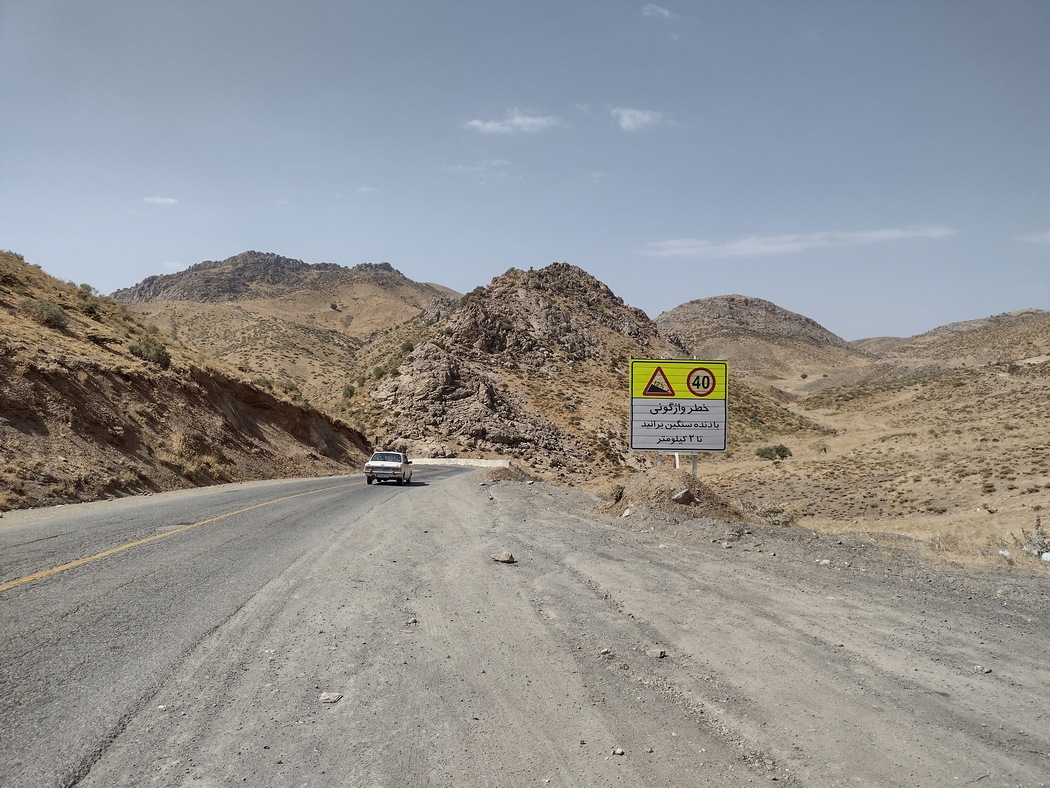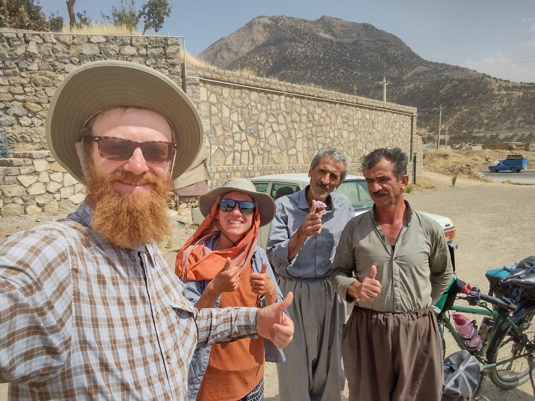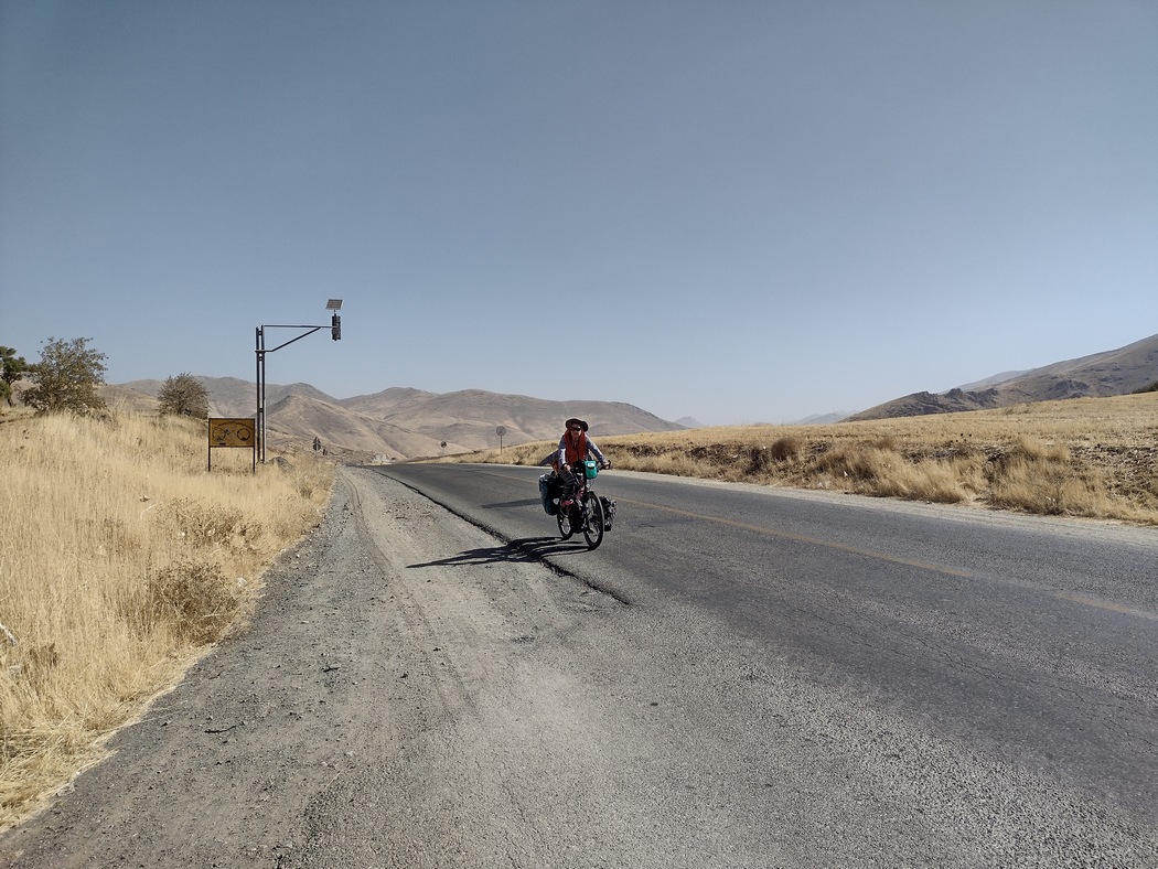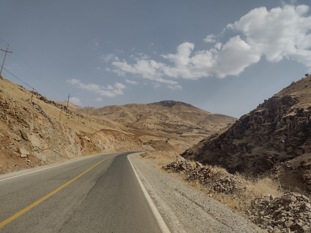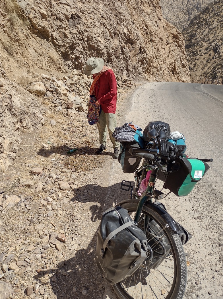 Da wir von anderen Radreisenden hörten, dass die kurdischen Gebiete im Iran besonders schön seien, planten wir unsere Route durch diese bergige Region. Nach mehreren Tagen ätzendem Verkehrs und öder Landschaft waren wir froh, als südlich von Saqqez der Verkehr weniger und die Umgebung etwas interessanter wurde. Trotzdem wollte das Glück noch nicht wieder in unseren Fahrradtaschen einziehen. Wir waren noch immer entnervt von den vergangenen Tagen und mussten am Morgen des 6. September schon wieder den nächsten Platten flicken, diesmal Julias Vorderreifen. Dies erledigten wir mitten in der Sonne neben der Polizei, die an einer Haltebucht eine allgemeine Verkehrskontrolle durchführte. Glücklicherweise hielt sie das davon ab, sich in unsere Angelegenheiten einzumischen. Lediglich gegenüber dem Lkw-Fahrer mussten wir dreimal (so wie es Sitte ist, wenn man etwas wirklich nicht möchte und nicht nur aus Höflichkeit ablehnt) den angeboten Kompressor mit Autoventil ablehnen.