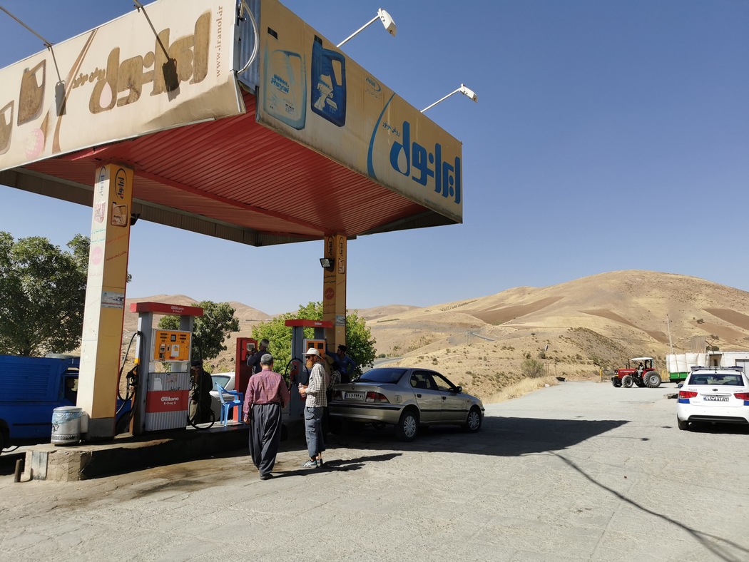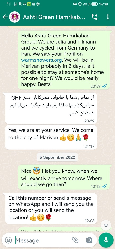 Mit unserer Hygiene sah es inzwischen schlecht aus: Wir hatten uns in den vergangenen Tagen nicht mehr gut waschen können, da wir immer irgendwo nächtigen mussten, wo Beobachter nicht weit waren oder wir unsere Wasservorräte nicht hatten auffüllen können. Die Luft war staubig und trocken, wir hatten viel geschwitzt in der Hitze und kämpften uns inzwischen wieder regelmäßig Berge hinauf. So sehnten wir uns nach einer Duschen und wollten unsere Kleider waschen. Also beschlossen wir seit Langem einmal wieder eine warmshower zu nutzen. Wir fanden ein Angebot in Marivan von einem “cyclist network”, wie sie sich selbst nannten. Auf dem Weg nach Marivan fanden wir mal wieder keinen Rastplatz, der uns etwas Schatten spenden konnte, deshalb hielten wir kurz vor Marivan an einem großen unvollendeten Tankstellenkomplex, um unserem Host mitzuteilen, dass wir bald da wären. Den Standort hatten wir bereits am Vortag per WhatsApp erhalten, es konnte also kaum etwas schief gehen. Des Unterhaltungswertes wegen, hier der Chatverlauf:
