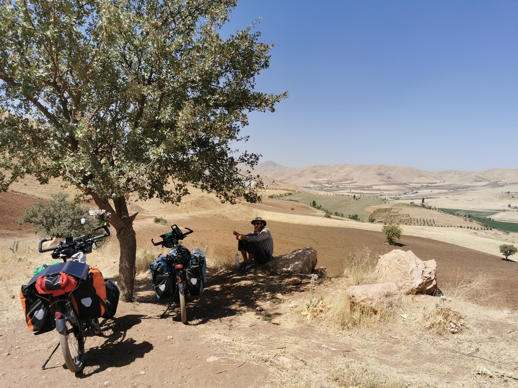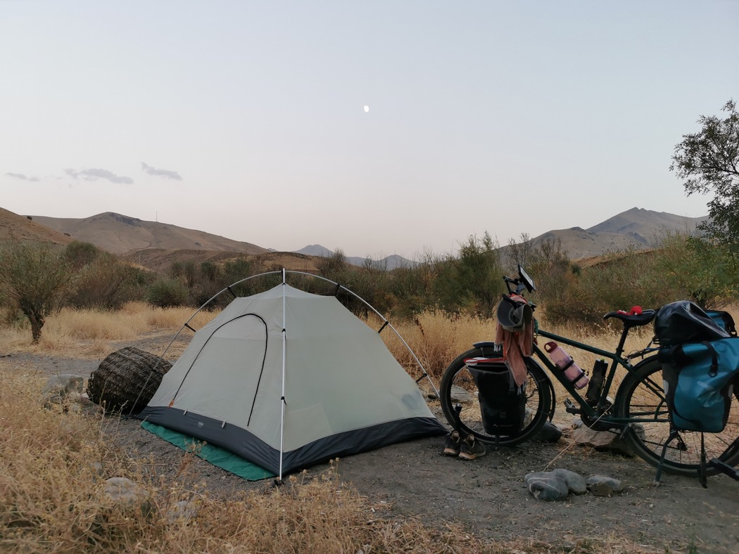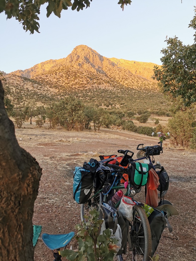 Die alten Dörfer hier waren todesmutig in den Hang gebaut. Uns stockte der Atem, als uns nach den letzten Kuppe, die wahrscheinlich serpentinenreichste Abfahrt unserer ganzen bisherigen Reise entgegenlachte. Aufgrund der zahlreichen Kurven konnte Tilmann diese nicht in gewohnter halsbrecherischer Marnier herunterbrettern. Etwas schwierig gestaltet sich in dieser Gegend das Finden von geeigneten Rast- und Schlafplätzen, da die steilen Hänge keinen Platz für ein Zelt ließen. Wir entschlossen uns schließlich, noch zum Fluß unten im Tal zu fahren und fanden dort tatsächlich ein hübsches Ufer vor, das allerdings bereits von einigen Iranern bevölkert wurde, die mit ihren Autos ans Ufer gefahren waren, dort Angelten, ein Lagerfeuer entzündeten und ihre typisch iranischen mannshohen Wurfzelte aufgestellt hatten. Wir begannen uns damit abzufinden, dass man in diesem Land nie wirklich alleine ist. Wie uns ein Iraner, den wir bereits in Yerevan kennengelernt hatten via Instagram schrieb, seien die Iraner große Fans von „Outdoor-Activities“, diese beschränken sich aber auf die vorgenannten Aktivitäten. Wandernde oder Radfahrende Iraner hatten wir bei unserem gesamten Aufenthalt im Land kaum erblicken können, weshalb man berichtigend sagen muss, die Iraner sind große Fans von „Auto-Activities“. Die sogenannten Outdoor-Fans bilden an Donnerstagen und Freitagen lange Schlangen aus weißen Autos, fahren 300 km „ins Grüne“, um sich dort neben ihr Auto an den Straßenrand zu setzen uns zu picknicken, sportliche Aktivitäten sind dabei nicht vorgesehen.