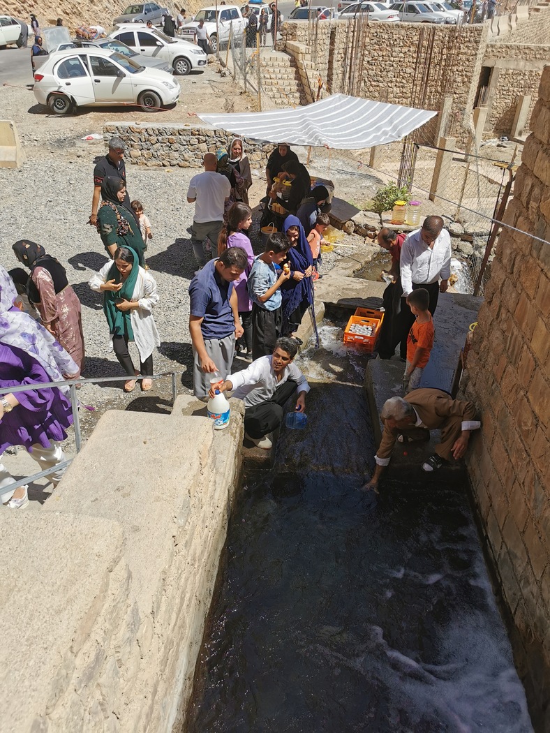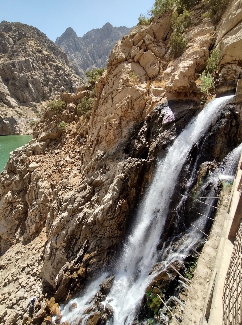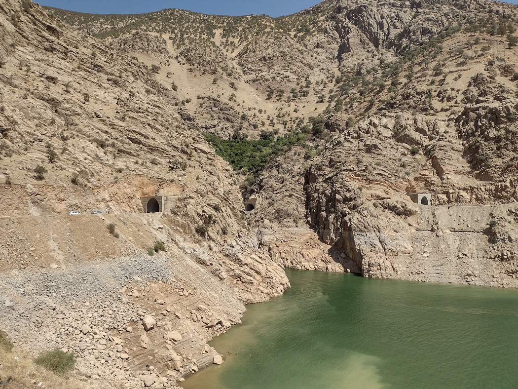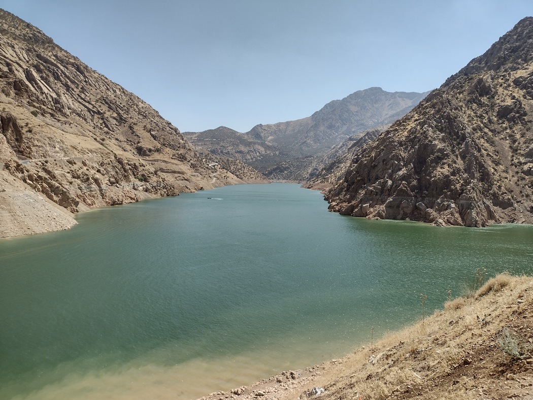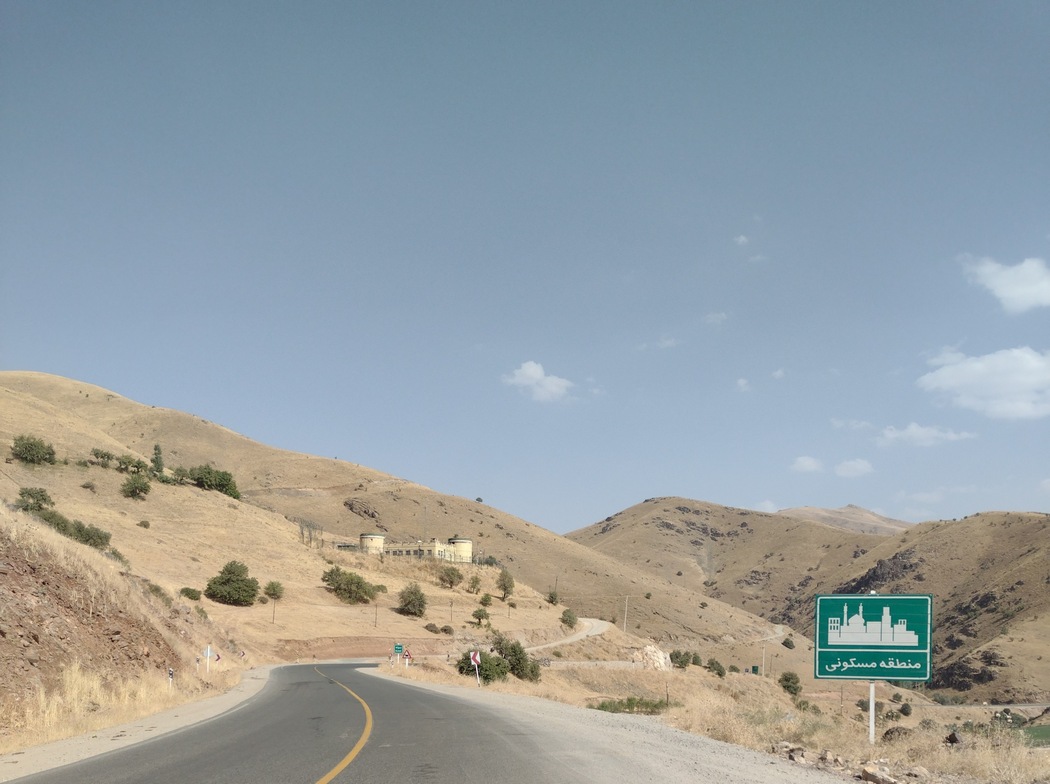 Am Nachmittag erreichten wir den Sirwan-Stausee, wo wir irgendwo in Ruhe und im Schatten rasten wollten, aber es war aussichtslos. Auch das aller schäbigste Fleckchen Haltebucht, das vielleicht gerade noch von ein paar Mülltonnen beschattet wurd war besetzt. Die Kurden bzw. alle Iraner sind bei der Wahl ihrer Ruheplätze wirklich nicht zimperlich. Wir sahen sie später noch oft im Straßengraben neben der Autobahn, auf Verkehrsinseln oder anderen unmöglichen Orten picknicken und schlafen. An einem Krämerladen im Örtchen Hajij, das an diesem Freitag offenbar ununterbrochen von Lautsprecherdurchsagen mit vermutlich religiösen Inhalten bedröhnt wurde, füllten wir unseren Wassersack, da wir von Bergen, Hitze, Verkehr und Menschen inzwischen ziemlich erschöpft bald zur Ruhe kommen wollten.