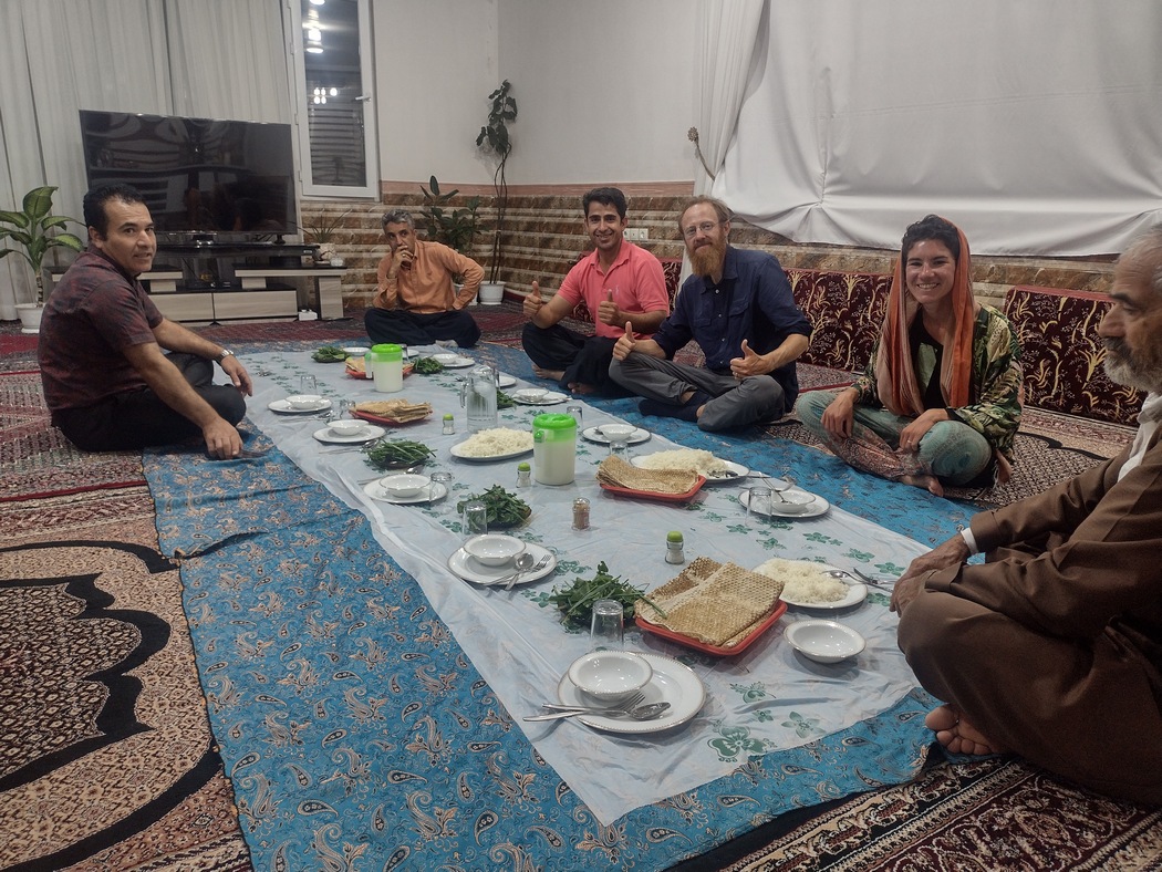 Die Hoffnung bald schlafen zu können verflog. Wir wurden auf die an der Wand aufgereihten Polstermöbel platziert während die ganzen Herren in der anderen Ecke des Raumes auf dem Boden Platz nahmen. Die Damen waren in der offenen Küche mit Teppichboden damit beschäftigt Essen für die ca. 15 anwesenden Personen zuzubereiten. Als dieses fertig war, wurde ein langes Plastiktuch auf dem Boden ausgebreitet und alle hockten sich mit verschränkten Beinen, um die Decke, bis auf die Frauen, die sich um alles gekümmert hatten, sie mussten in der Küche essen. Dies konnten wir übrigens nur in dieser Familie beobachten und hängt vermutlich damit zusammen, dass die Kurden im Iran sehr religiös und konservativ sind.