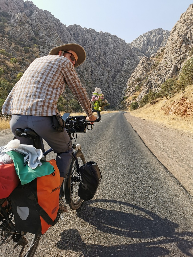 Während eines weiteren schweißtreibenden Anstiegs hielt ein Auto kurz vor Tilmann, dem eine Gruppe junger Kurdinnen und Kurden entsprang. Sogleich begannen sie auf der Straße mit ineinander gehackten Armen zu tanzen und dabei zu singen und diese Darbietung war offenkundig exklusiv für Tilmann inszeniert worden. Dieser wollte jedoch nicht schon wieder anhalten, die kleine Nummernrevue aber immerhin mit einem High-Five honorieren. Der Adressat, der im Vorbeifahren ausgestreckten Hand zog die Seine aber im entscheidenden Moment weg und so fragten wir uns nicht zum ersten Mal, ob nicht einige der an uns gerichteten Kontaktaufnahmen auch mit einem kleineren oder größeren Anteil Hohn versehen waren.
